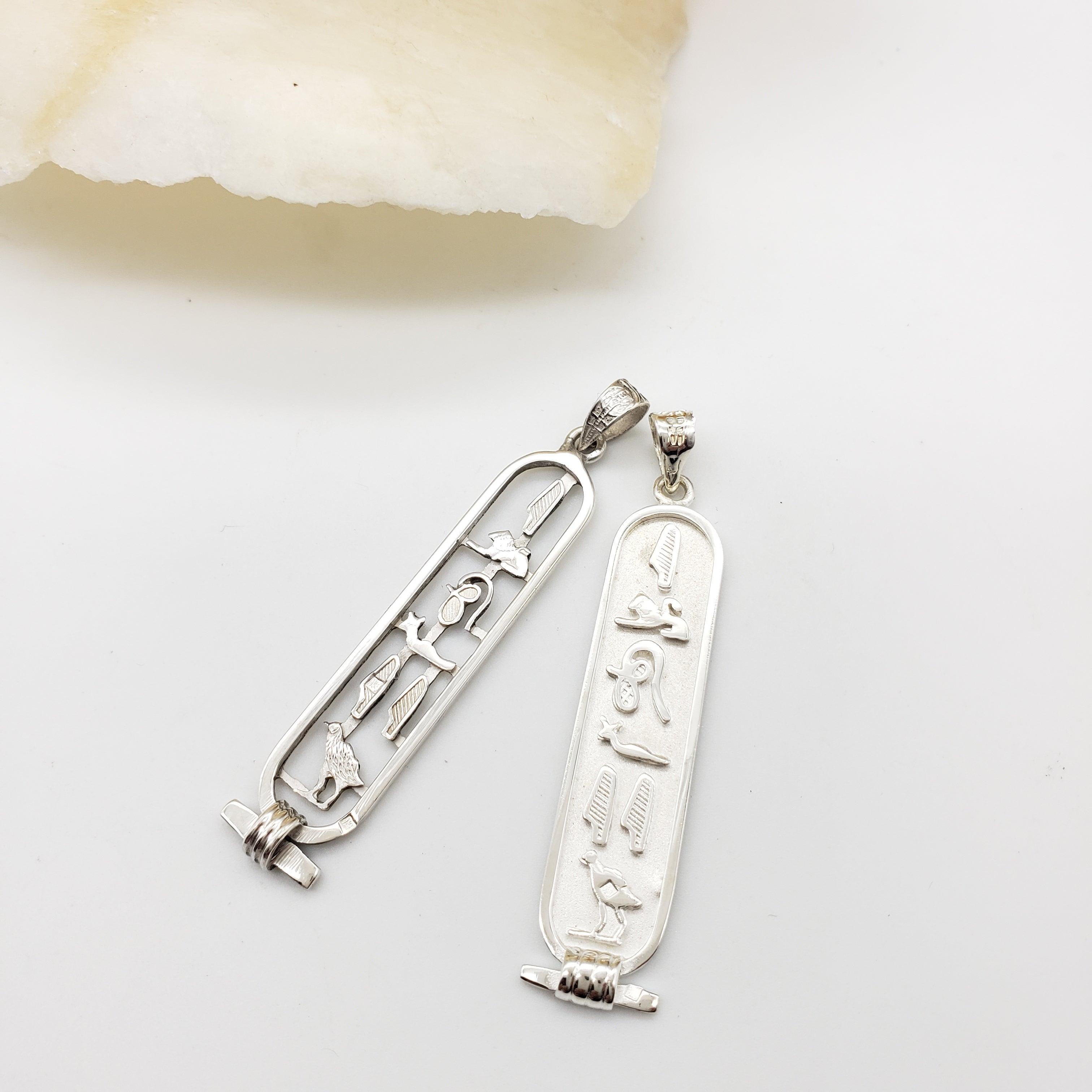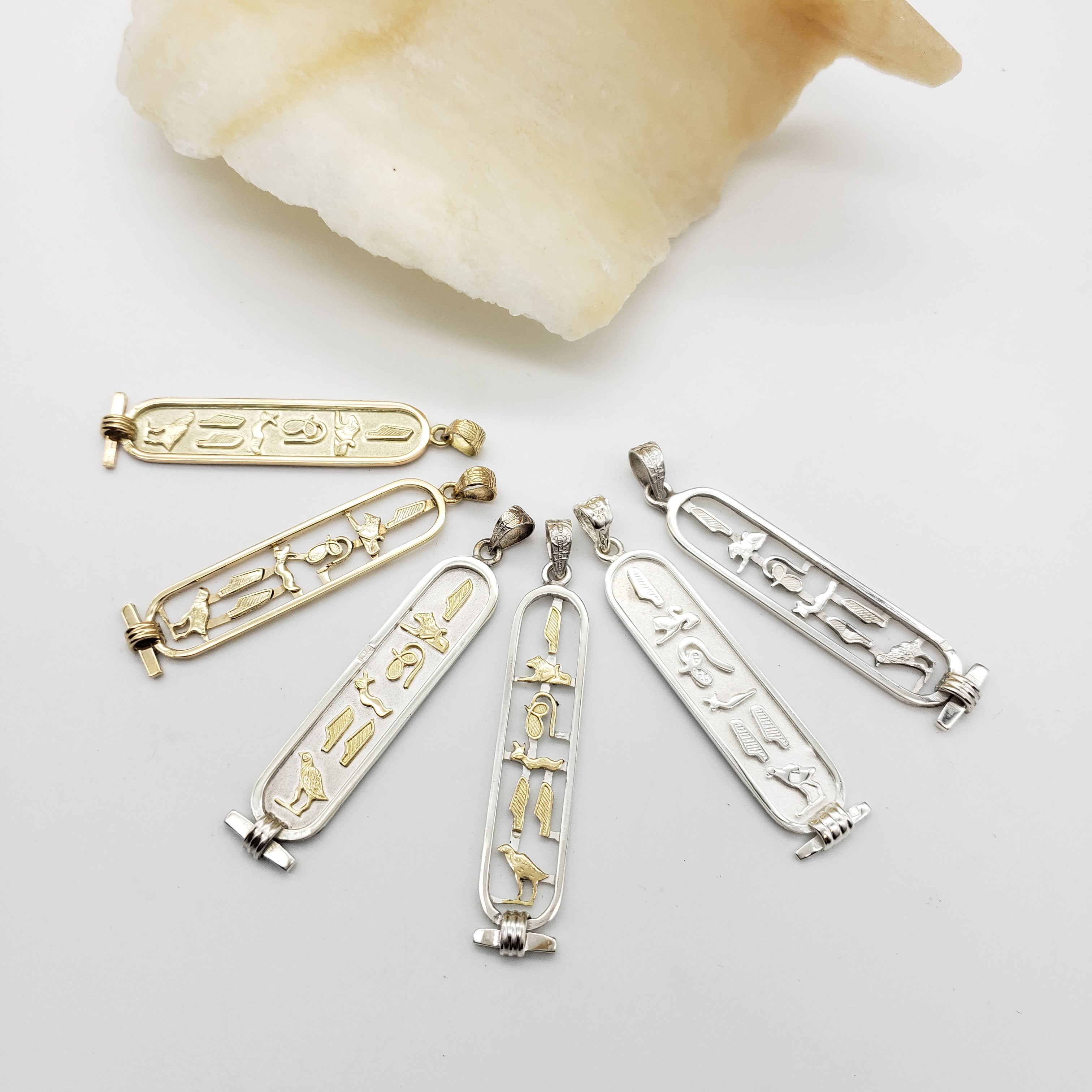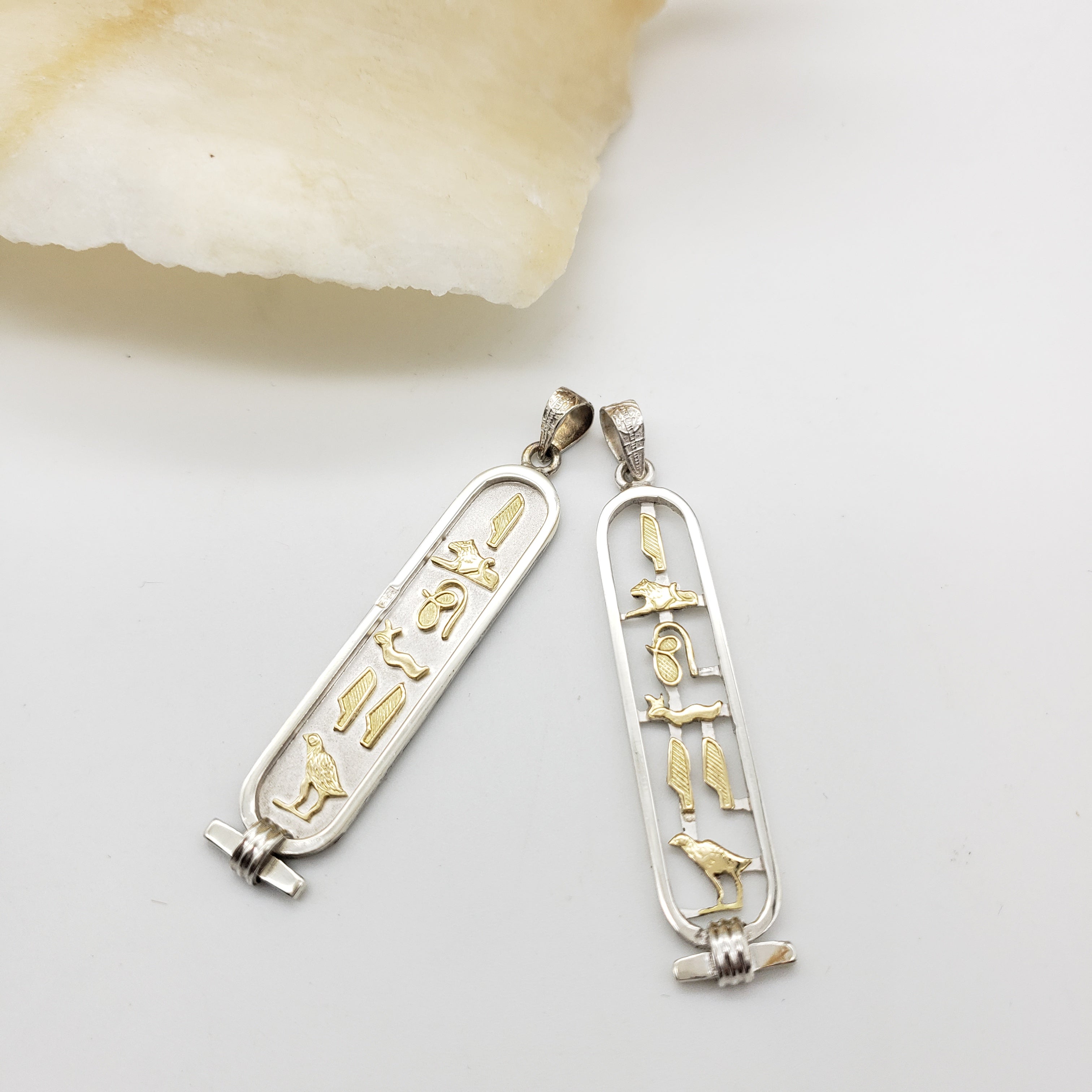 Handmade in the ancient bazaar of Khan el Khalili, in the heart of old Cairo. Choose from two styles, open or solid, in Sterling Silver or 18k Gold. You may also order Sterling Silver with 18k Gold hieroglyphs in either the solid or open style pendant. The silver pendants will ship with an 18" sterling silver chain, and the gold chains are sold separately.