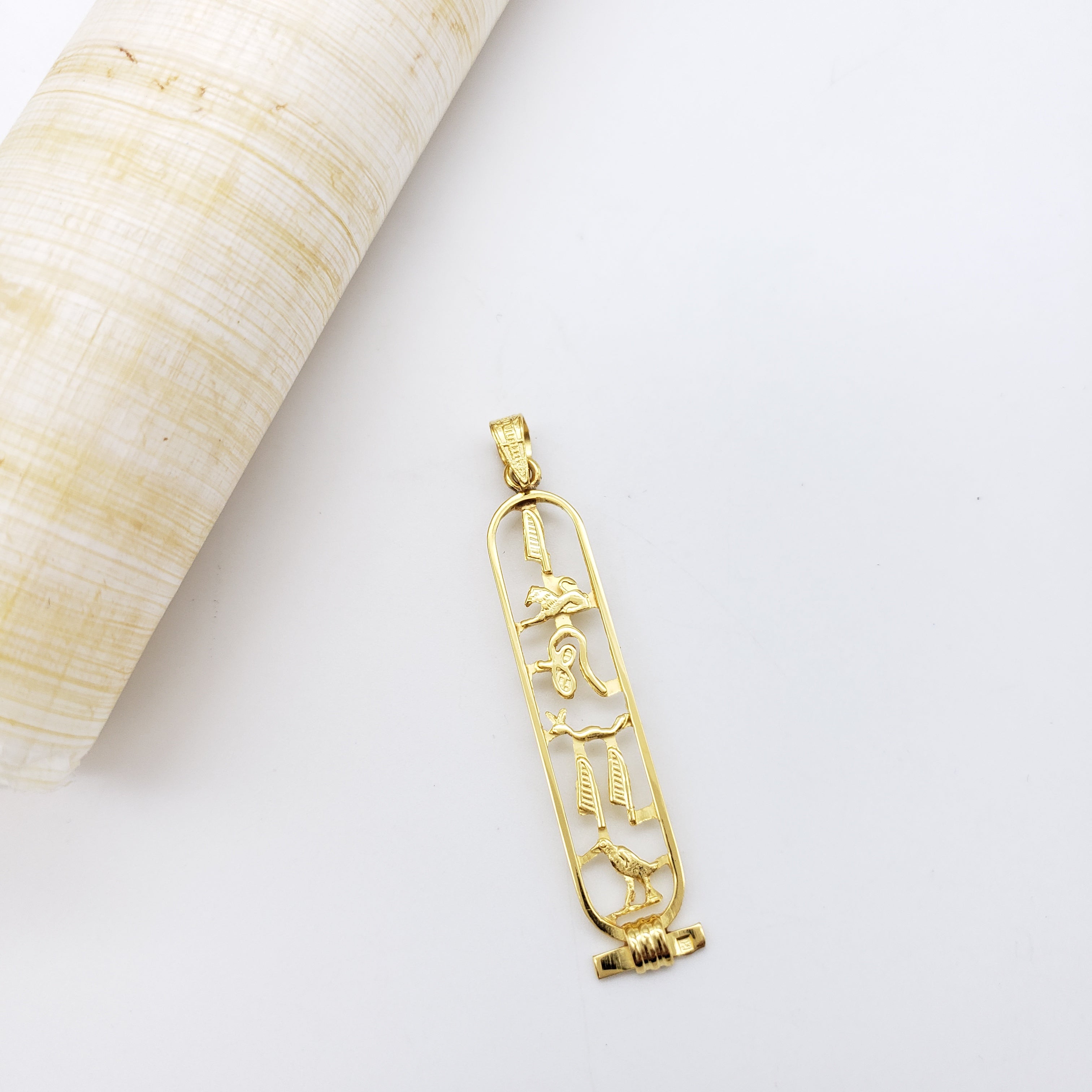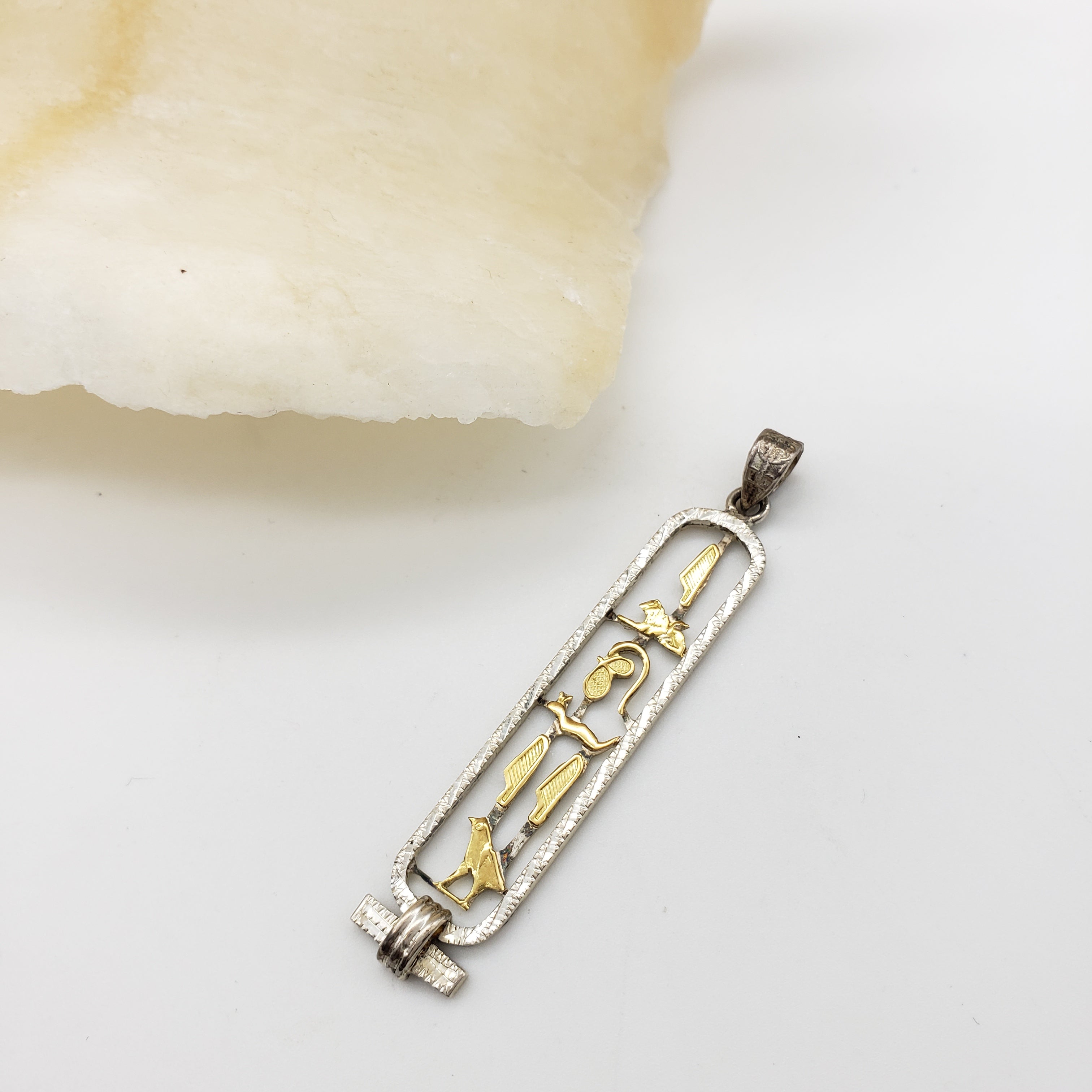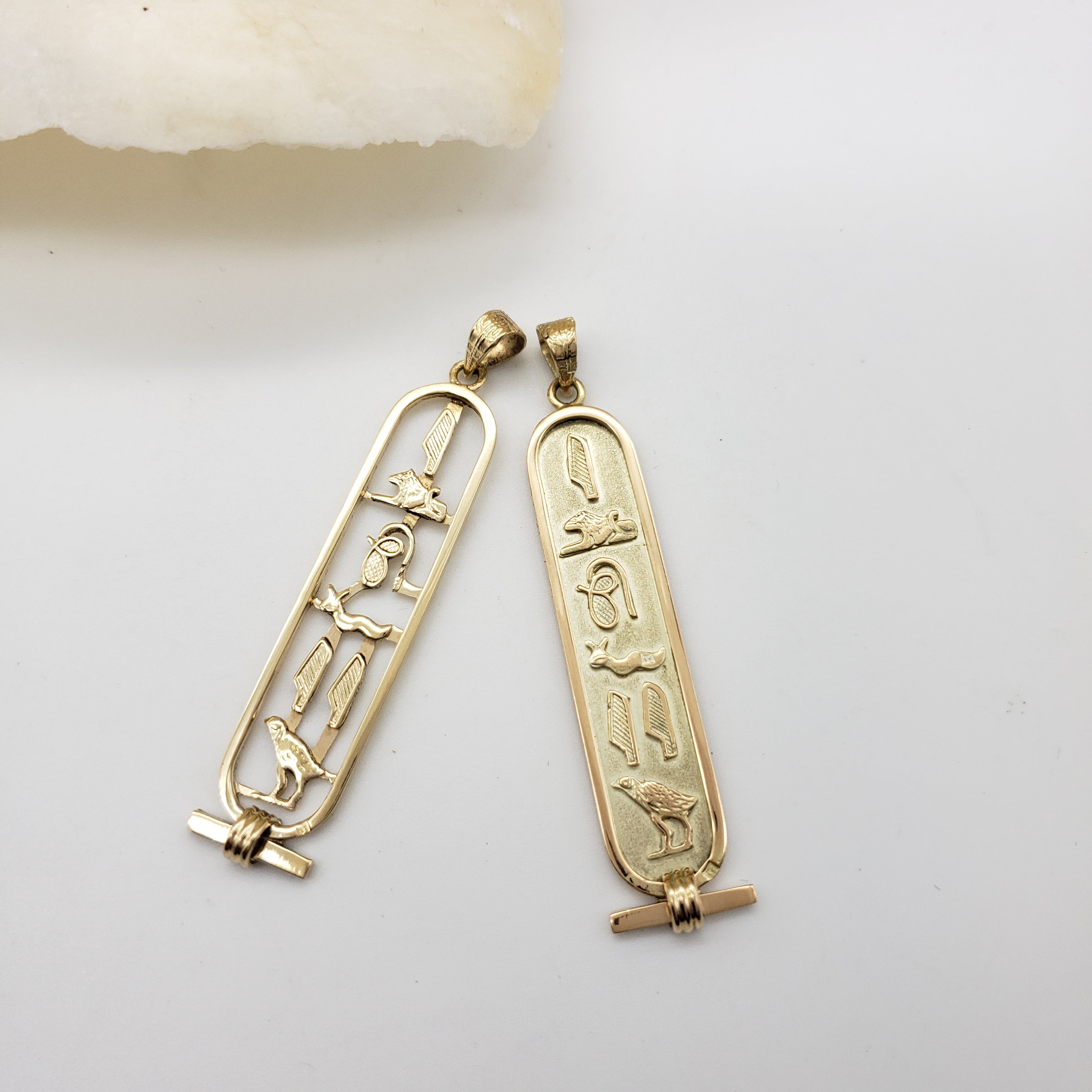 Handmade in the ancient bazaar of Khan el Khalili, in the heart of old Cairo. Choose from two styles, open or solid, in Sterling Silver or 18k Gold. You may also order Sterling Silver with 18k Gold hieroglyphs in either the solid or open style pendant. The silver pendants will ship with an 18" sterling silver chain, and the gold chains are sold separately.