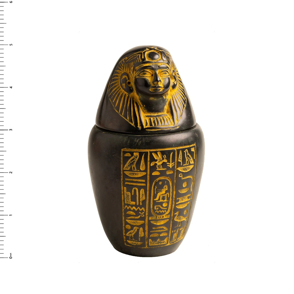 Dieser ägyptische Kanopenkrug zeigt die menschenköpfige Göttin Imsety. Der Deckel ist abnehmbar. Die Statue ist 12,7 cm hoch und aus Polymer gefertigt. Sie ist mit Hieroglyphen verziert. Der Krug hat einen Durchmesser von 6,35 cm. Hergestellt in Ägypten! Dieses Sammlerstück wird in einer Schachtel mit Hieroglyphenmotiven geliefert – ideal zum Verschenken!