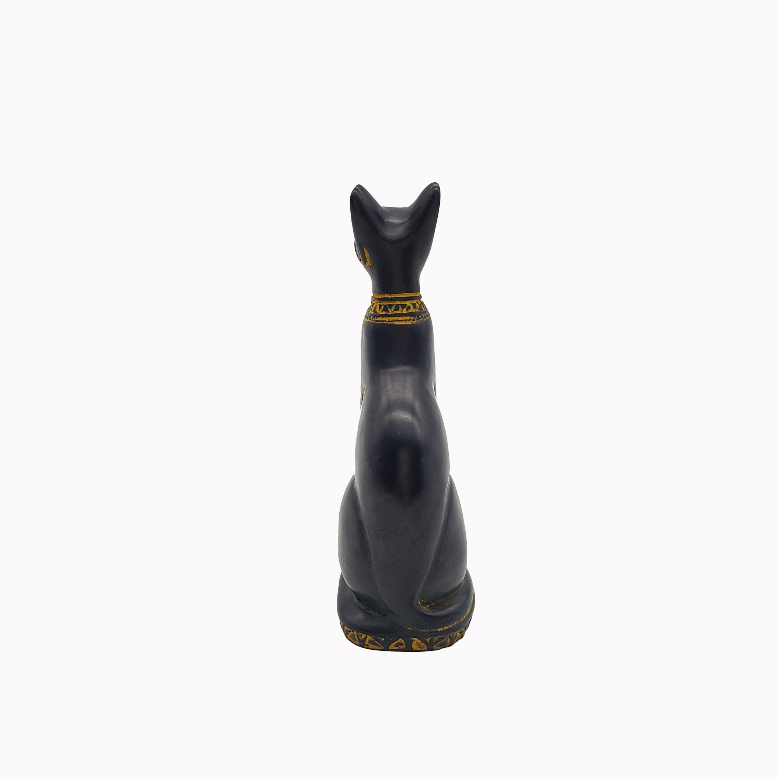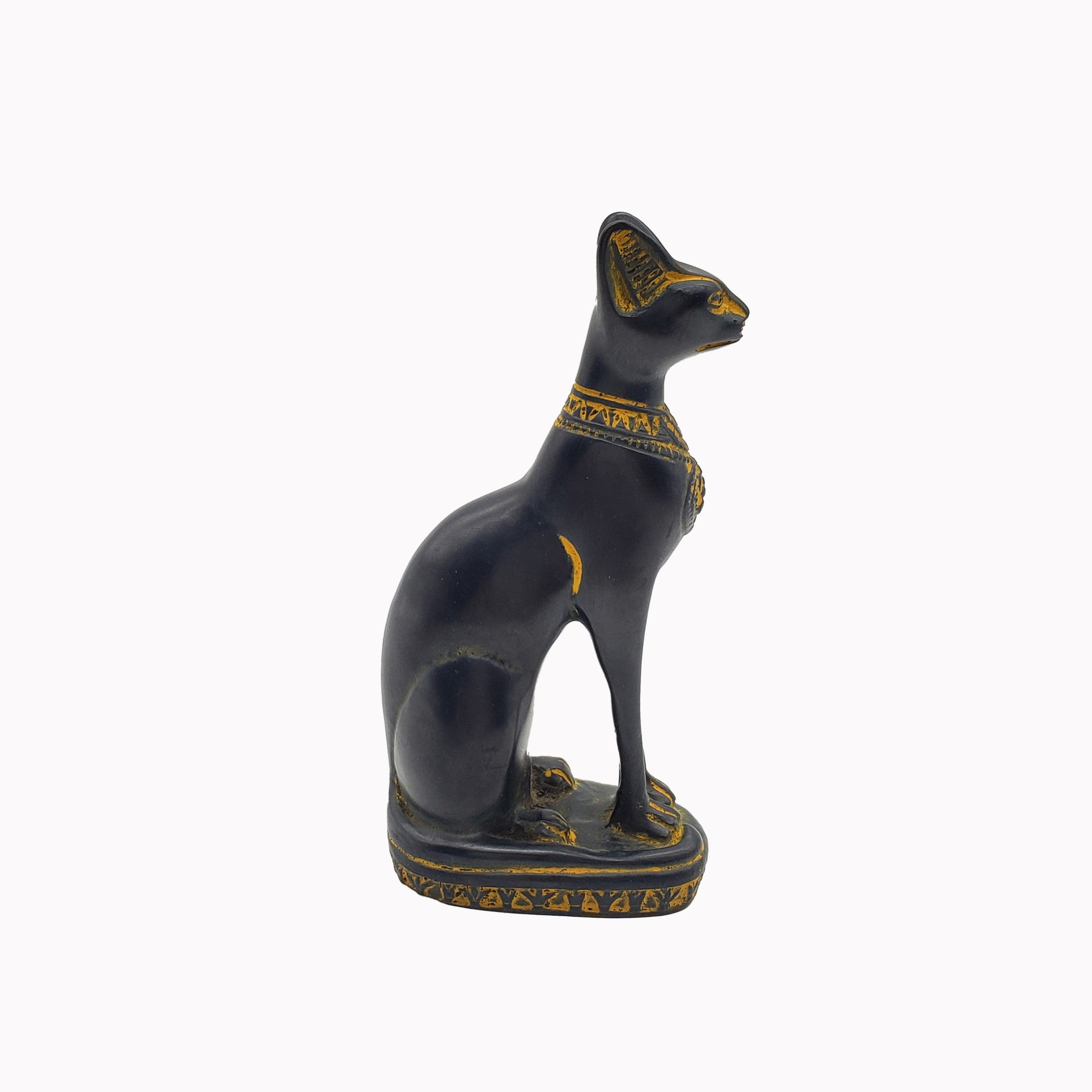Diese Statue zeigt das Abbild der ägyptischen Katzengöttin Bastet. Sie wurde von Hand aus Polymer gefertigt und mit einer handbemalten Oberfläche versehen. Gelbes Pulver wurde hinzugefügt, um Details hervorzuheben. Die Katzengöttin sitzt auf einem Sockel mit einem Lotusblumen- oder Hieroglyphenmuster. Hergestellt in Luxor, Ägypten!