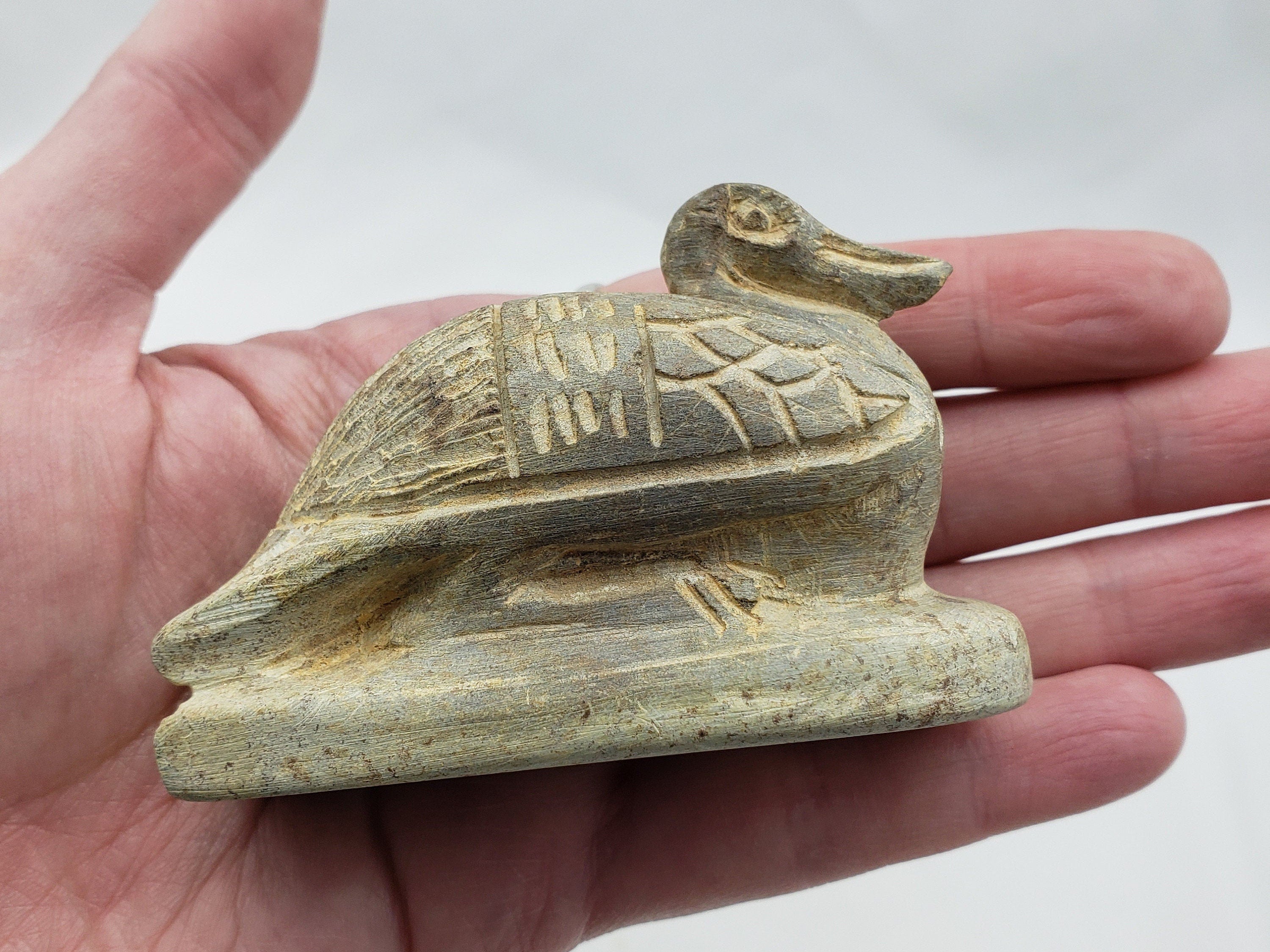 Diese handgeschnitzte ägyptische Entenstatue besticht durch ihre wunderschönen Details. Ein seltener Fund: Der Vogel wurde in den 1980er Jahren in Luxor, Ägypten, handgefertigt.