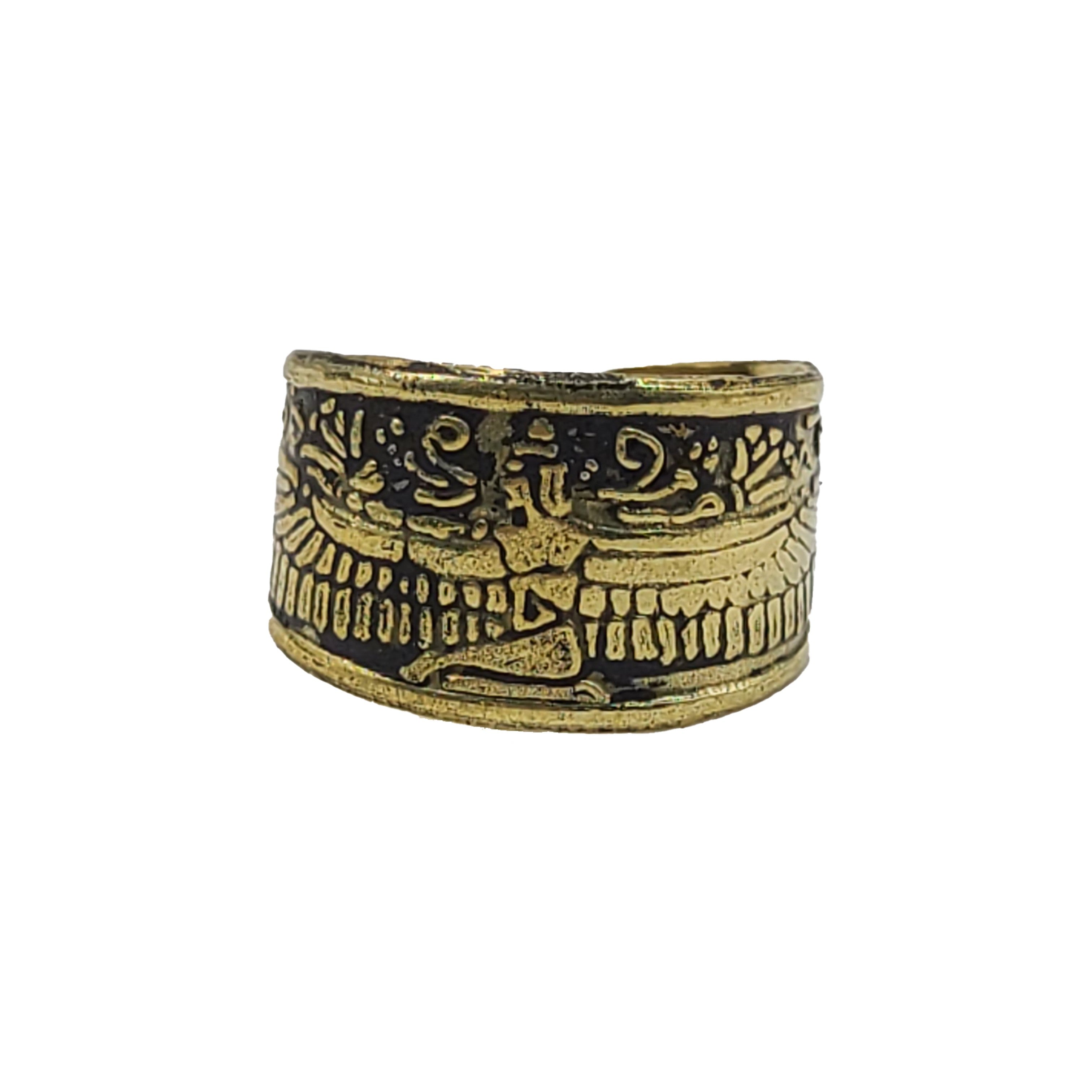 Dieser Ring aus oxidiertem Messing zeigt die geflügelte ägyptische Göttin Isis. Hergestellt in Kairo, Ägypten! Der Ring ist aus Messing gefertigt und größenverstellbar.