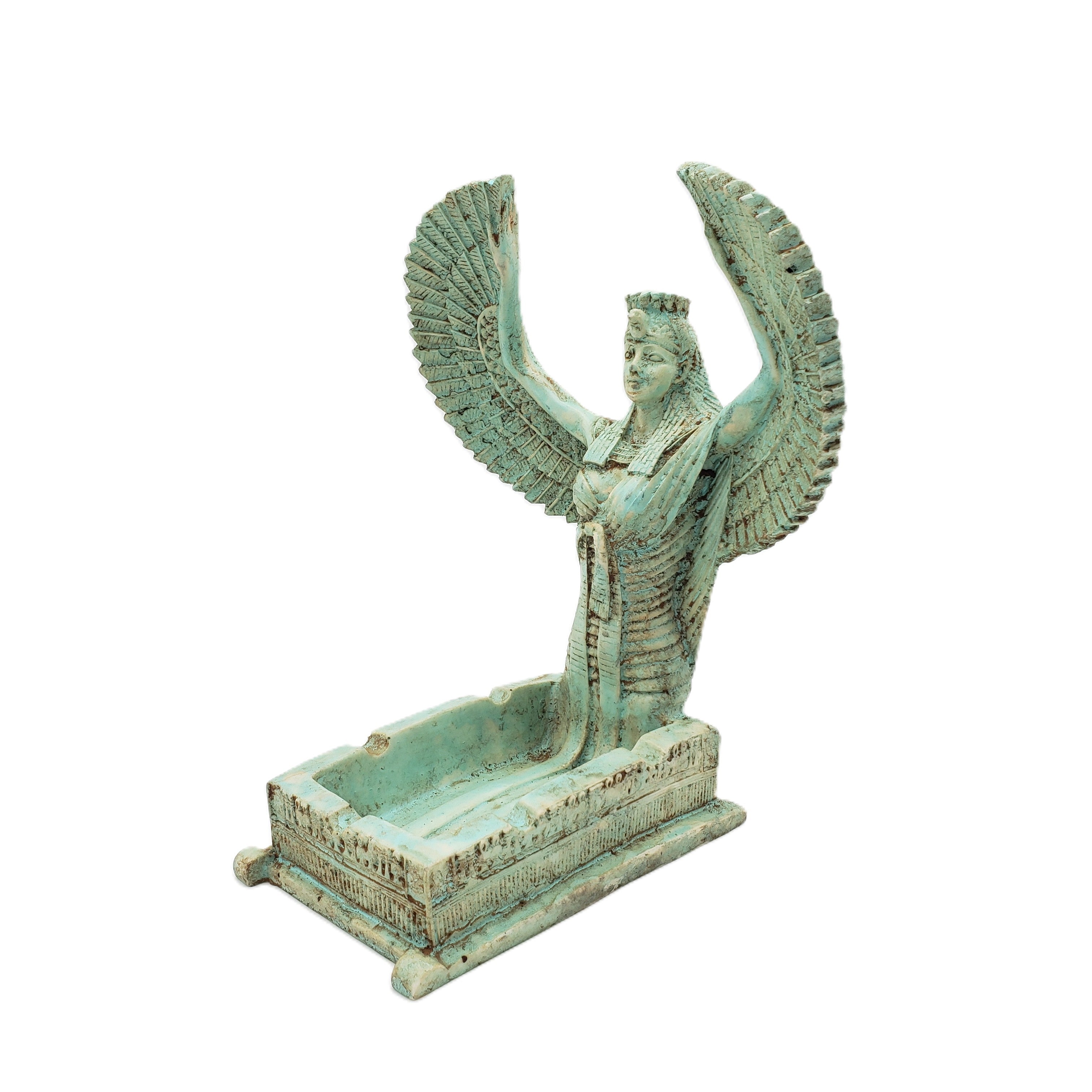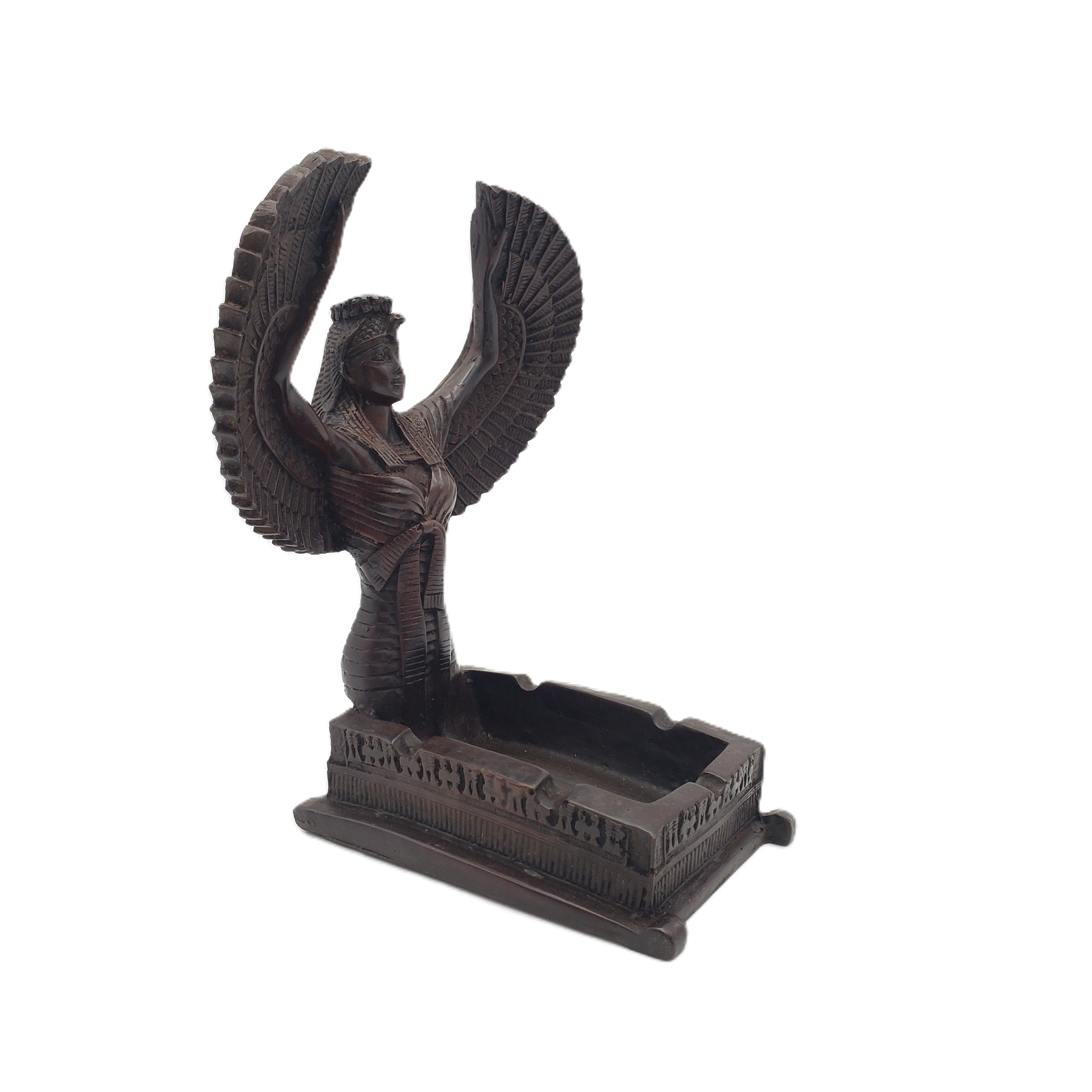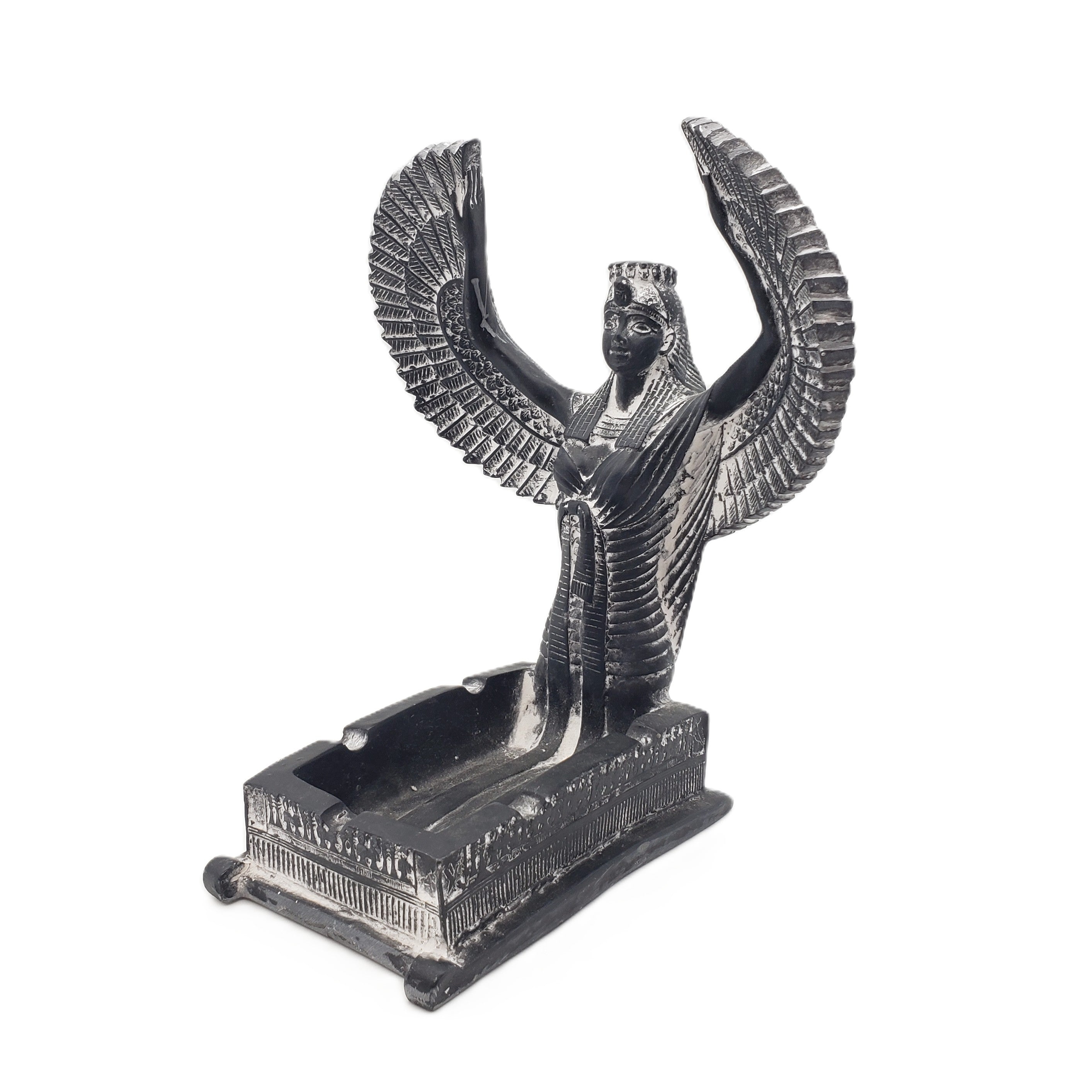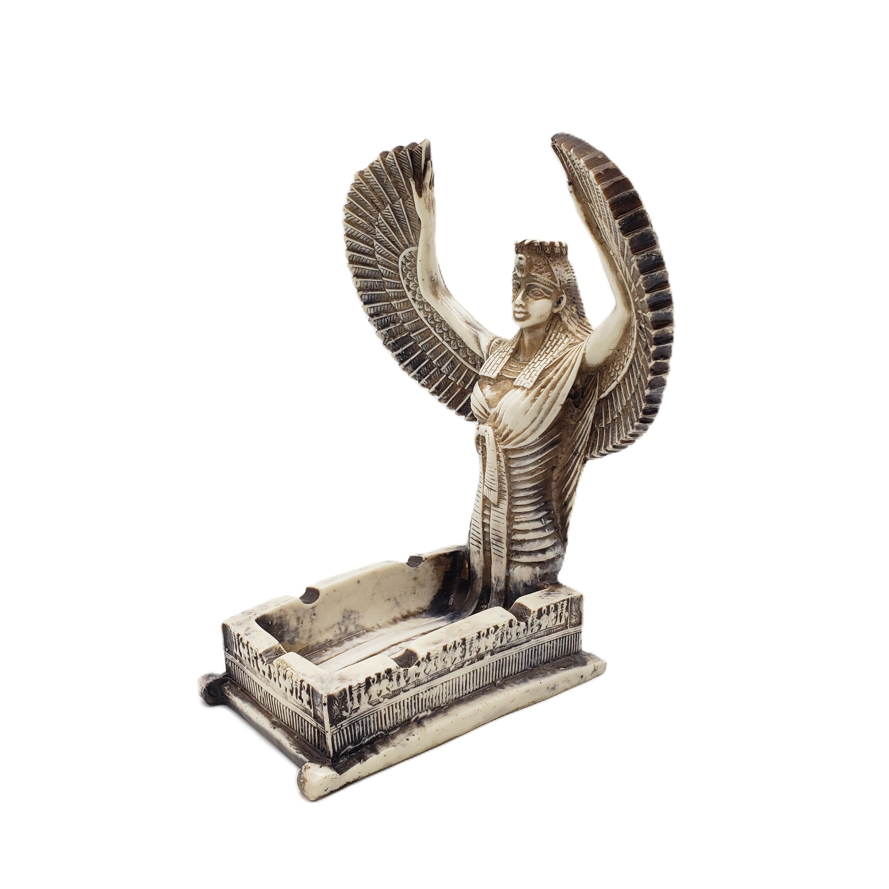 Diese ägyptische Göttinnenstatue zeigt eine geflügelte Isis. Vor ihr steht ein Tablett, das vermutlich als Aschenbecher diente. Wir denken, es eignet sich auch perfekt als Räuchergefäß oder zur Aufbewahrung besonderer Schätze. Diese robuste Statue wurde von uns entworfen und in Ägypten gefertigt. Die 20 cm hohe Statue hat eine Flügelspannweite von 18 cm. Sie besteht aus Polymer und wurde handbemalt. Die Statue wird in einer Schachtel mit Hieroglyphenmotiven geliefert.