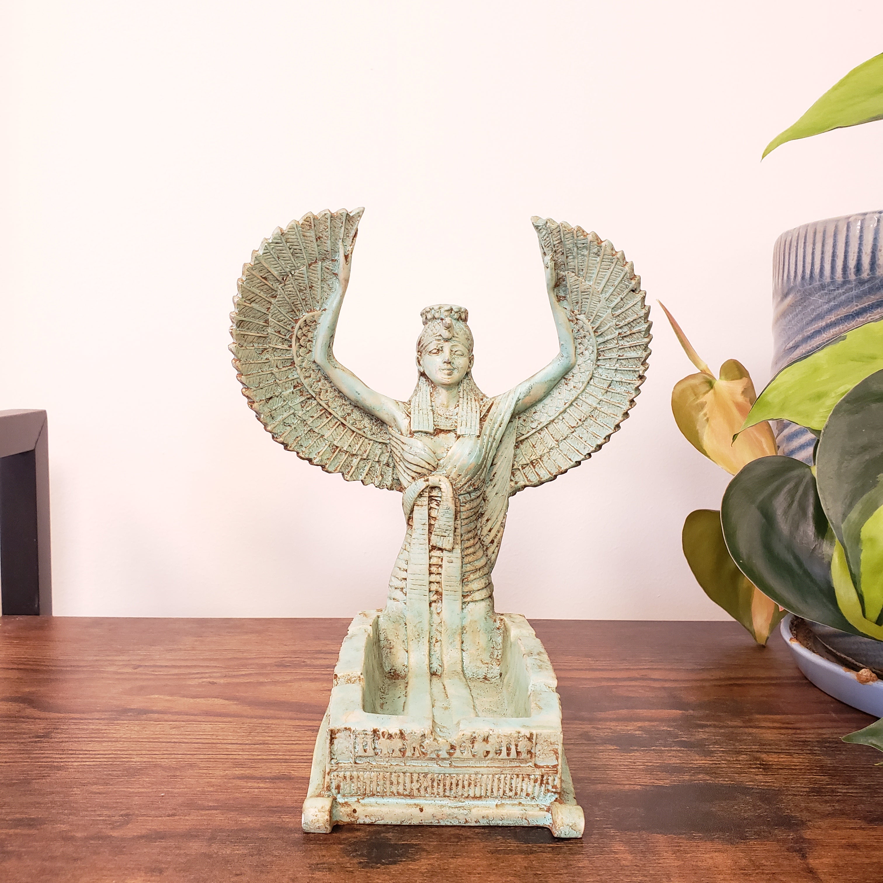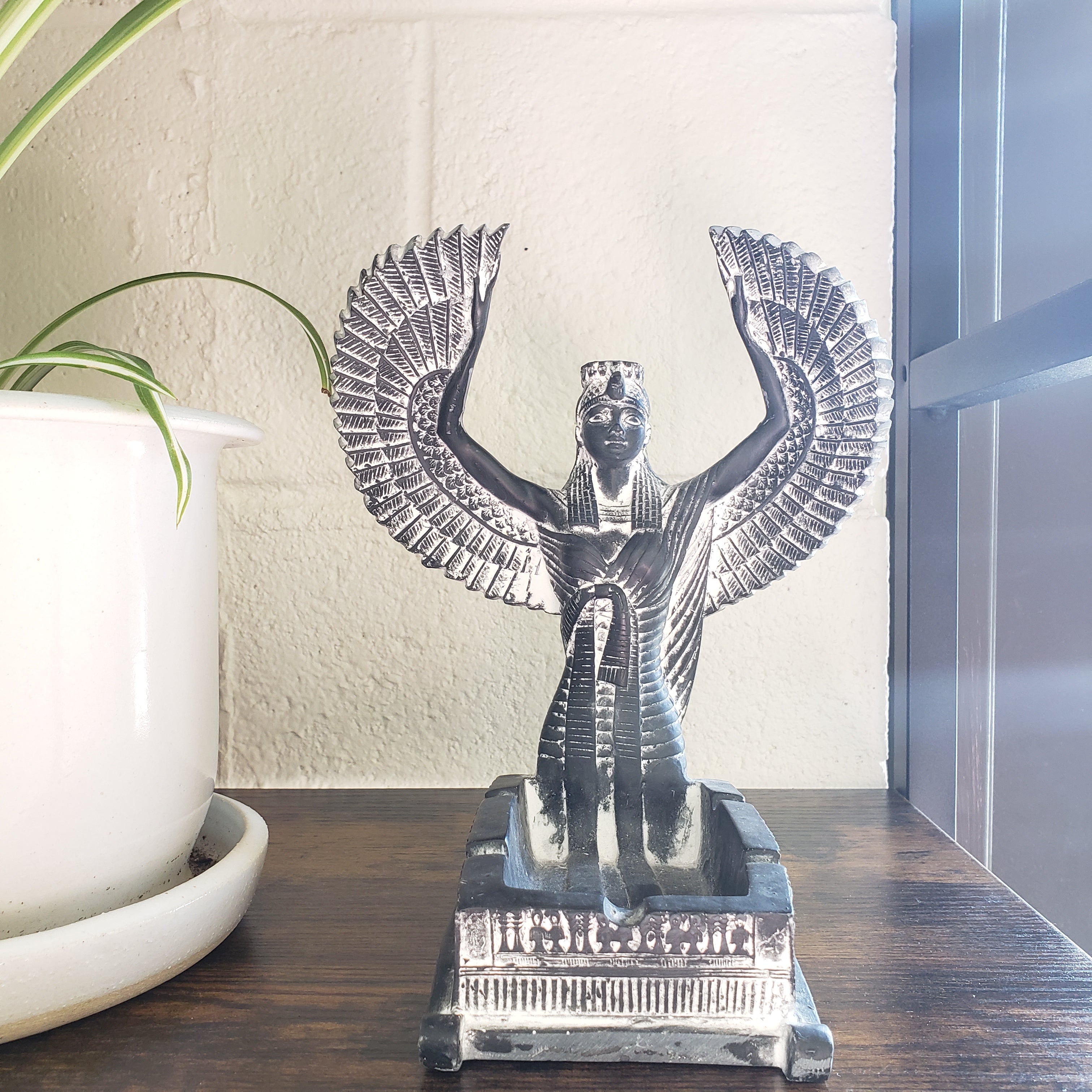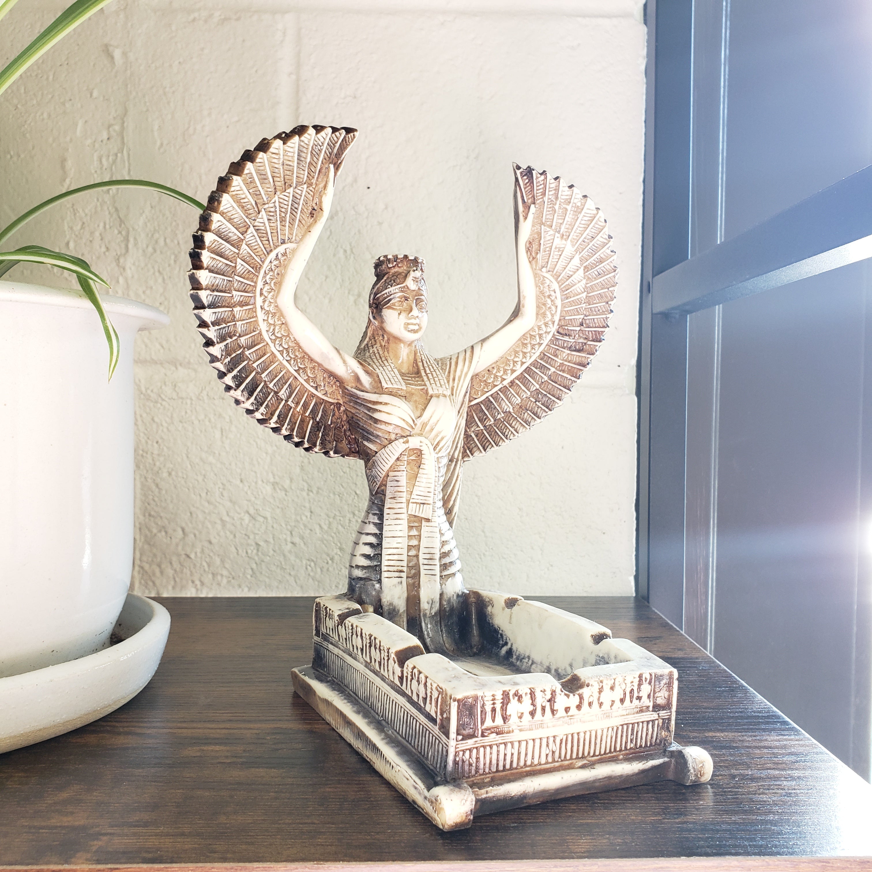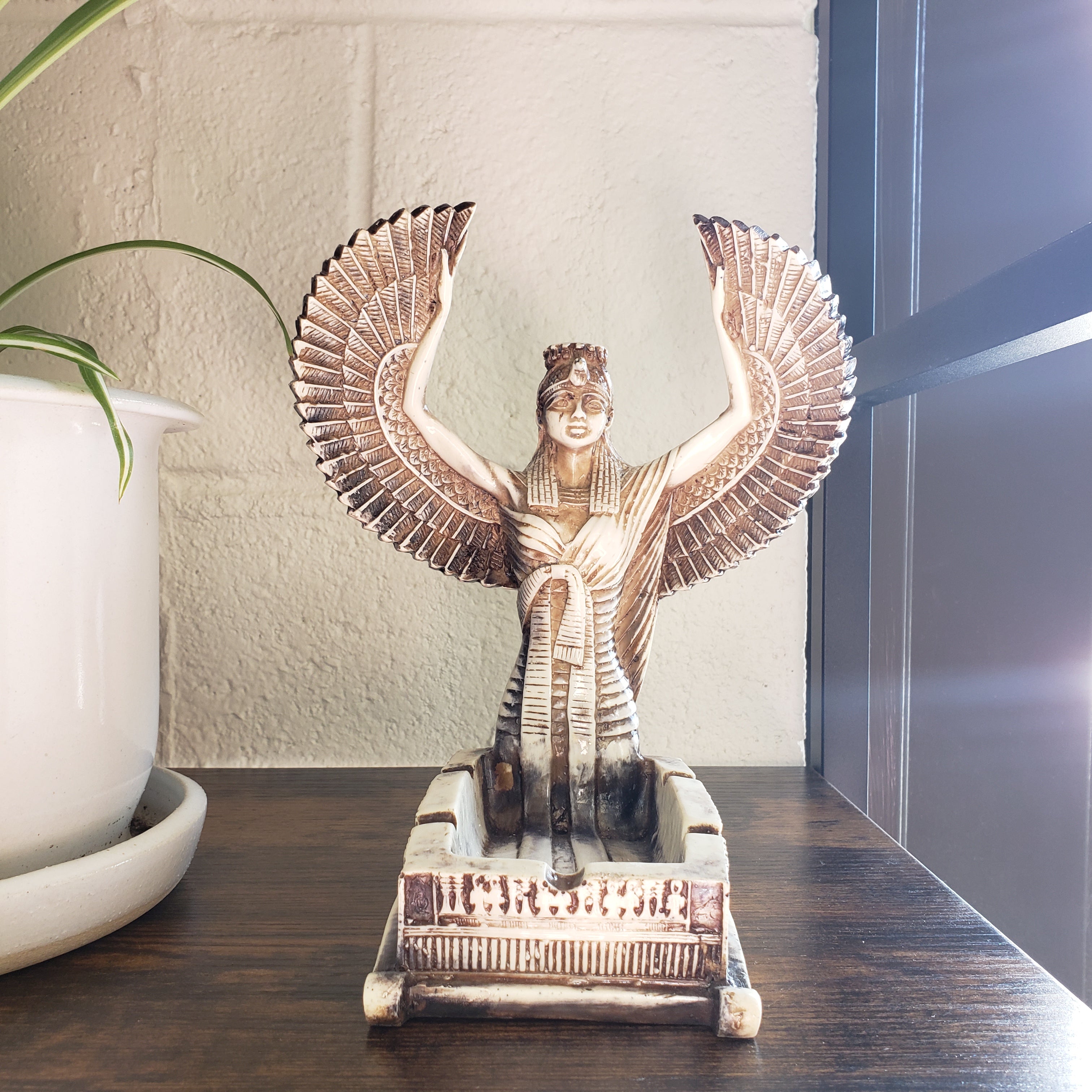 Diese ägyptische Göttinnenstatue zeigt eine geflügelte Isis. Vor ihr steht ein Tablett, das vermutlich als Aschenbecher diente. Wir denken, es eignet sich auch perfekt als Räuchergefäß oder zur Aufbewahrung besonderer Schätze. Diese robuste Statue wurde von uns entworfen und in Ägypten gefertigt. Die 20 cm hohe Statue hat eine Flügelspannweite von 18 cm. Sie besteht aus Polymer und wurde handbemalt. Die Statue wird in einer Schachtel mit Hieroglyphenmotiven geliefert.