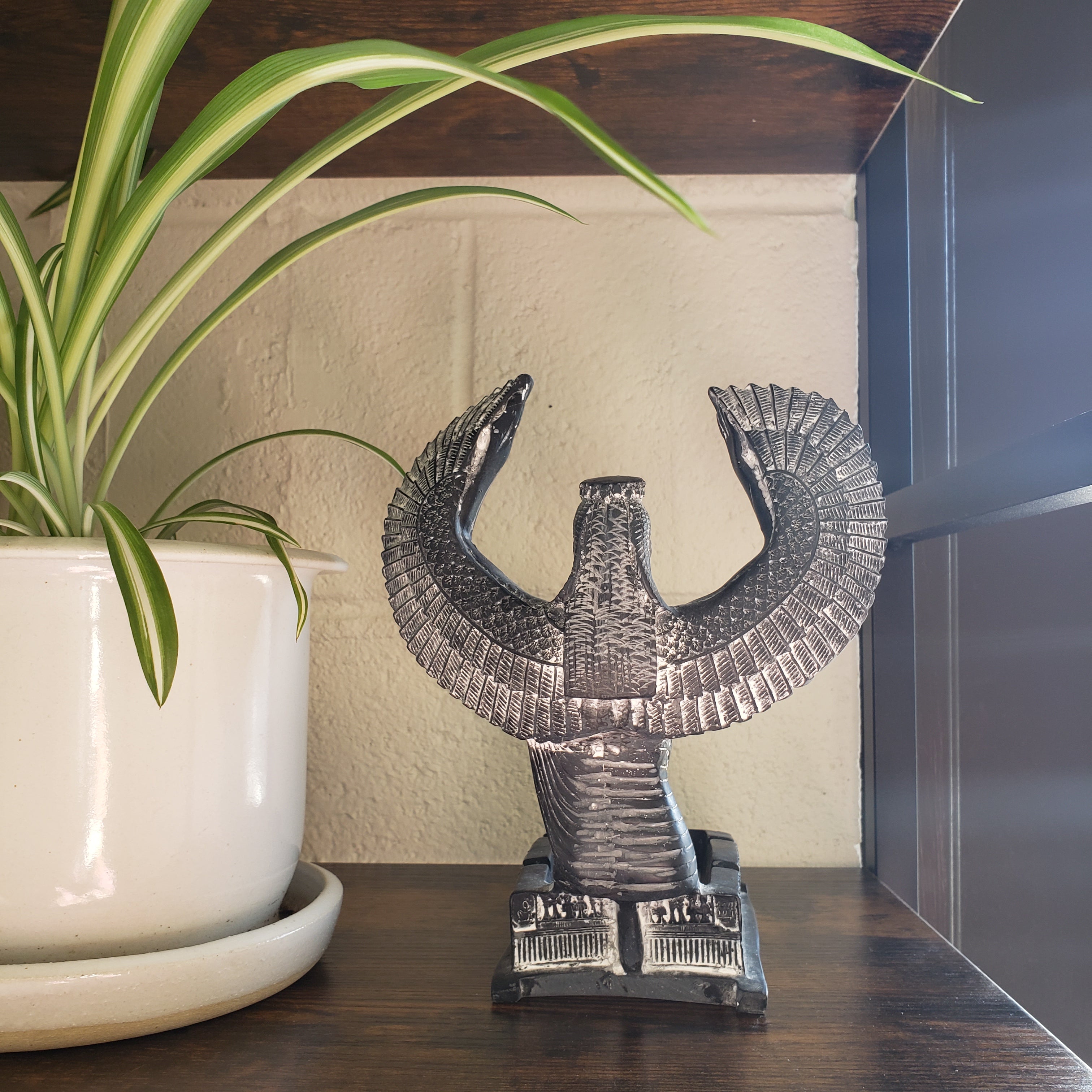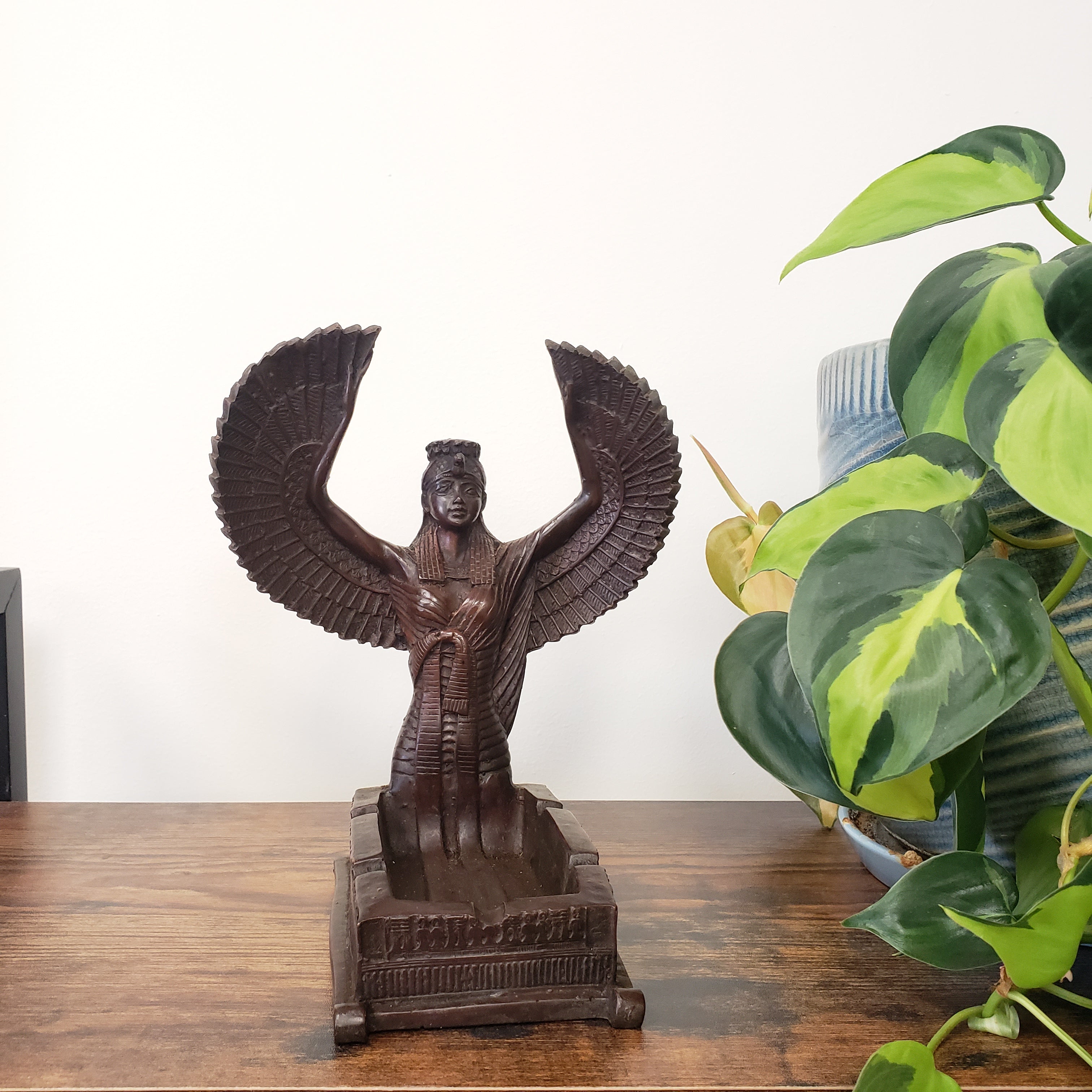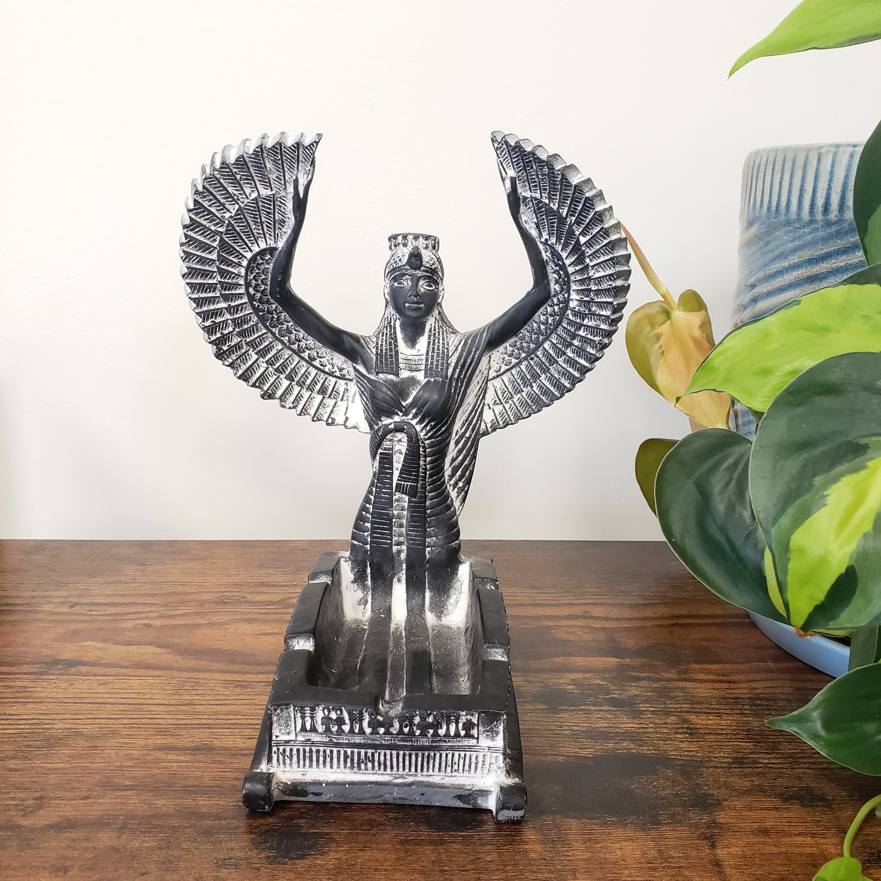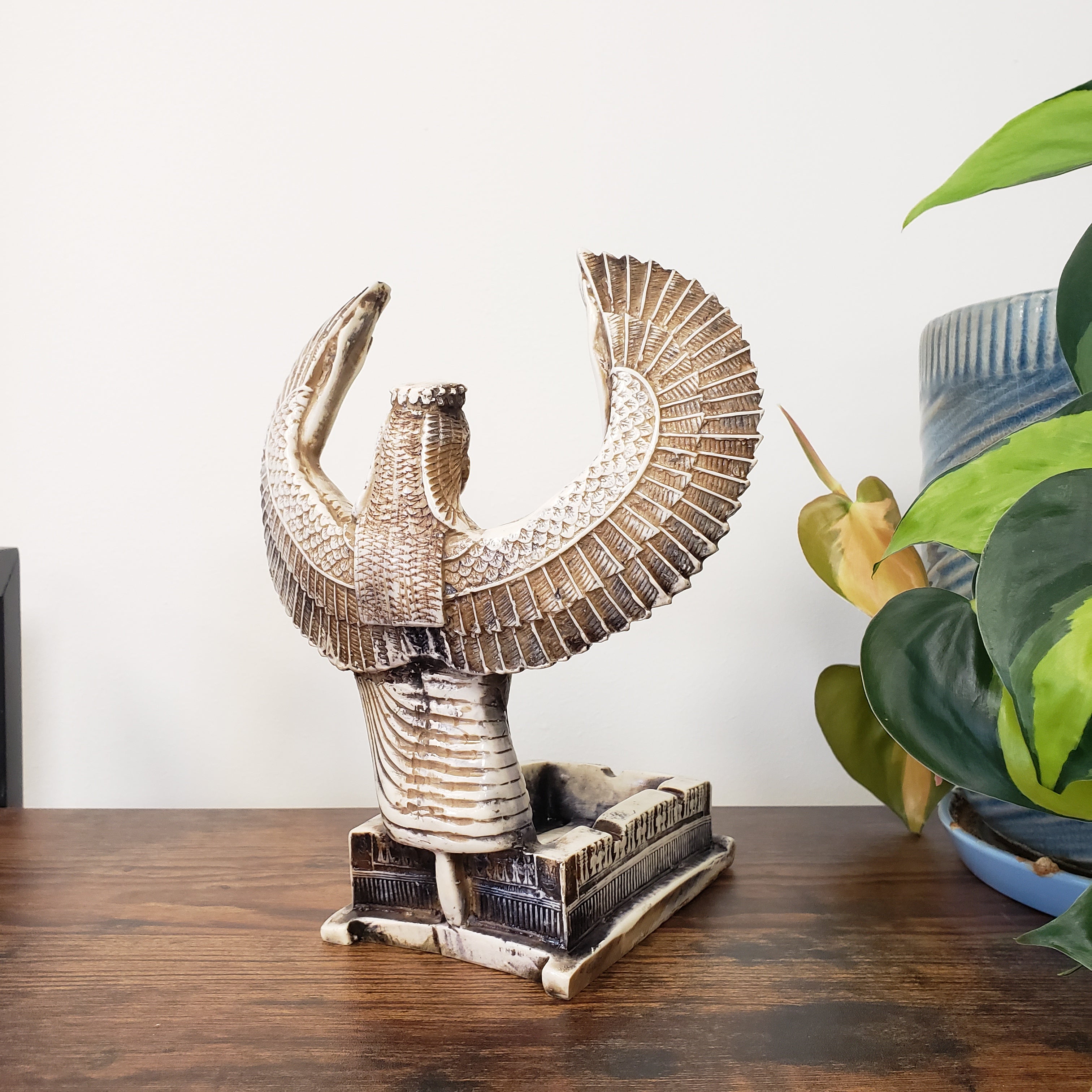 Diese ägyptische Göttinnenstatue zeigt eine geflügelte Isis. Vor ihr steht ein Tablett, das vermutlich als Aschenbecher diente. Wir denken, es eignet sich auch perfekt als Räuchergefäß oder zur Aufbewahrung besonderer Schätze. Diese robuste Statue wurde von uns entworfen und in Ägypten gefertigt. Die 20 cm hohe Statue hat eine Flügelspannweite von 18 cm. Sie besteht aus Polymer und wurde handbemalt. Die Statue wird in einer Schachtel mit Hieroglyphenmotiven geliefert.