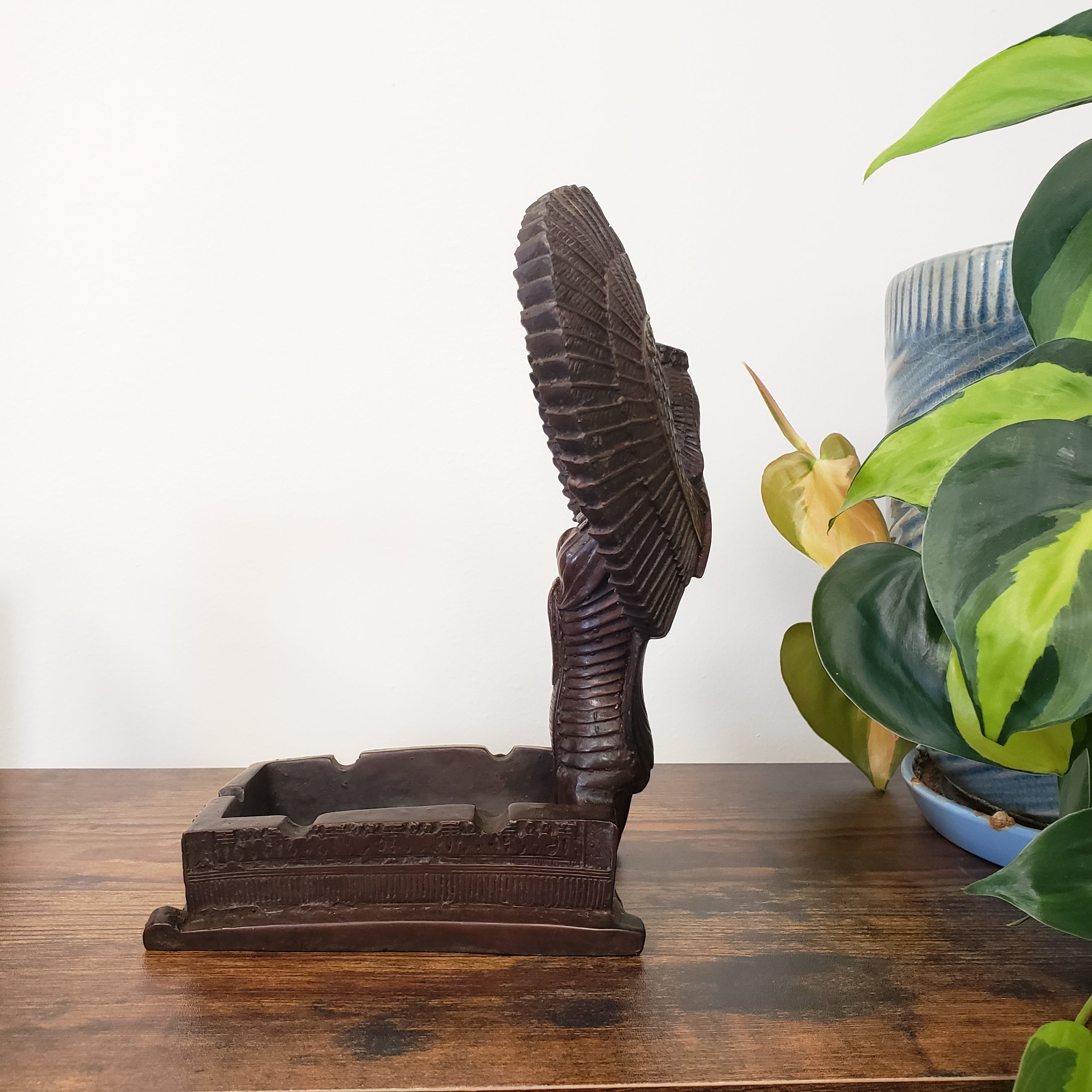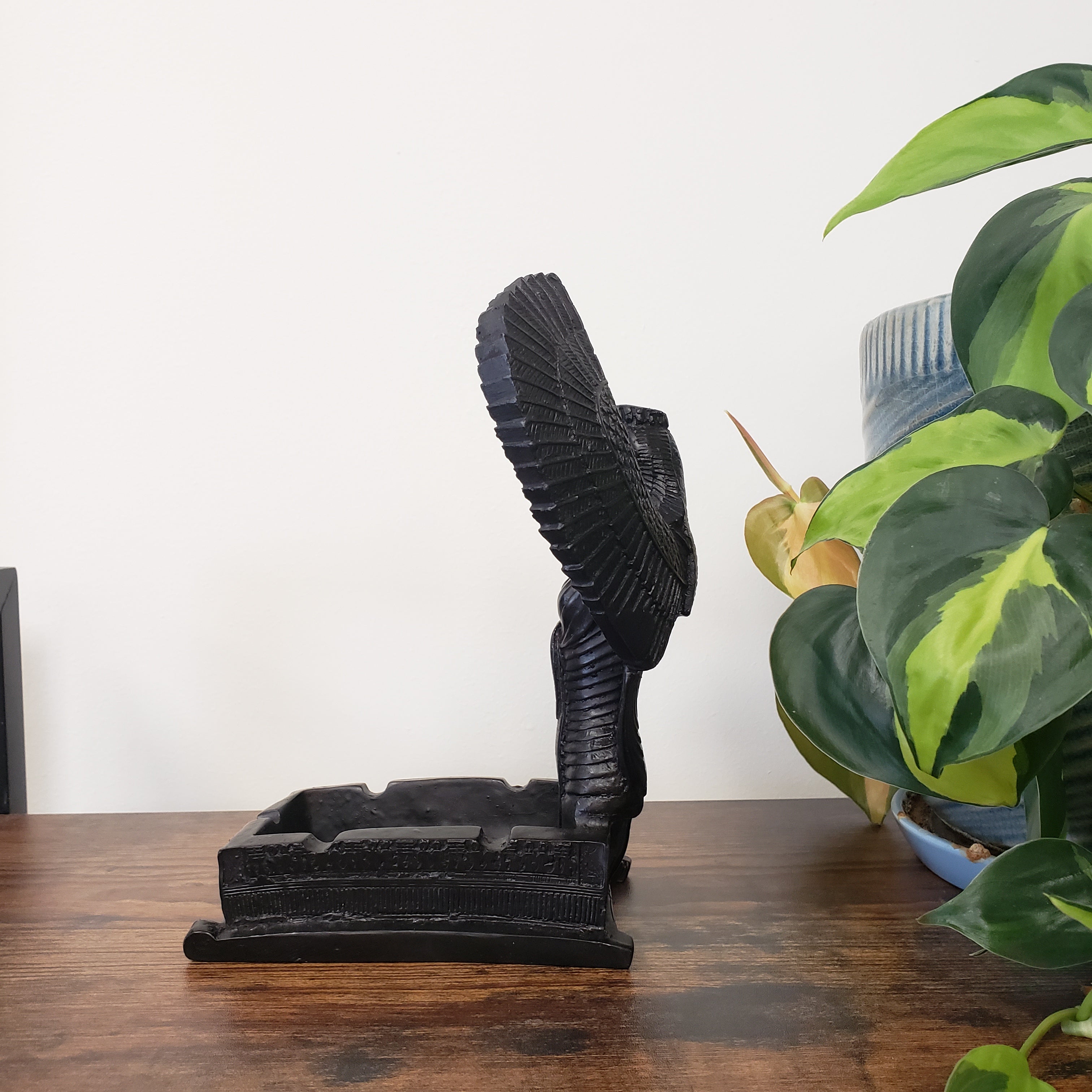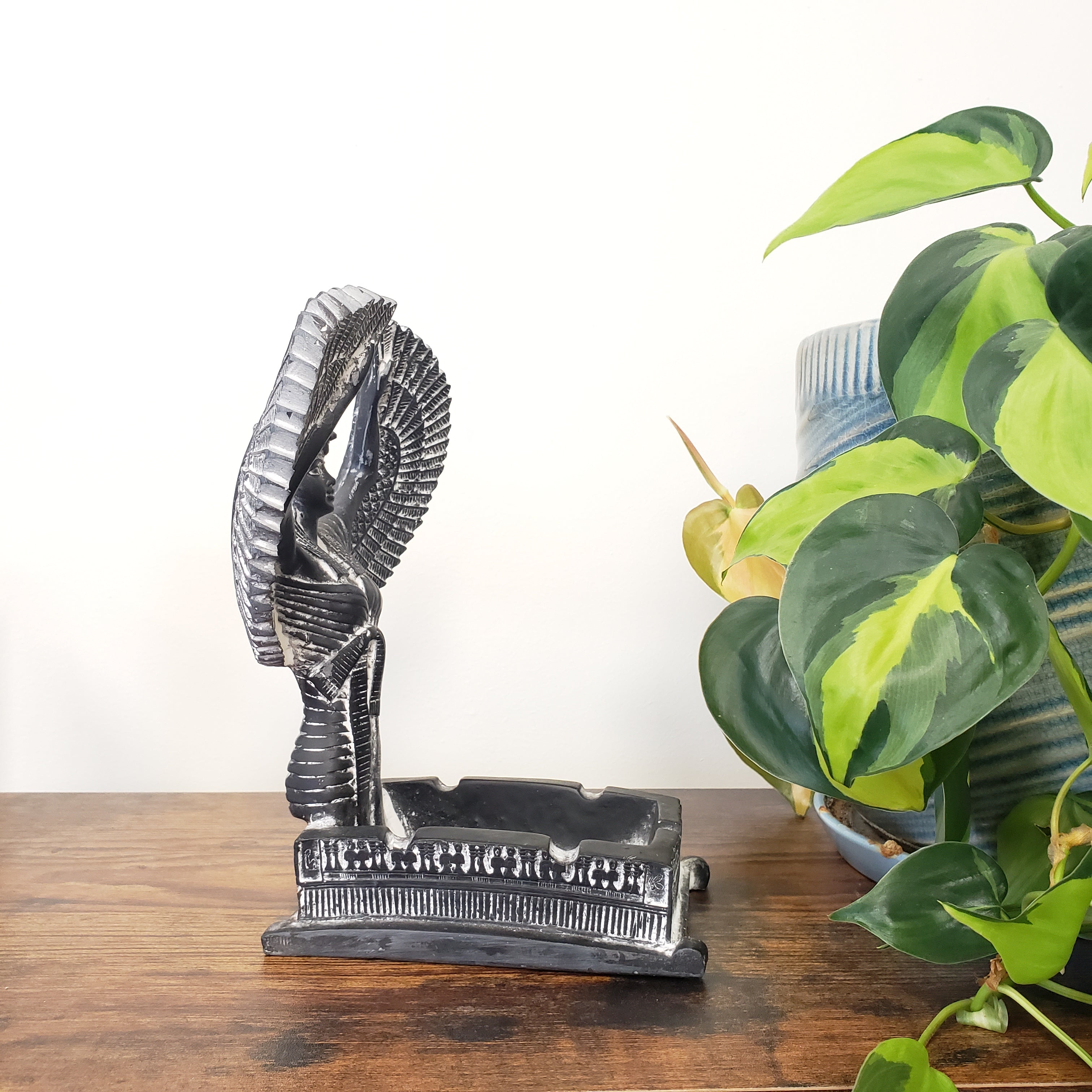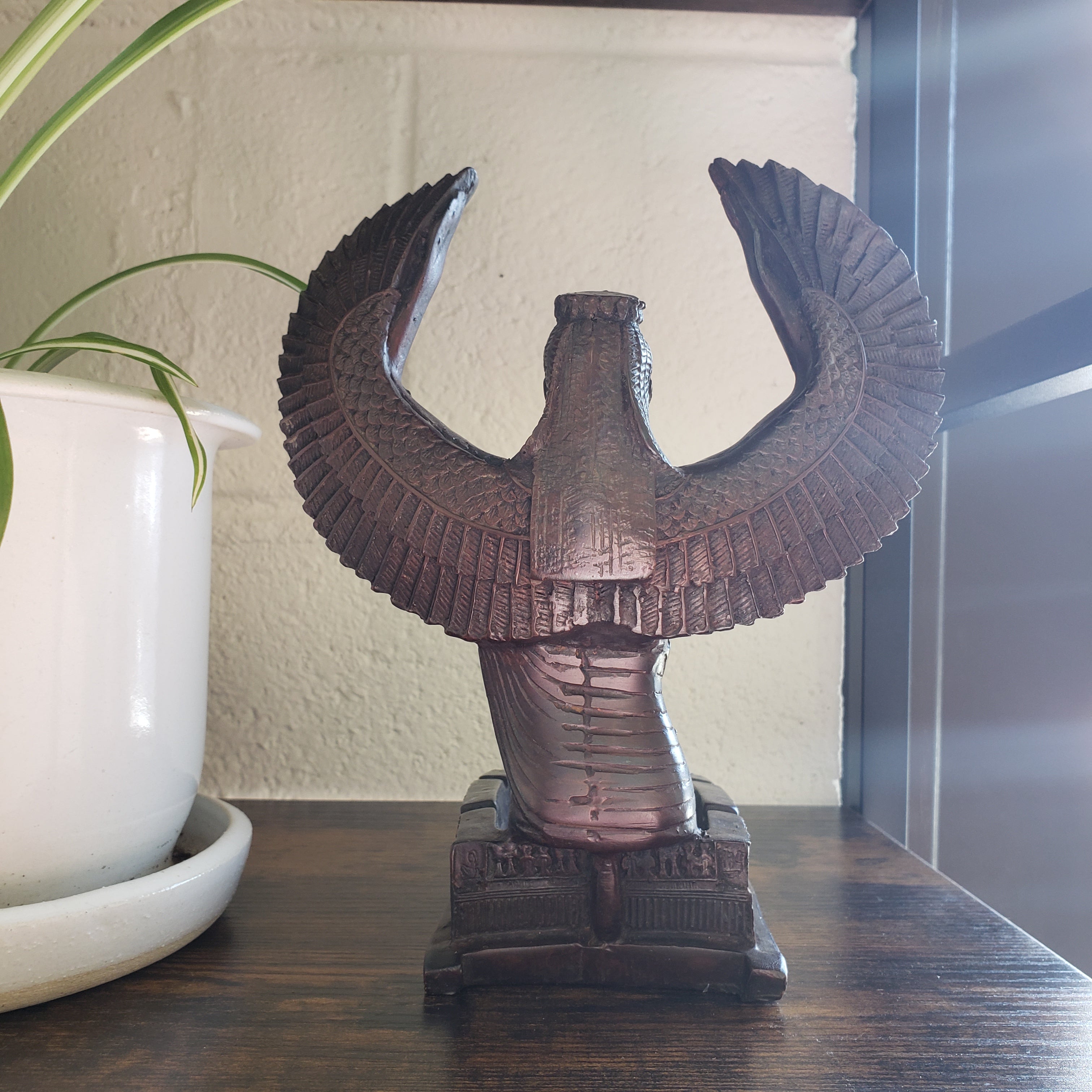 Diese ägyptische Göttinnenstatue zeigt eine geflügelte Isis. Vor ihr steht ein Tablett, das vermutlich als Aschenbecher diente. Wir denken, es eignet sich auch perfekt als Räuchergefäß oder zur Aufbewahrung besonderer Schätze. Diese robuste Statue wurde von uns entworfen und in Ägypten gefertigt. Die 20 cm hohe Statue hat eine Flügelspannweite von 18 cm. Sie besteht aus Polymer und wurde handbemalt. Die Statue wird in einer Schachtel mit Hieroglyphenmotiven geliefert.