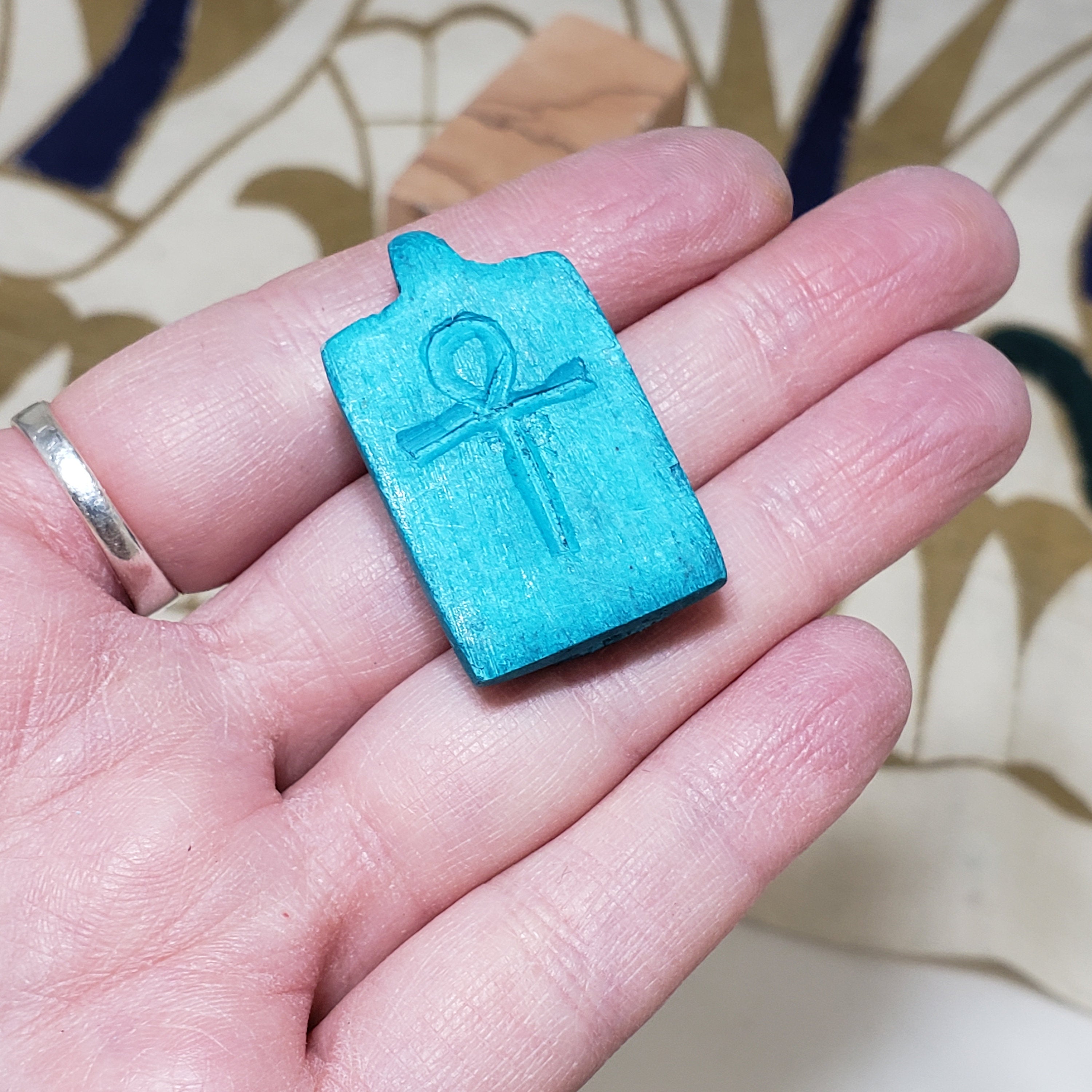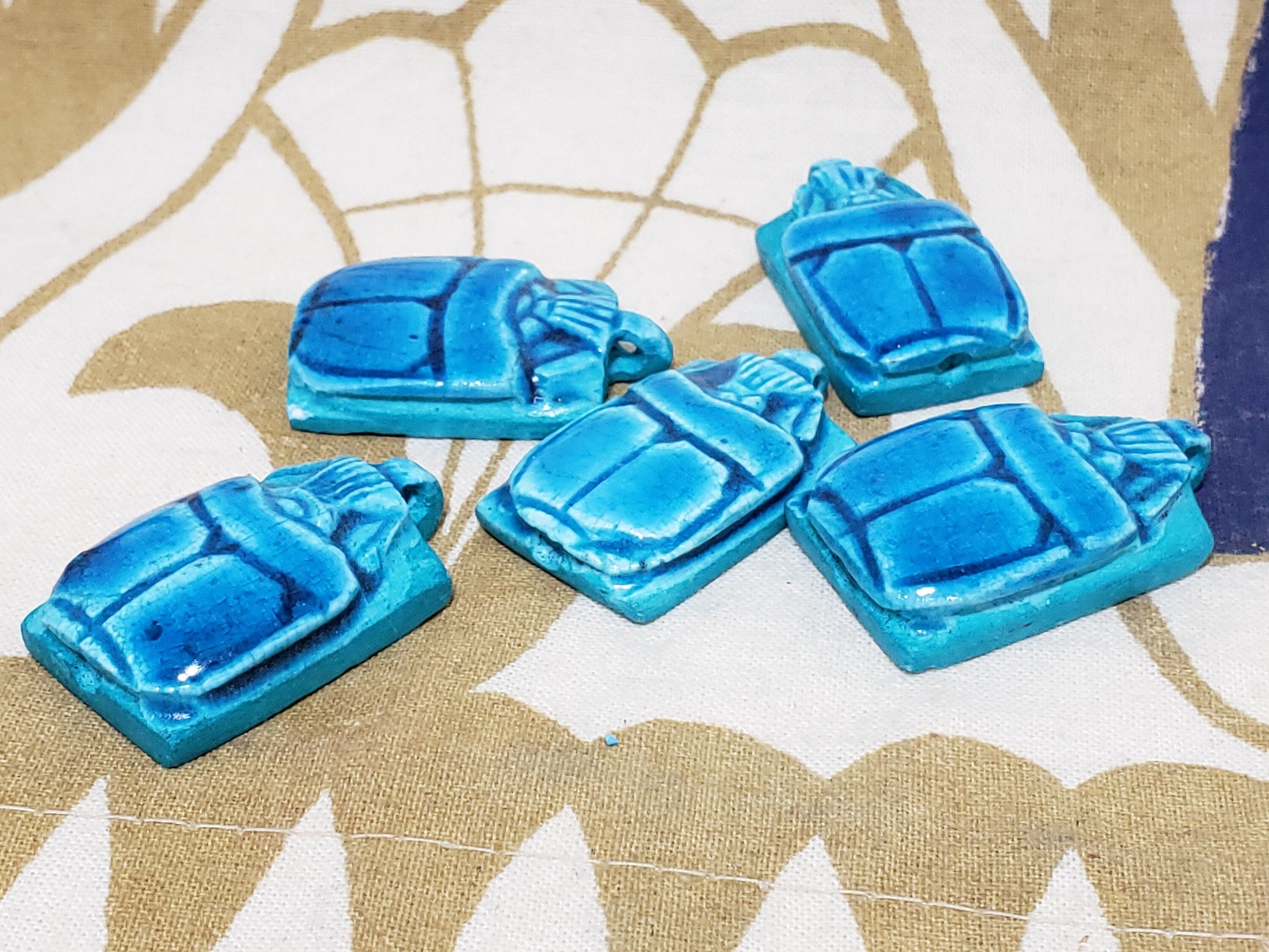 Diese Skarabäus-Anhänger sind aus Speckstein (Keramik) gefertigt und blau glasiert. Auf der Rückseite jedes Anhängers befindet sich ein handgeschnitztes Ankh-Symbol. Die Größen variieren leicht, betragen aber ungefähr 3,2 cm in der Länge und 1,9 cm in der Breite. Der Lochdurchmesser beträgt 2 mm.