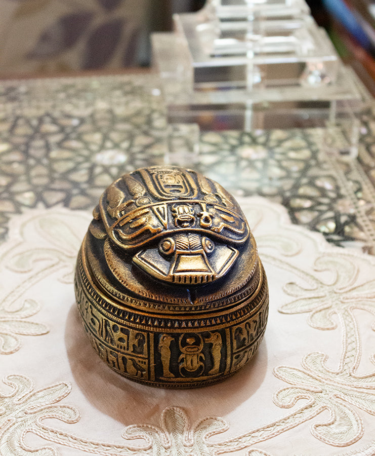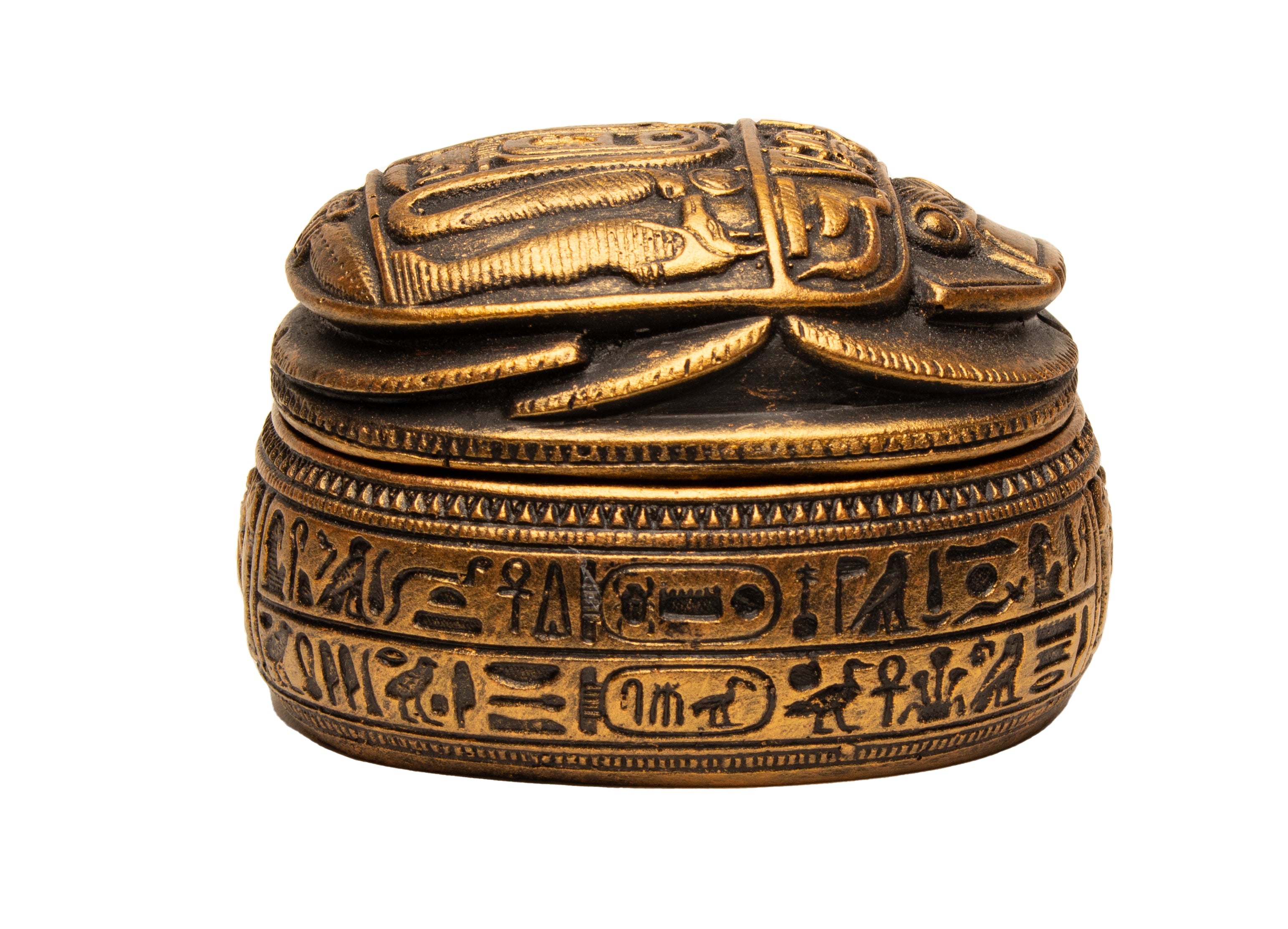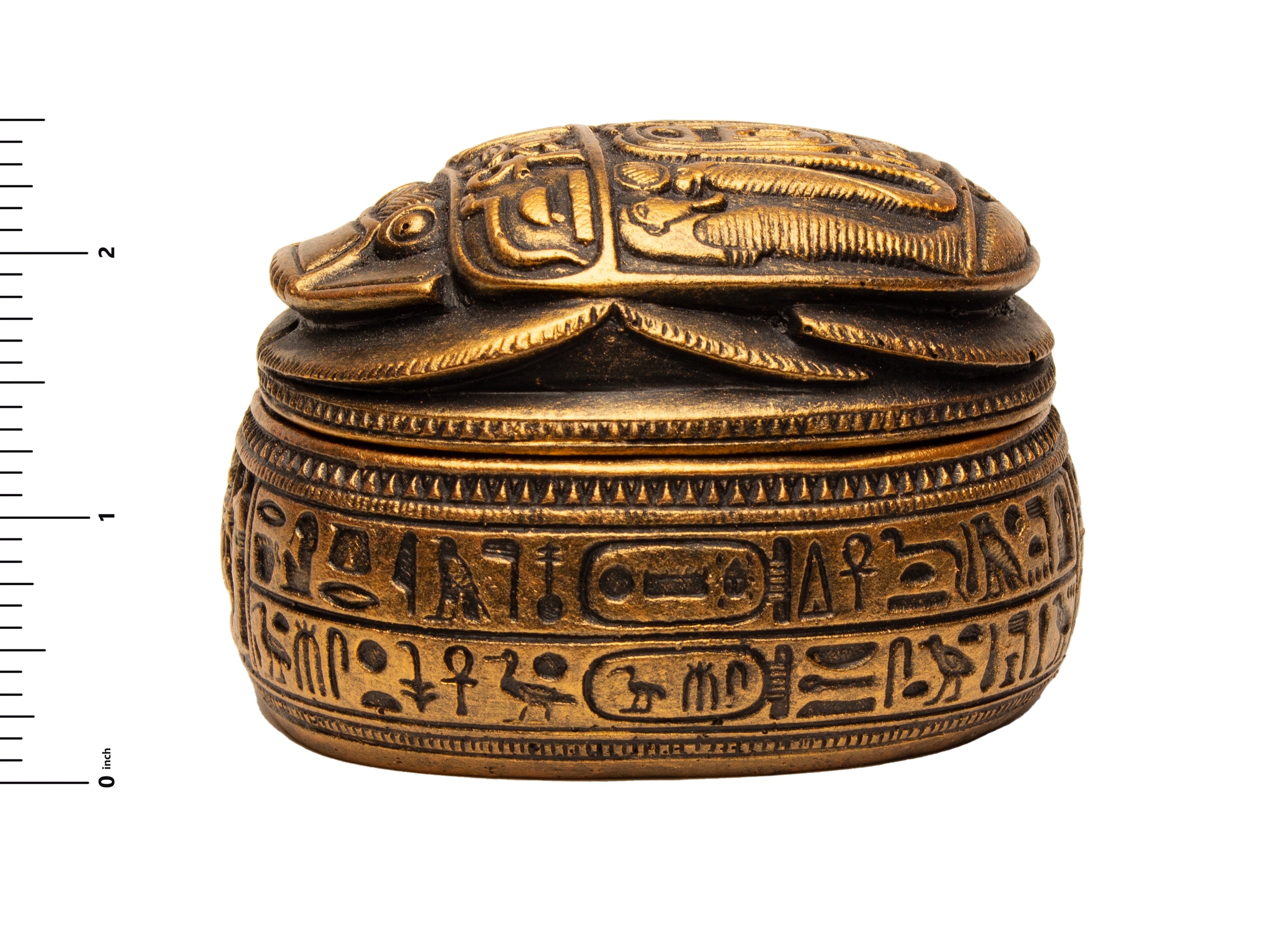 Diese besondere handbemalte Skarabäus-Schatulle aus Polymerharz hat einen abnehmbaren, dekorativen Deckel. An den Rändern und im Inneren der Schatulle befinden sich Hieroglyphen. Die Schatulle wurde in Handarbeit in Luxor, Ägypten, gefertigt. Sie ist 12,7 cm lang, 7,6 cm breit und 6,3 cm hoch. Die Innentiefe beträgt 2,5 cm.