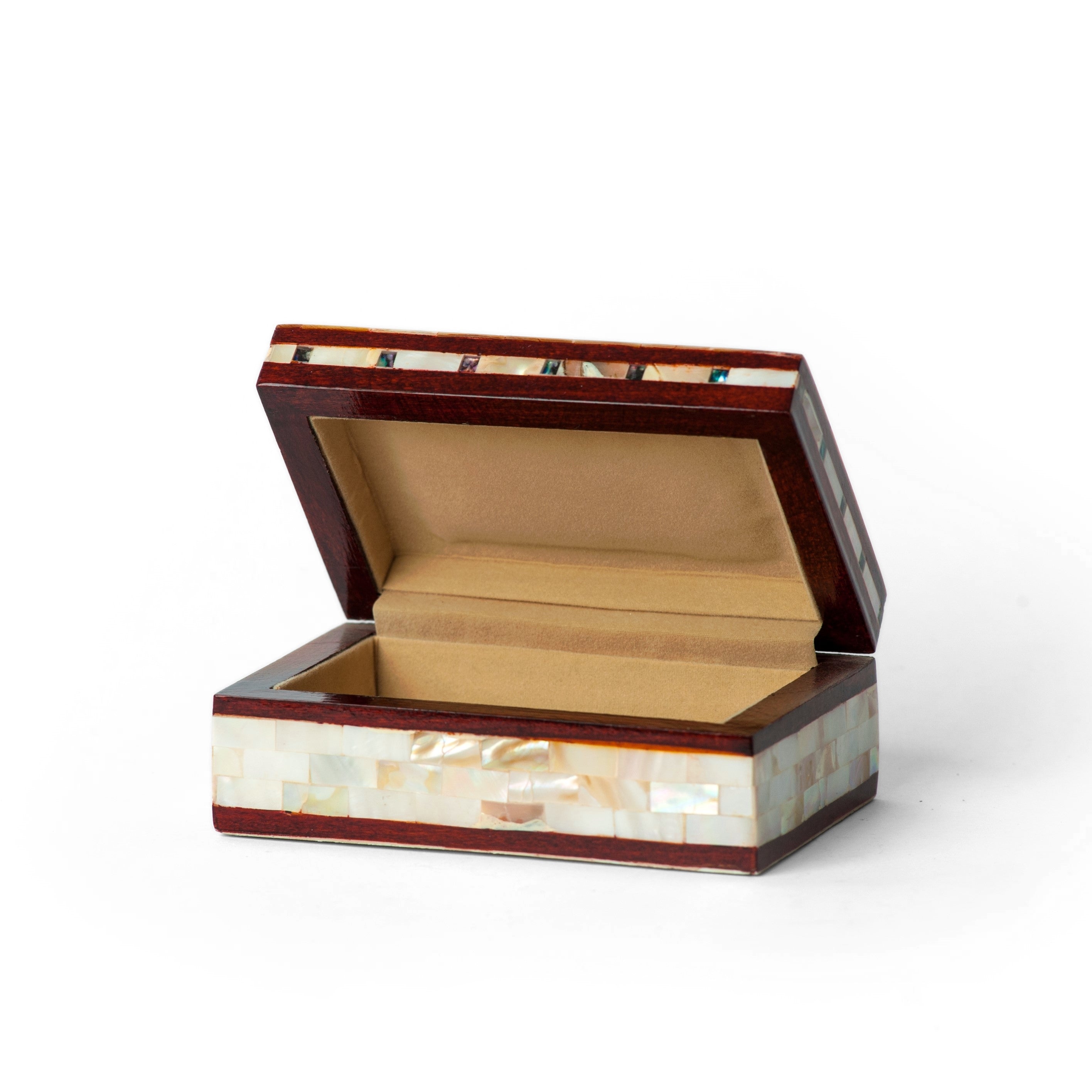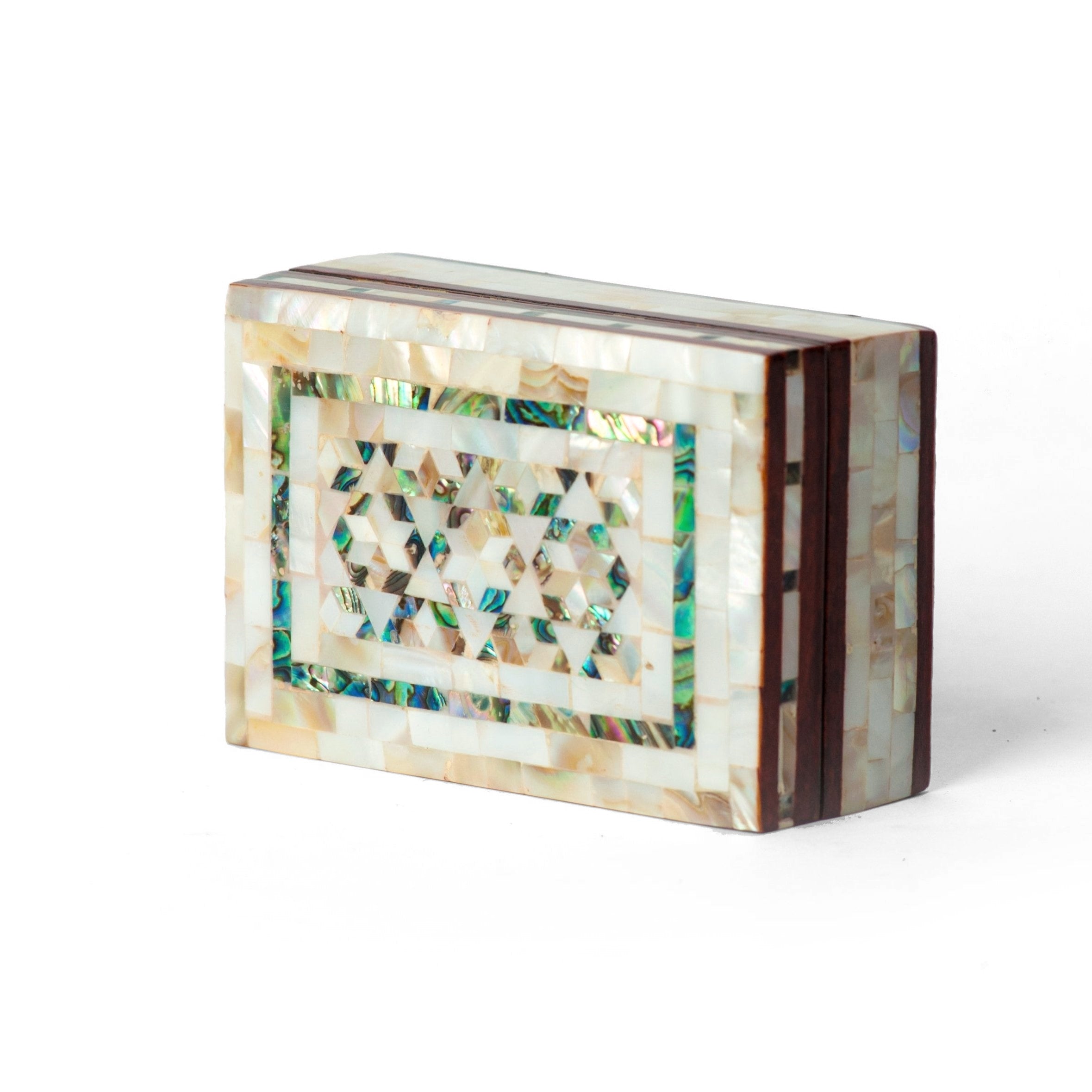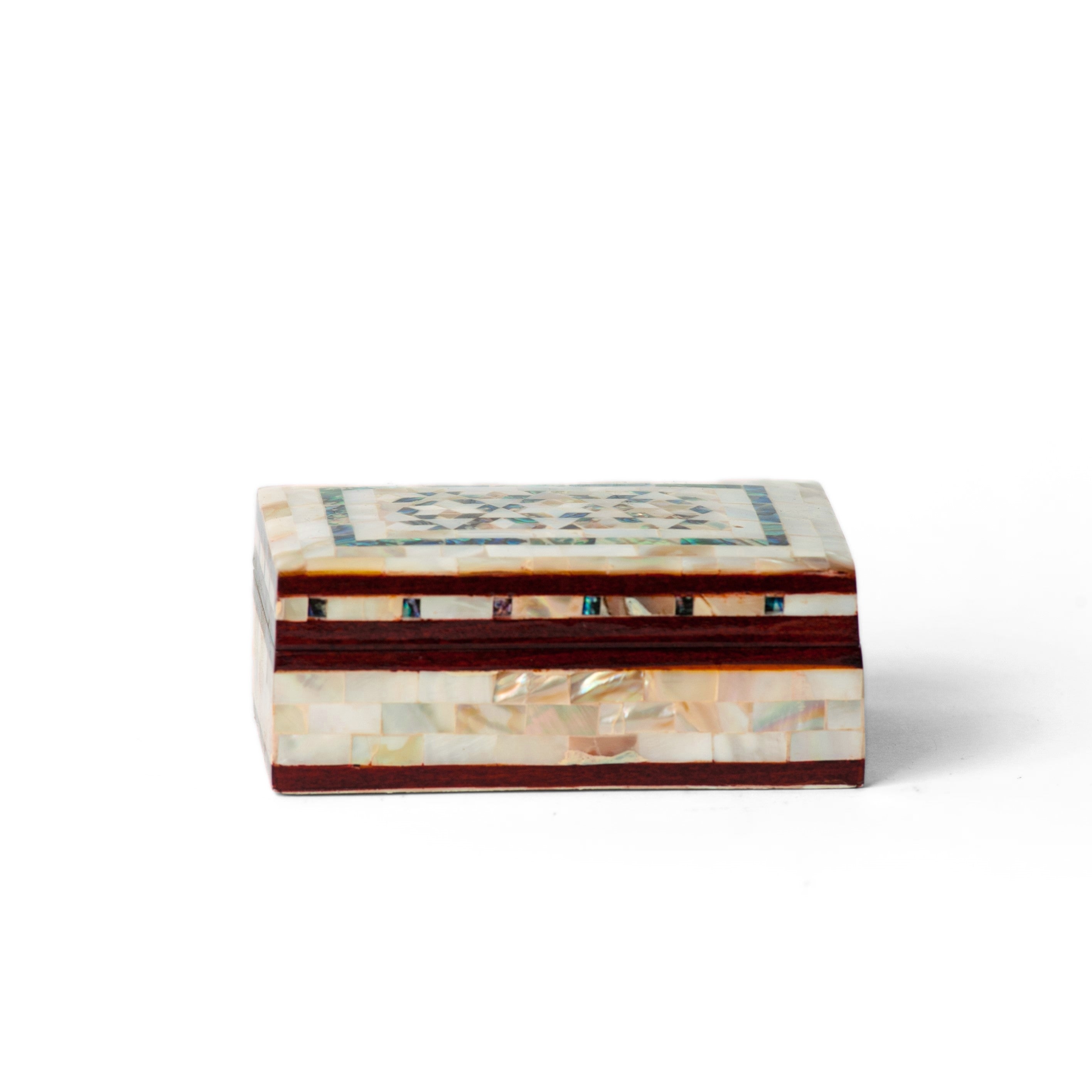 Mit Perlmutt eingelegte Kästchen aus Ägypten sind exquisite Beispiele traditioneller Handwerkskunst und vereinen filigrane Designs mit reichem kulturellem Erbe. Diese Kästchen verfügen über einen Holzsockel, der mit sorgfältig geschliffenen und polierten Perlmuttstücken verziert ist, wodurch wunderschöne geometrische Muster, florale Motive und Arabesken entstehen.