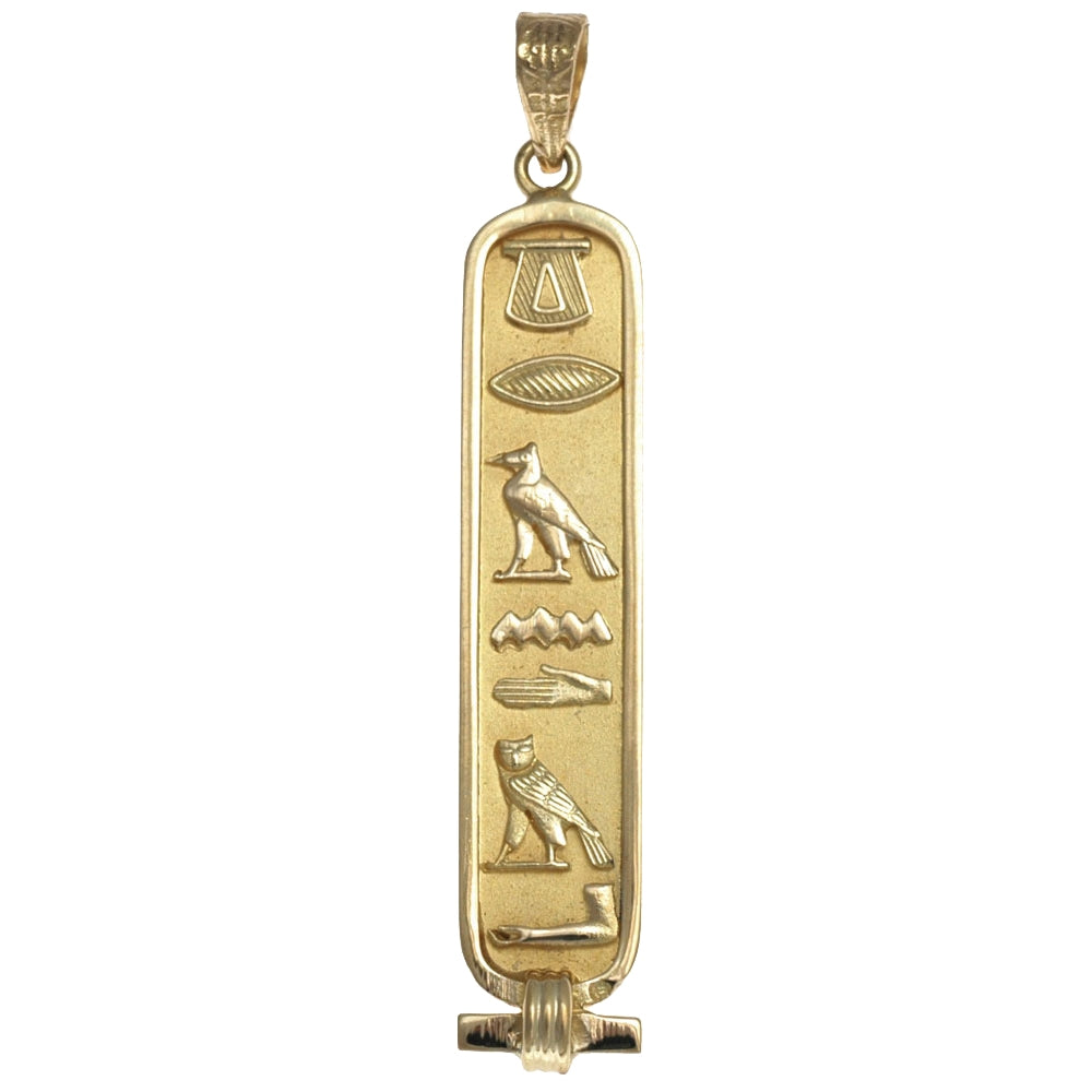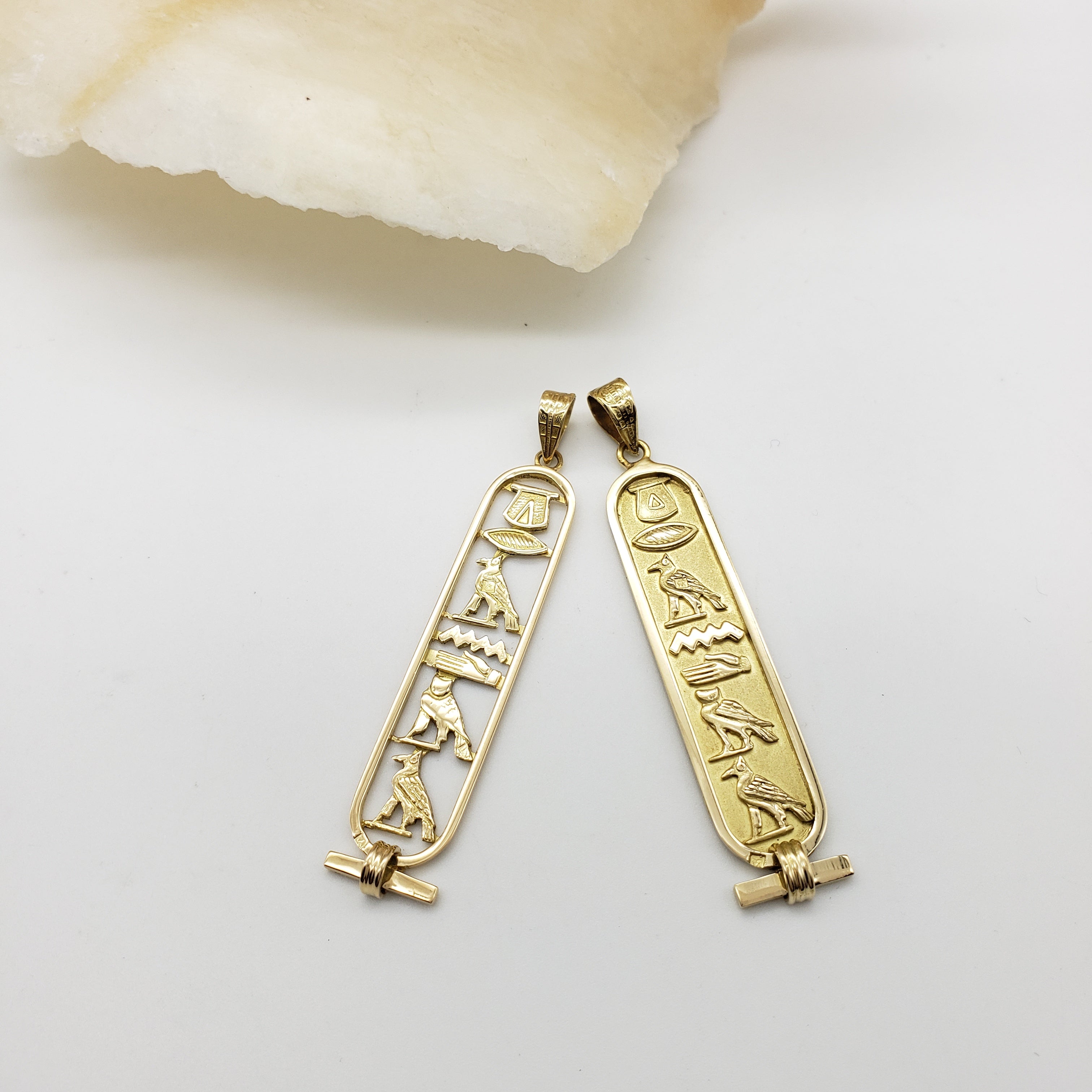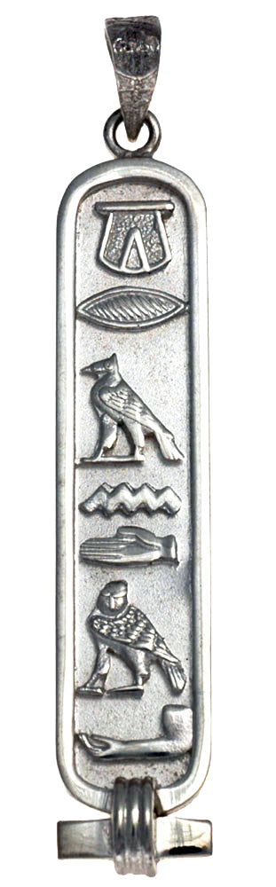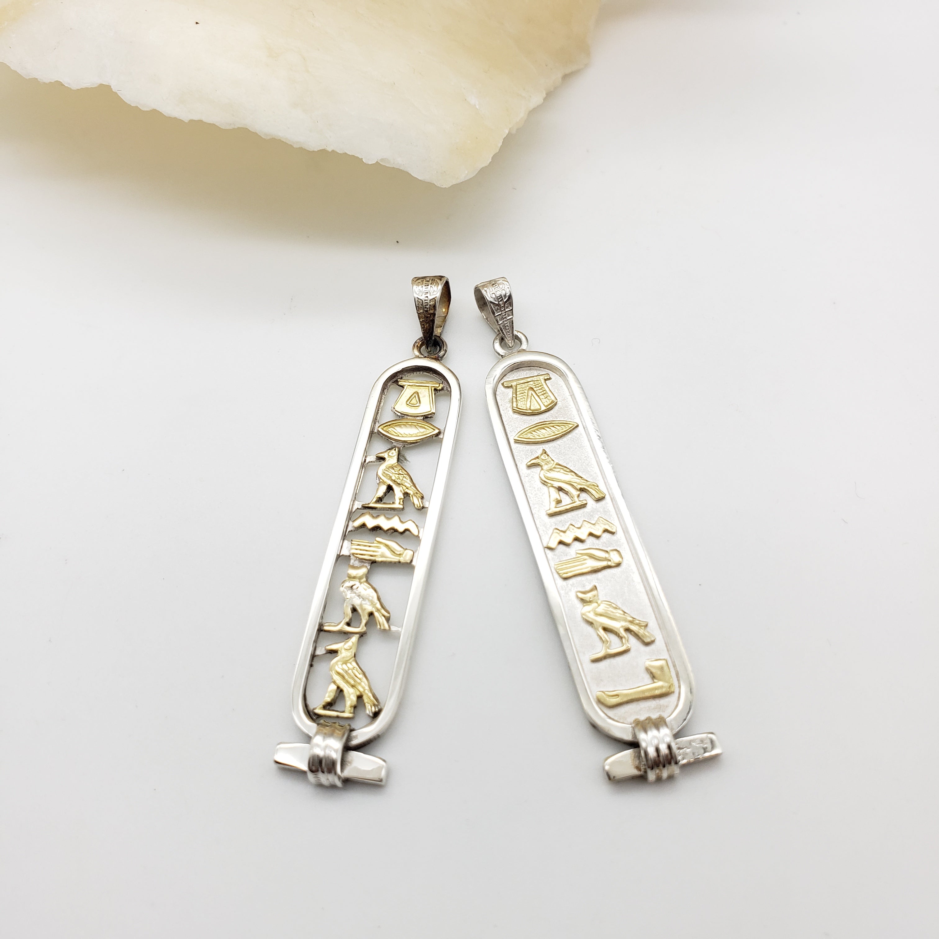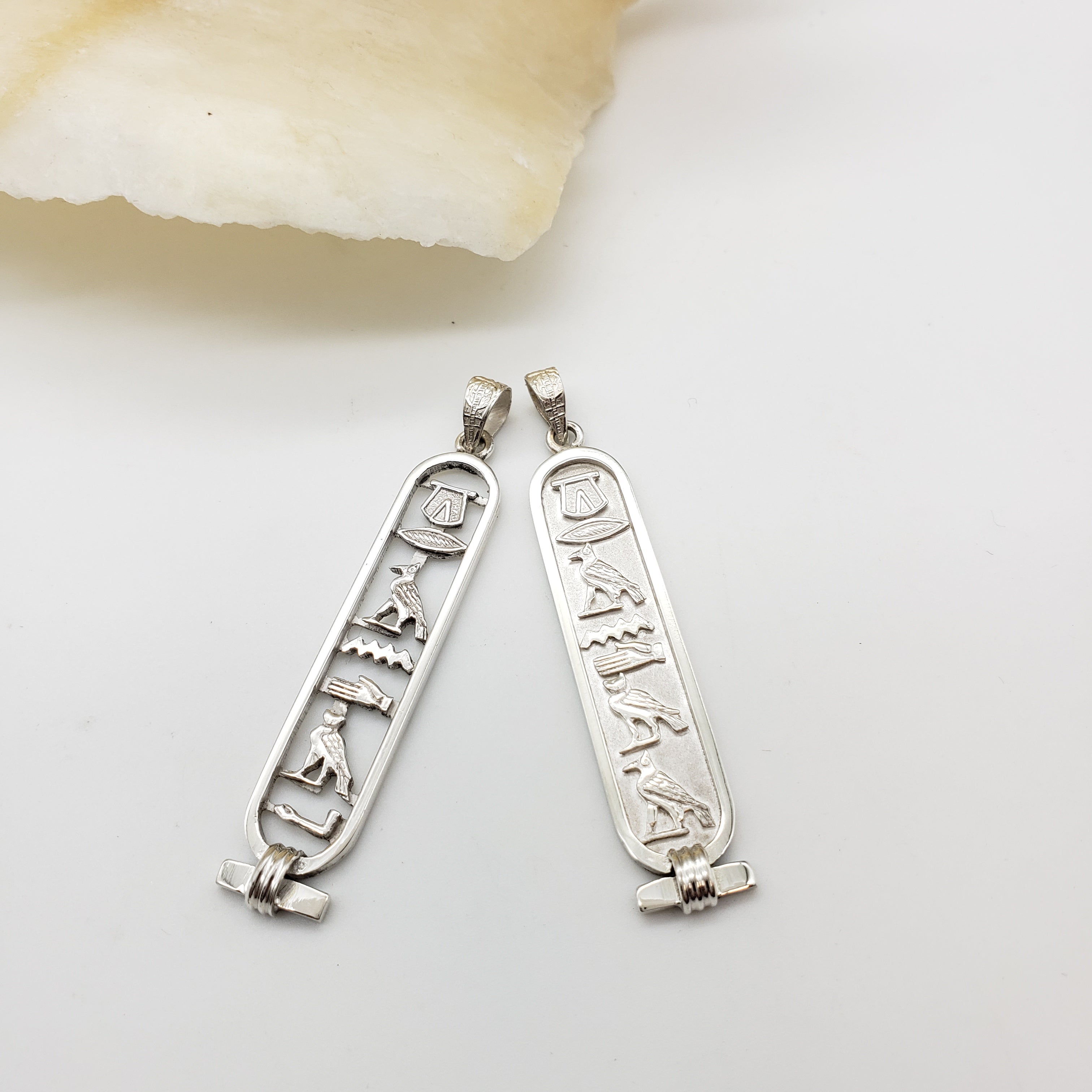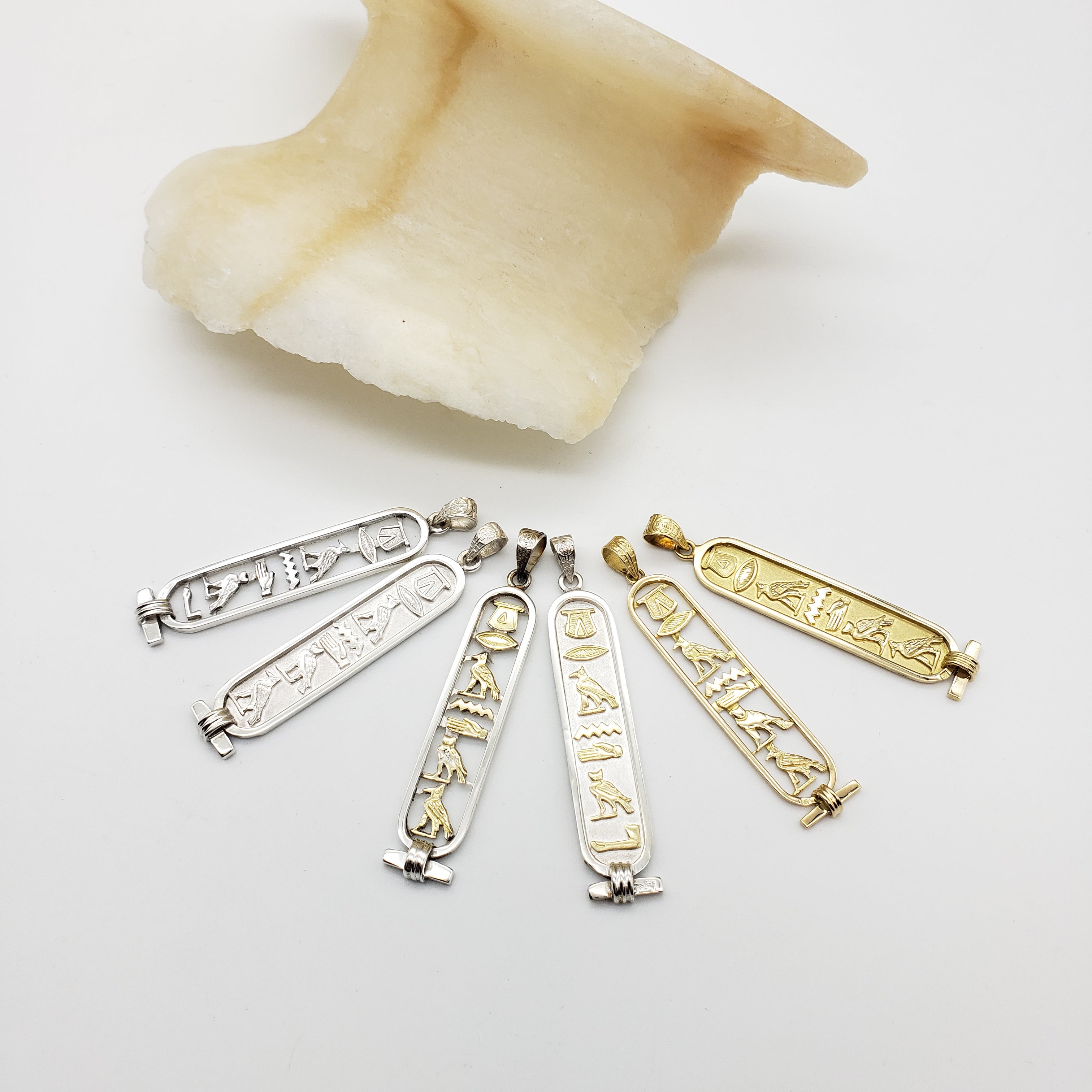 Handgefertigt im alten Basar Khan el-Khalili, im Herzen des alten Kairos. Wählen Sie zwischen zwei Ausführungen: offen oder geschlossen, in Sterlingsilber oder 18-karätigem Gold. Sie können auch Sterlingsilber mit Hieroglyphen aus 18-karätigem Gold als Anhänger in offener oder geschlossener Ausführung bestellen. Jede Kartusche ist (oft an zwei Stellen) mit dem ägyptischen Staatsstempel versehen, der den Metallgehalt bestätigt.