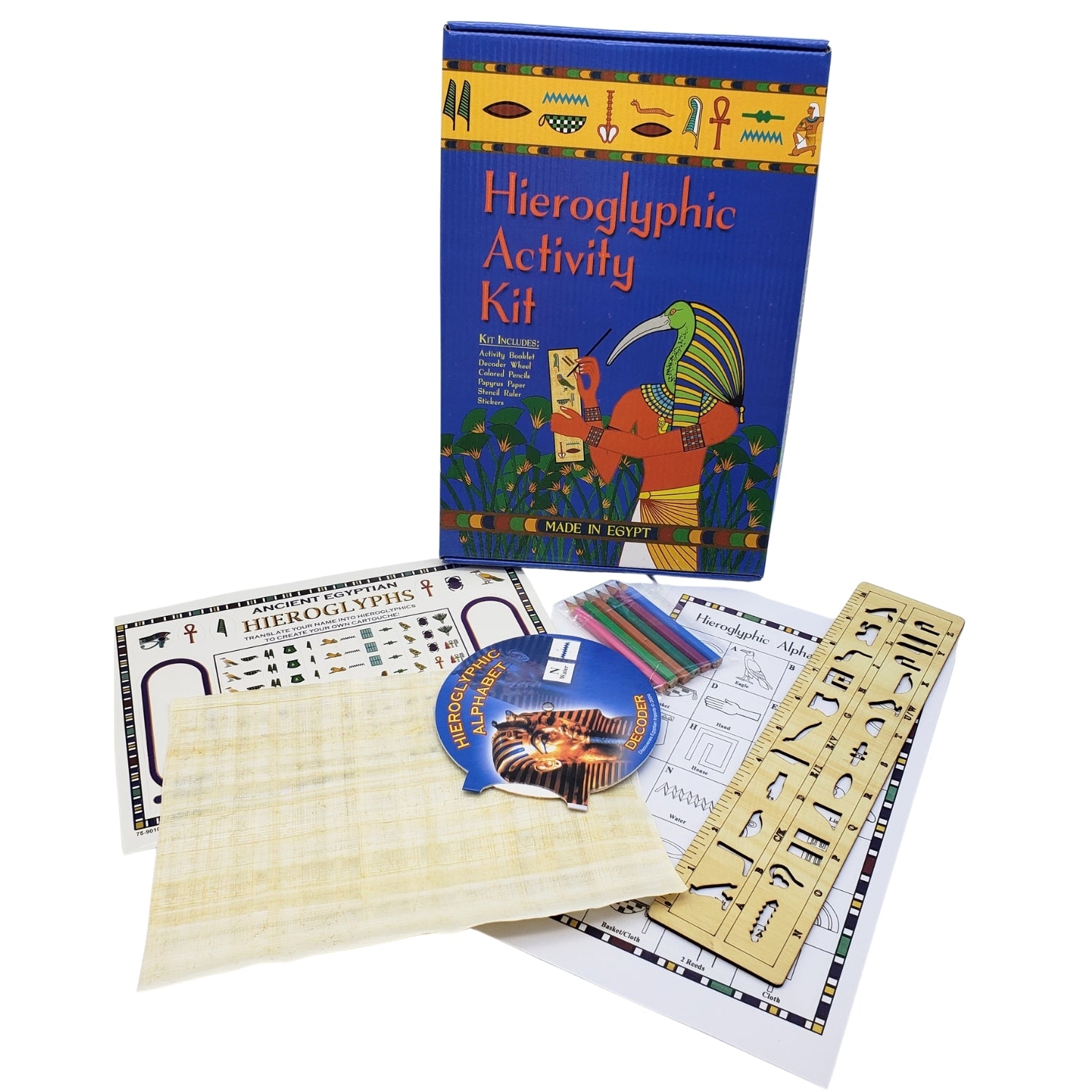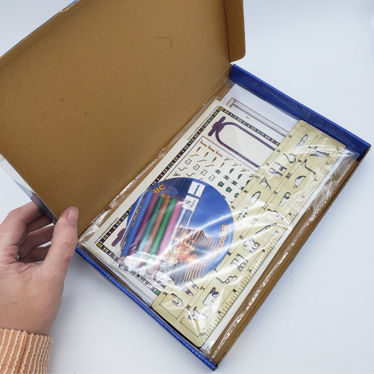 Das Set enthält: Hieroglyphen-Schablonenlineal, Hieroglyphenrad-Decoder, Buntstifte, ein mit Fakten gefülltes Aktivitätsheft und ein leeres Blatt echten Papyrus.