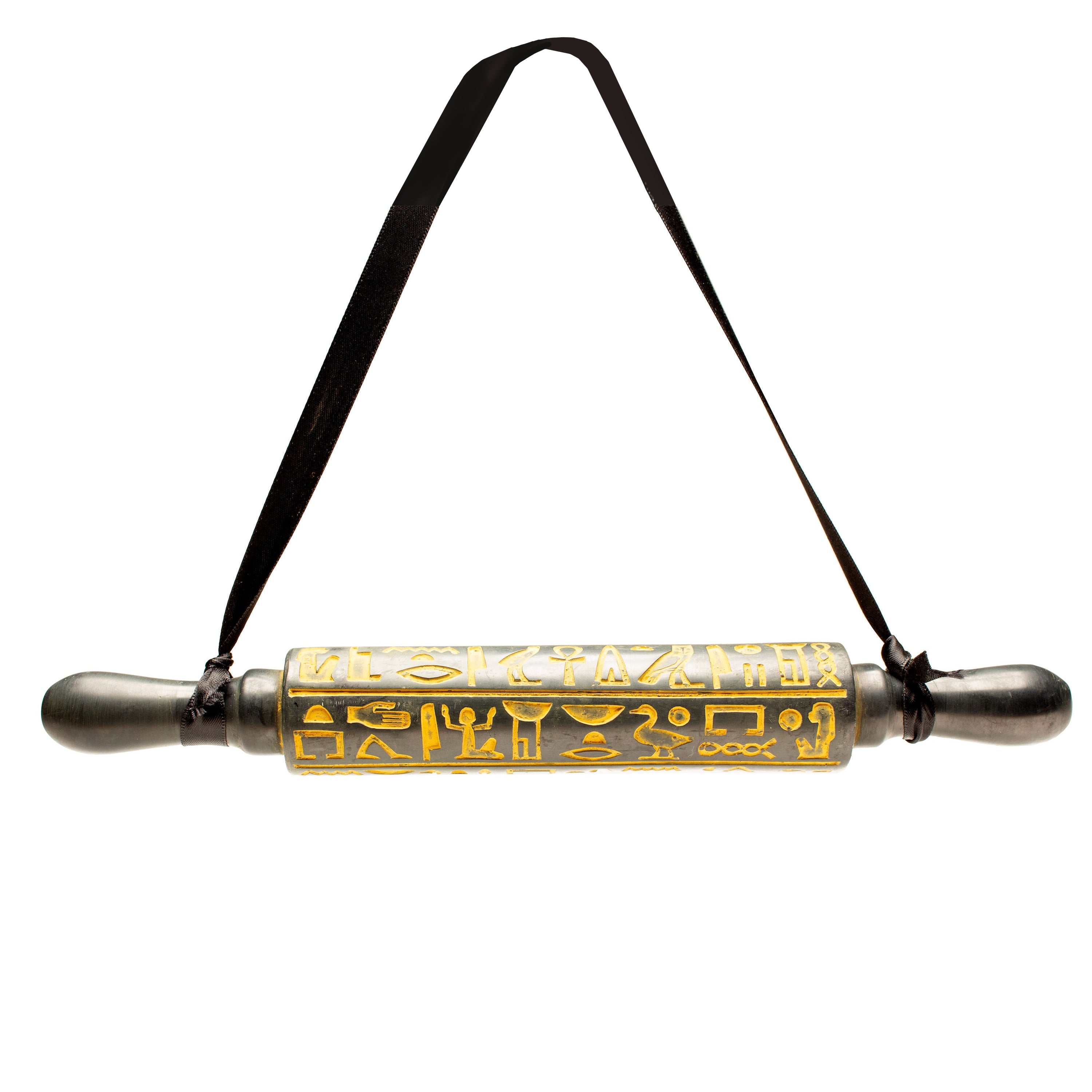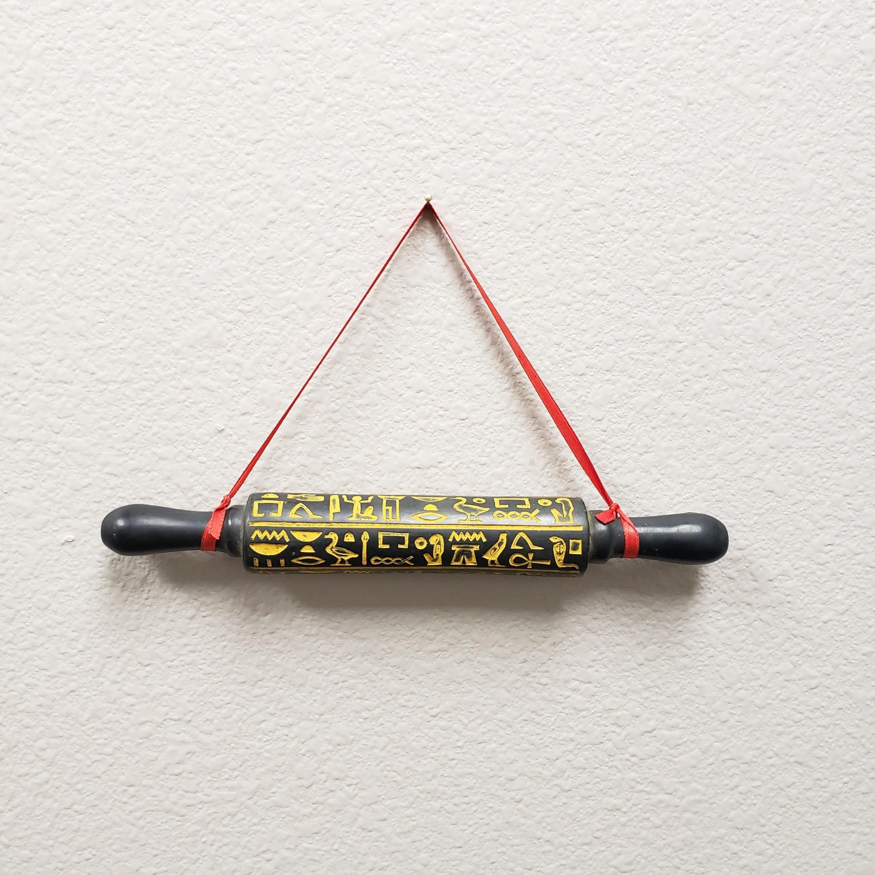 Diese 30 cm lange Teigrolle ist aus Polymerharz gefertigt. Die eingravierten Hieroglyphen sind mit gelb-goldenem Staub verziert. Ein schwarzes Band zum Aufhängen ist angebracht. Handgefertigt in Luxor, Ägypten!