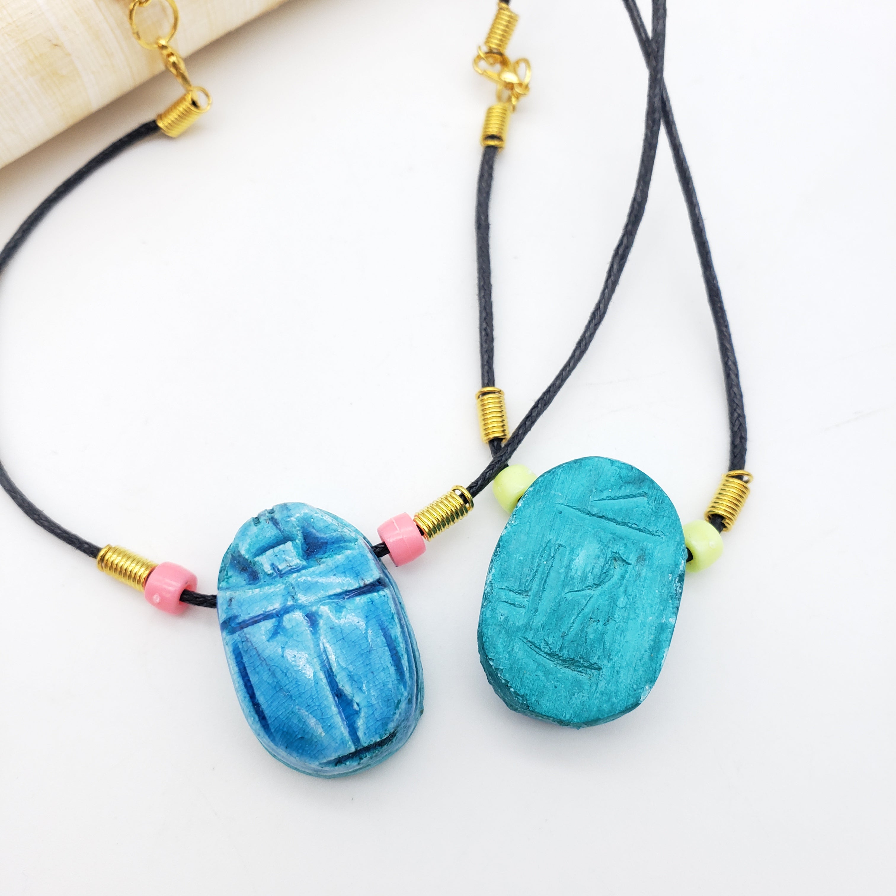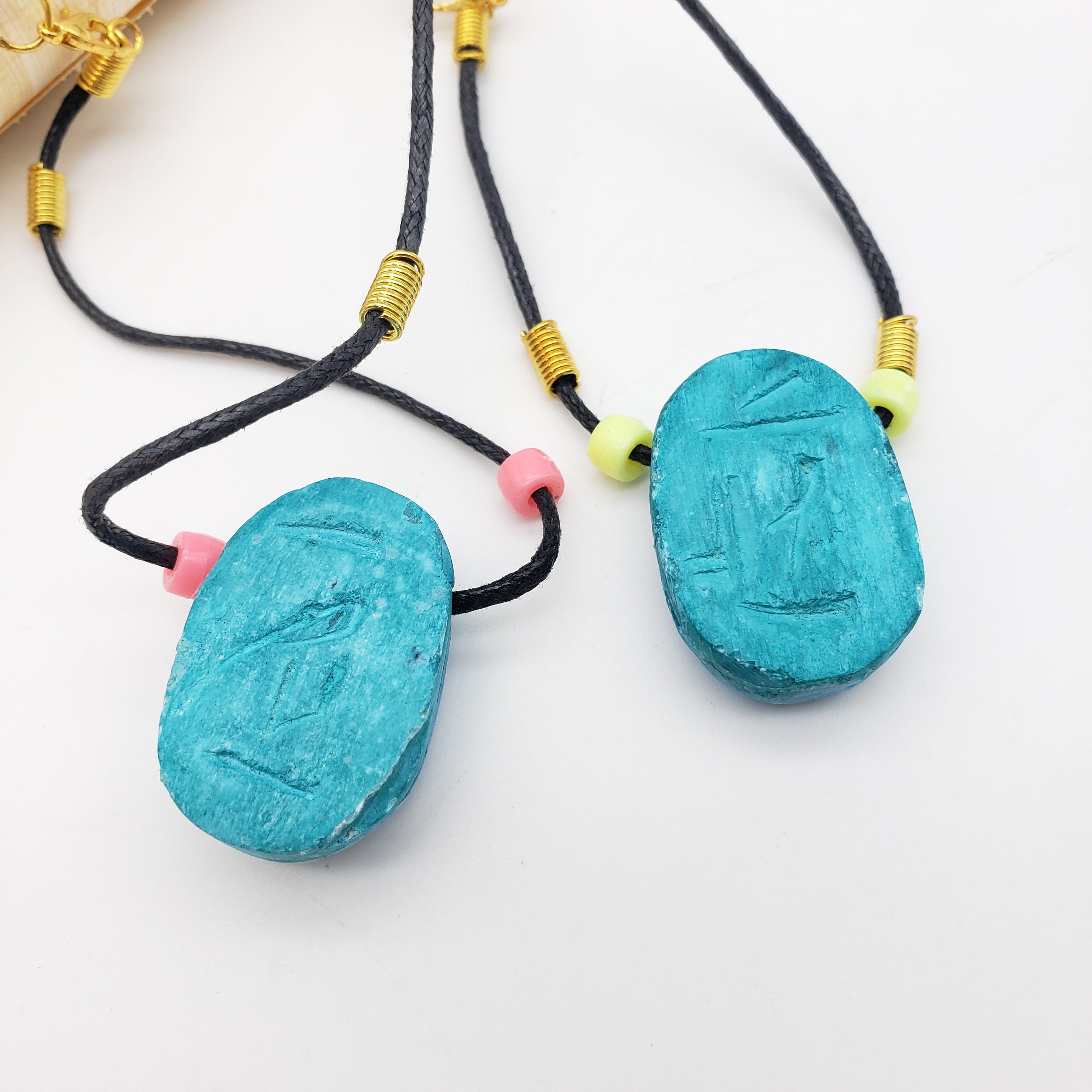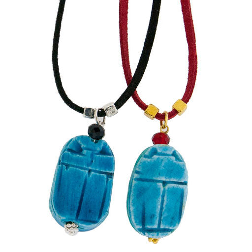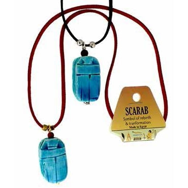 Der Skarabäus ist der beliebteste Glücksbringer des alten Ägypten. Als Symbol für Wiedergeburt, Transformation und Selbsterschaffung ist dieser Skarabäus eigentlich ein Mistkäfer, von dem die Alten glaubten, er schiebe die Sonne jeden Tag über den Himmel. Diese Halsketten sind handgefertigt, bestehen aus verschiedenen Perlen und haben einen handgeschnitzten Speckstein-Skarabäus.