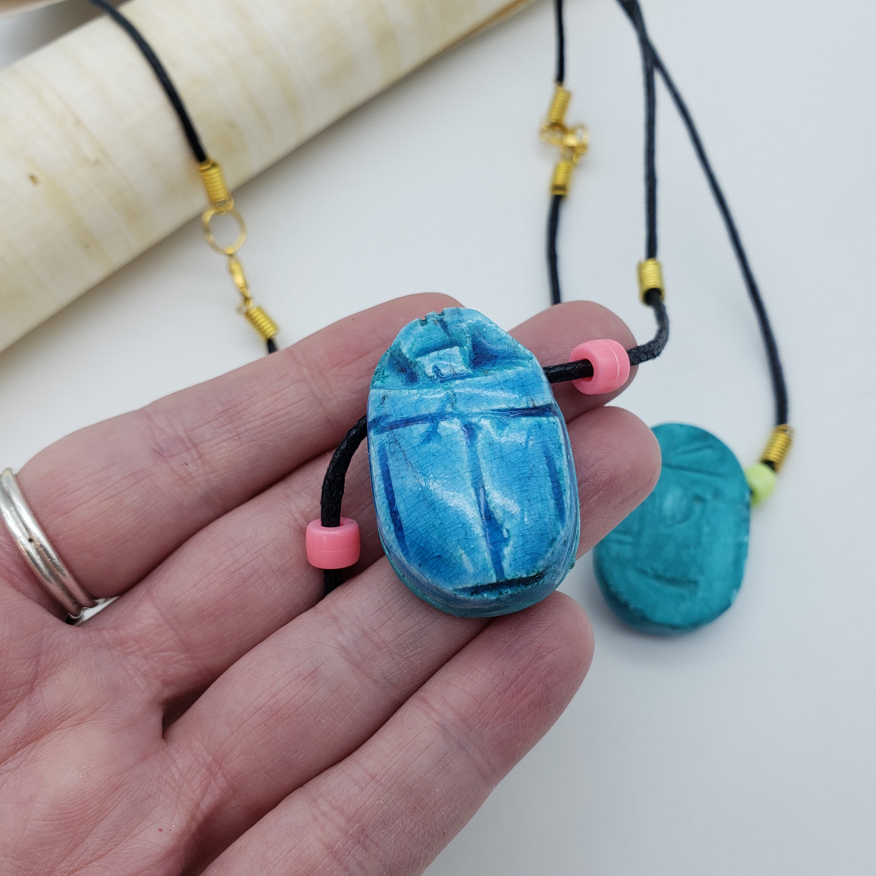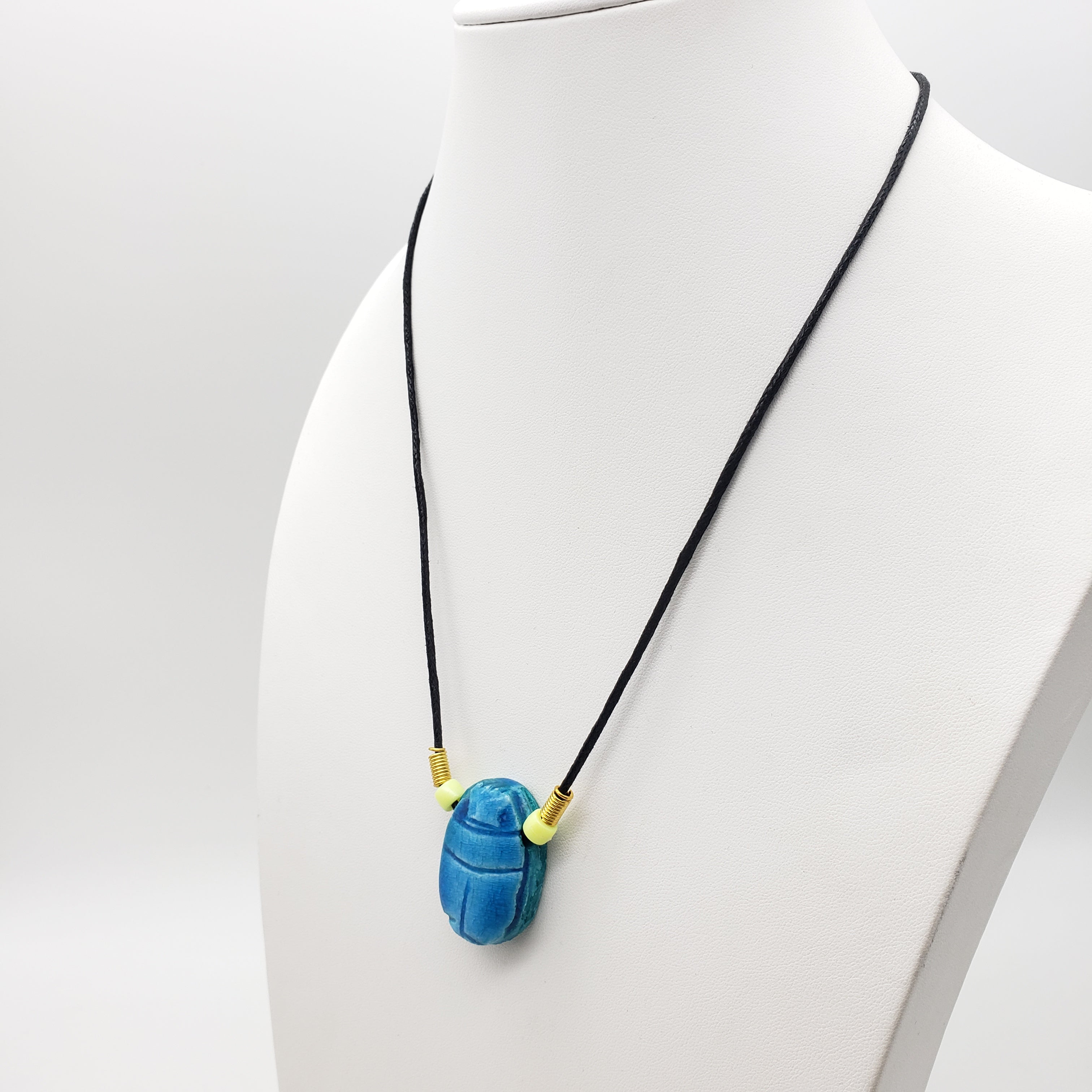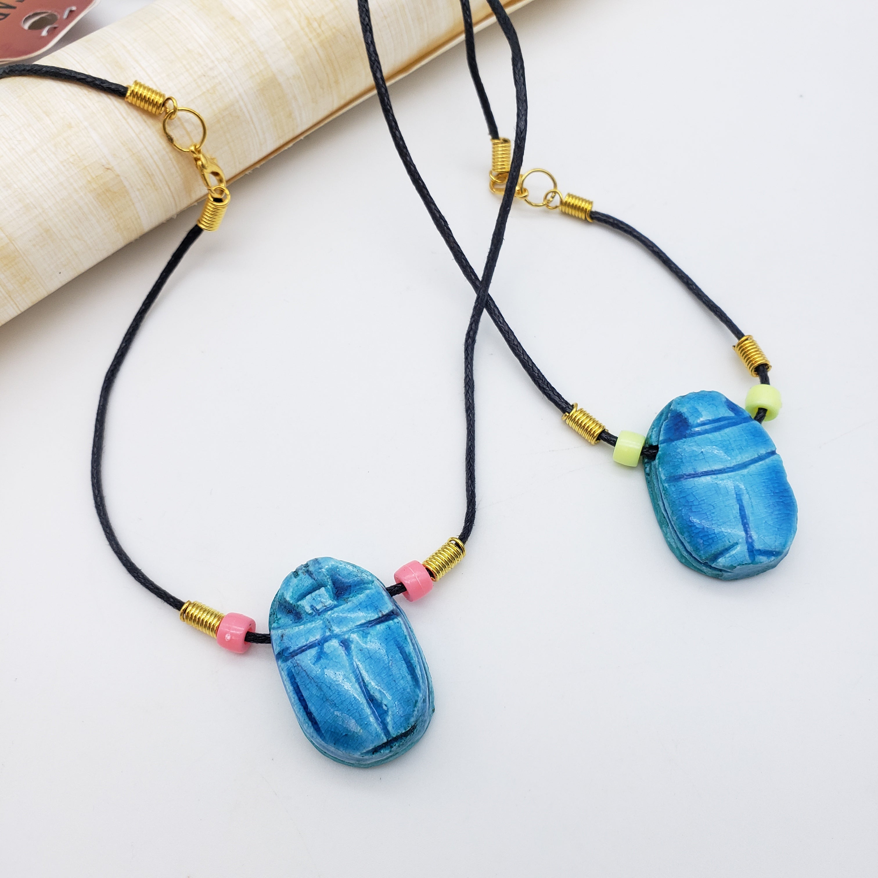 Der Skarabäus ist der beliebteste Glücksbringer des alten Ägypten. Als Symbol für Wiedergeburt, Transformation und Selbsterschaffung ist dieser Skarabäus eigentlich ein Mistkäfer, von dem die Alten glaubten, er schiebe die Sonne jeden Tag über den Himmel. Diese Halsketten sind handgefertigt, bestehen aus verschiedenen Perlen und haben einen handgeschnitzten Speckstein-Skarabäus.