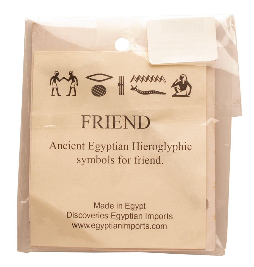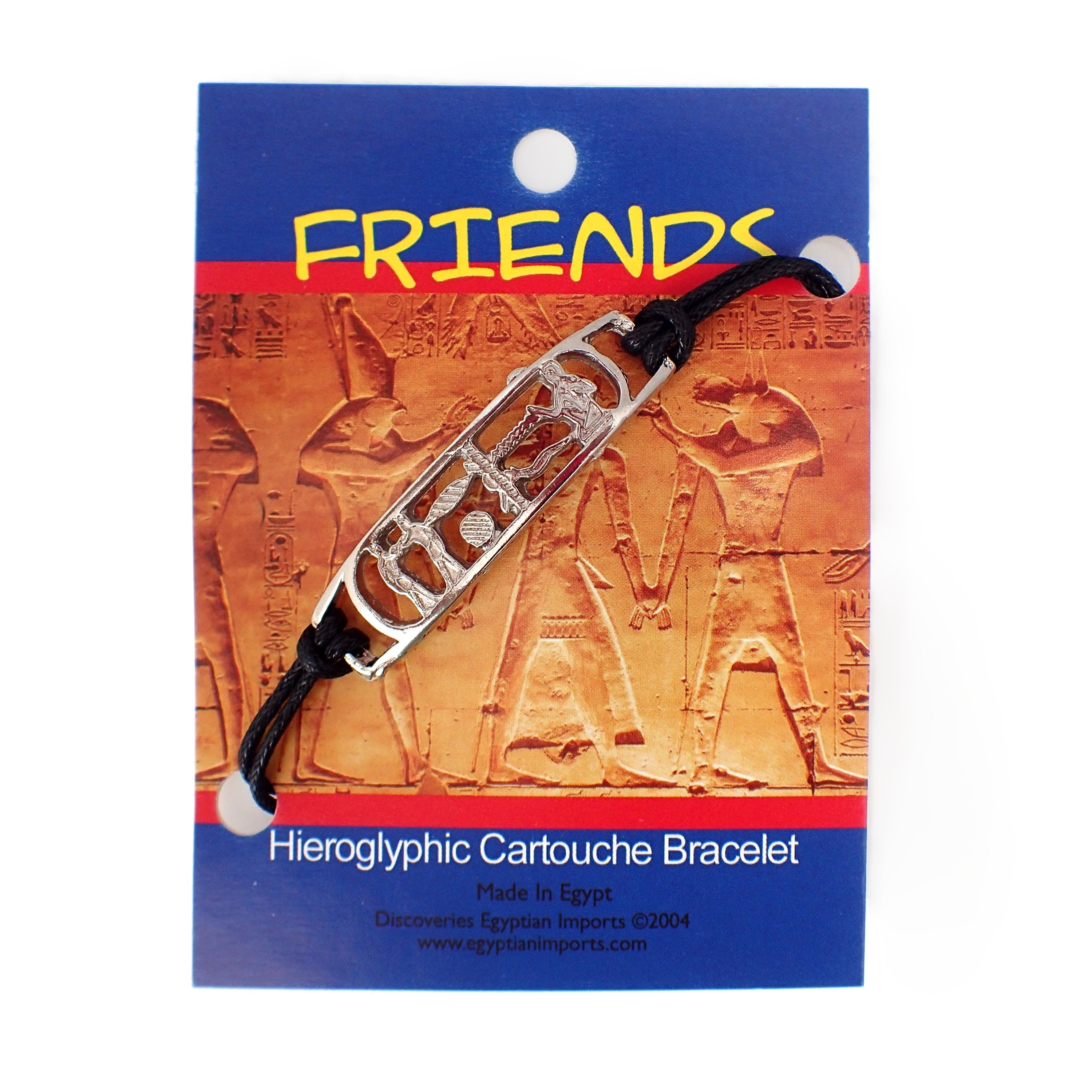 Dieses Armband buchstabiert FRIENDS in phonetischen Hieroglyphen, eingeschlossen in einer Kartusche zum ewigen Schutz. Die Übersetzung ist auf der Rückseite der Verpackung enthalten. Dieses Zinnarmband ist an einer Kunstlederschnur befestigt. Das Armband ist 8 Zoll lang und hat einen Karabinerverschluss.