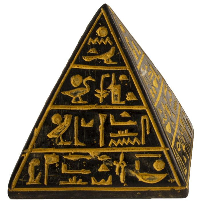 Diese ägyptische Pyramidenstatue wurde in Luxor, Ägypten, gefertigt! Sie ist mit handgeschnitzten Hieroglyphensymbolen auf allen Seiten verziert. Gelbes Pigment wurde hinzugefügt, um die Details hervorzuheben. Die Statue wird in einer Schachtel mit Hieroglyphenmotiven geliefert – perfekt zum Verschenken! Sie ist 8,9 cm hoch.