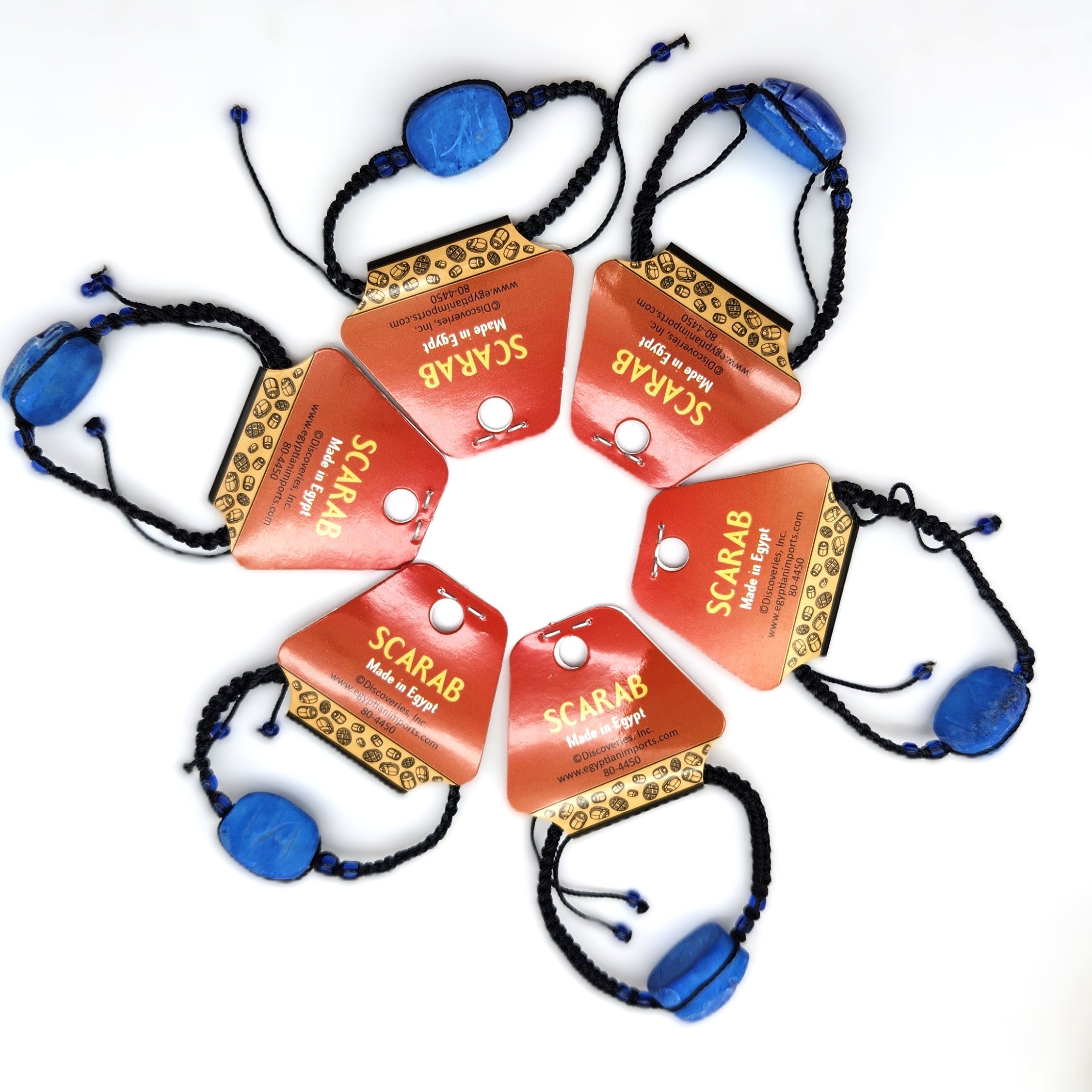 Hand-carved from soapstone and then glazed with a high-gloss blue finish, these bracelets are perfect for kids of all ages. The scarab is the most popular symbol of good luck from ancient Egypt. Symbol of rebirth, transformation, and self-creation, this scarab is actually a dung beetle that the ancients believed pushed the sun across the sky each day. Your order will come with one bracelet.