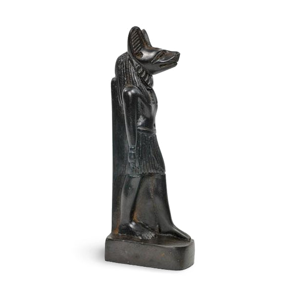 This statue portrays Anubis, the ancient Egyptian God of the Underworld. Anubis is credited with inventing mummification and is the protector of the deceased. This 4.75-inch-tall statue is packaged in box with decorative hieroglyphic design and an information card. Made in Luxor, Egypt!