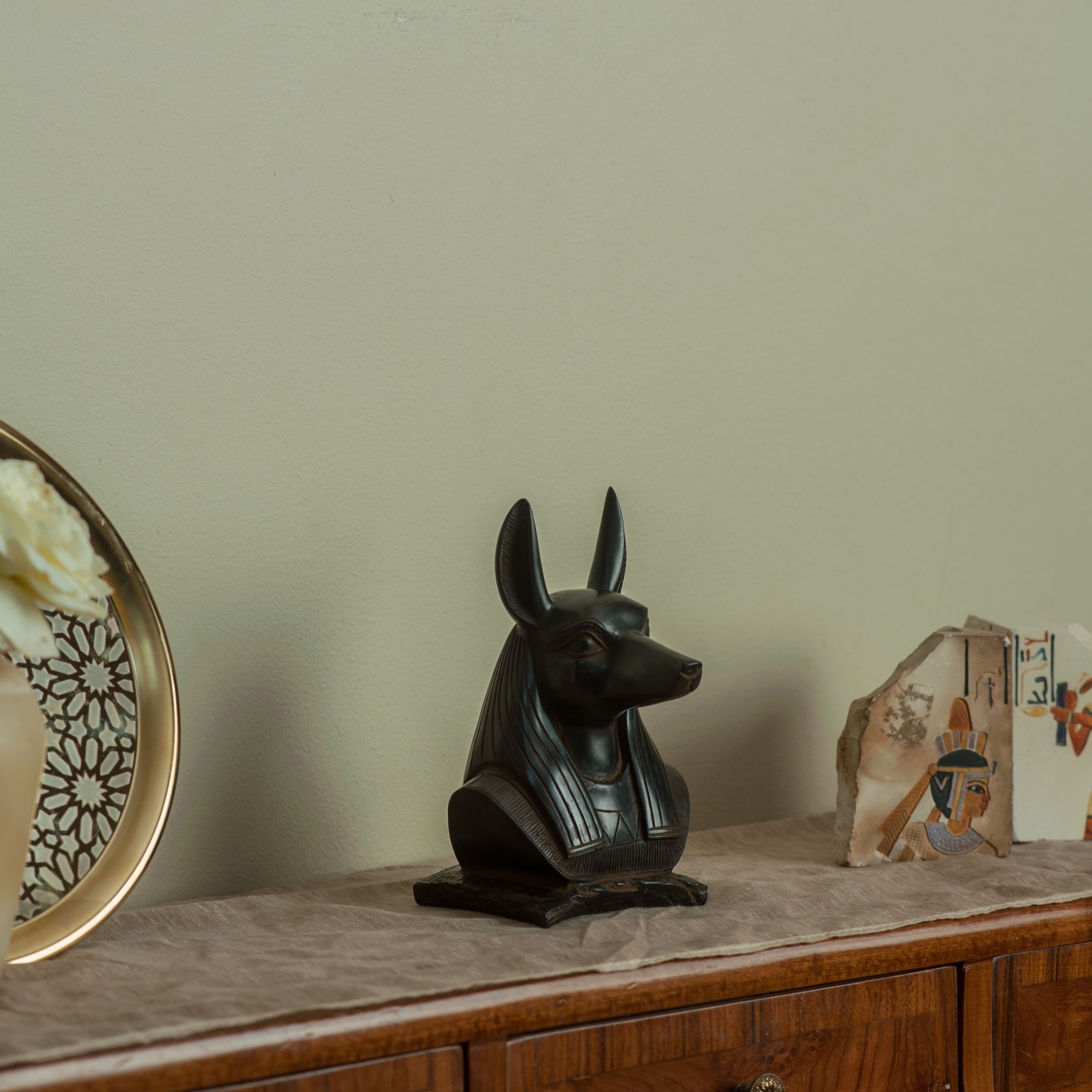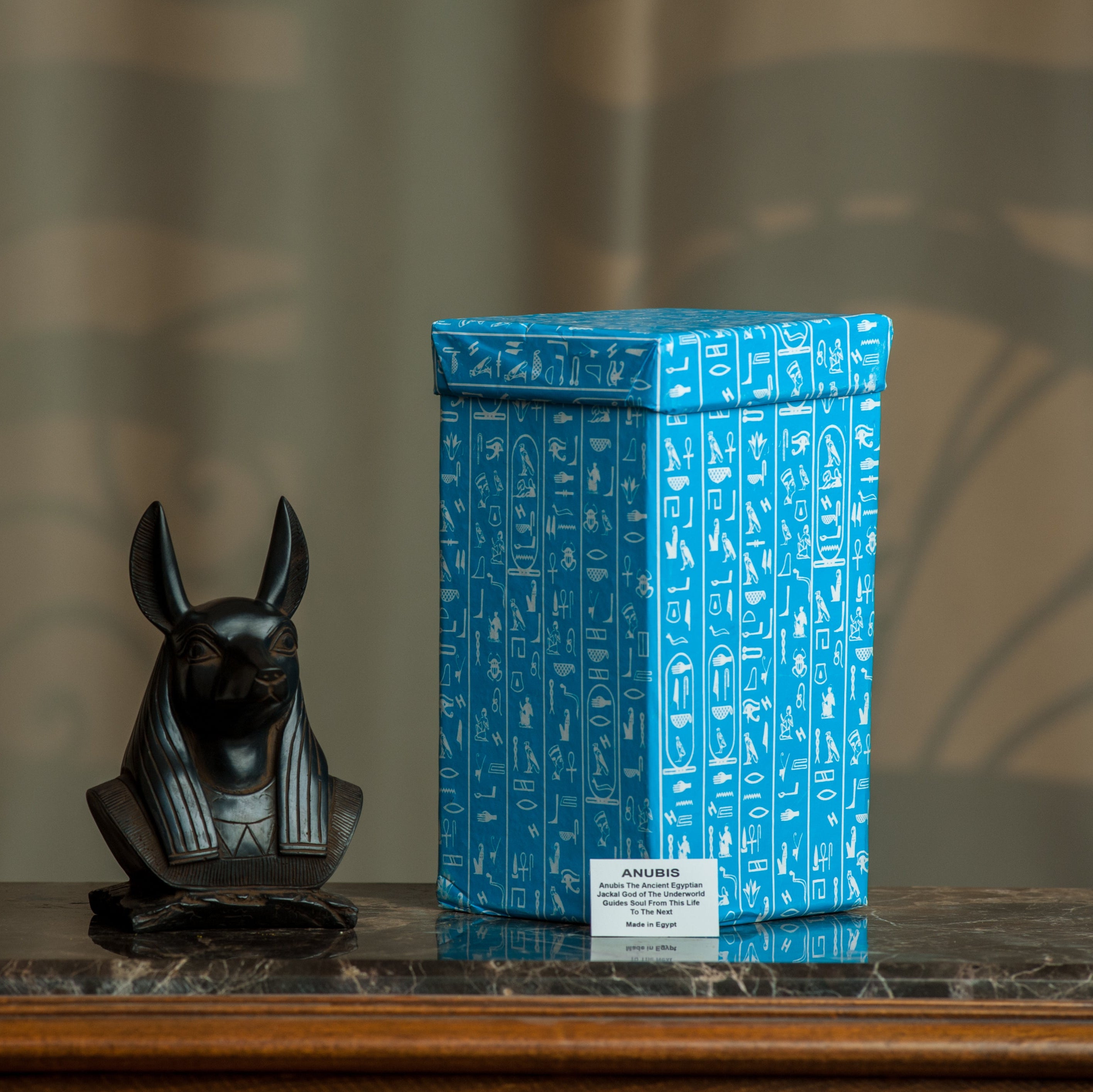 This statue portrays the bust of Anubis, the ancient Egyptian God of the Underworld. Anubis is credited with inventing mummification and is the protector of the deceased. The statue is 4.25 inches wide by 3 inches and 7 inches tall. It is surprisingly lightweight for its size. This statue is packaged in a box with a decorative hieroglyphic design and an information card. Made in Luxor, Egypt!