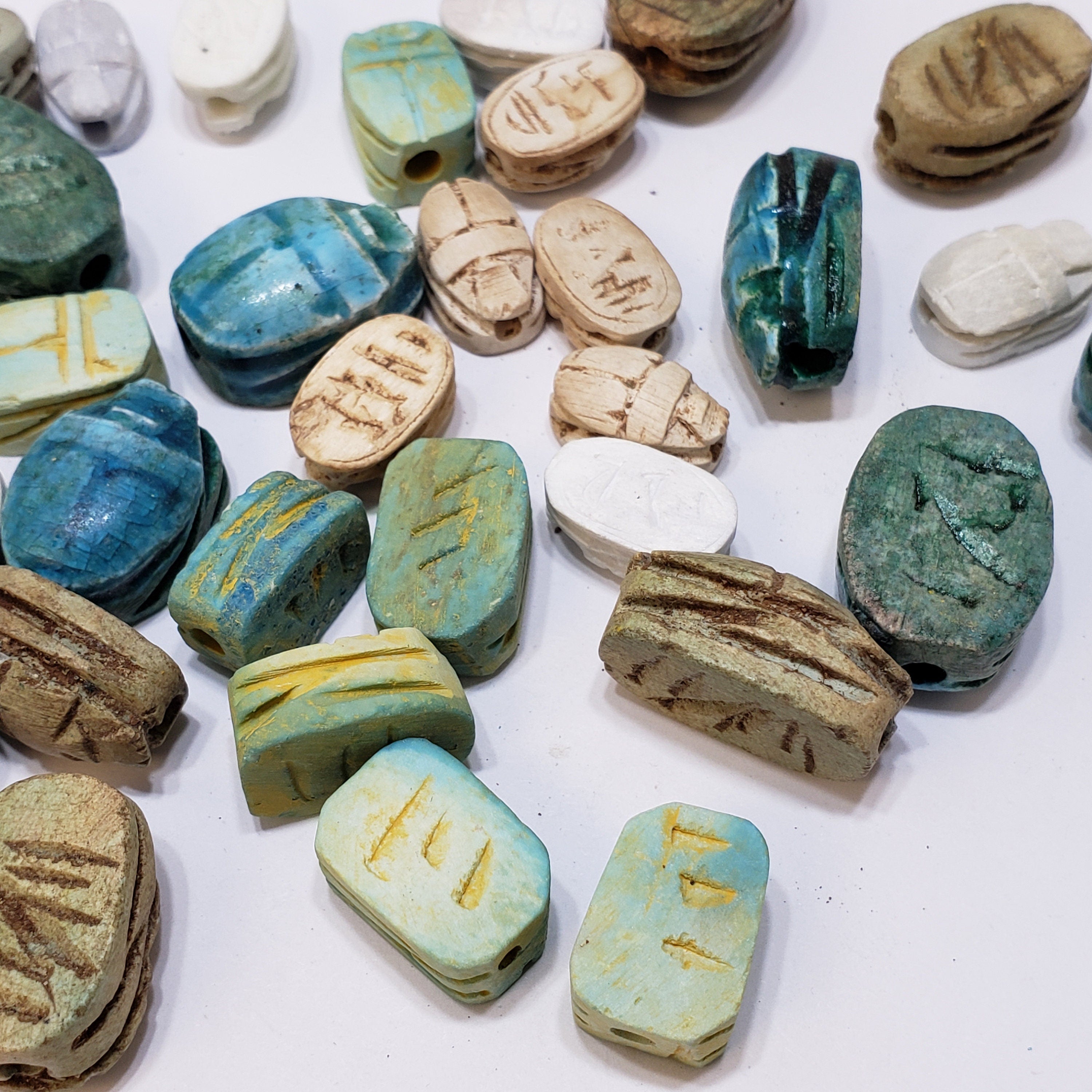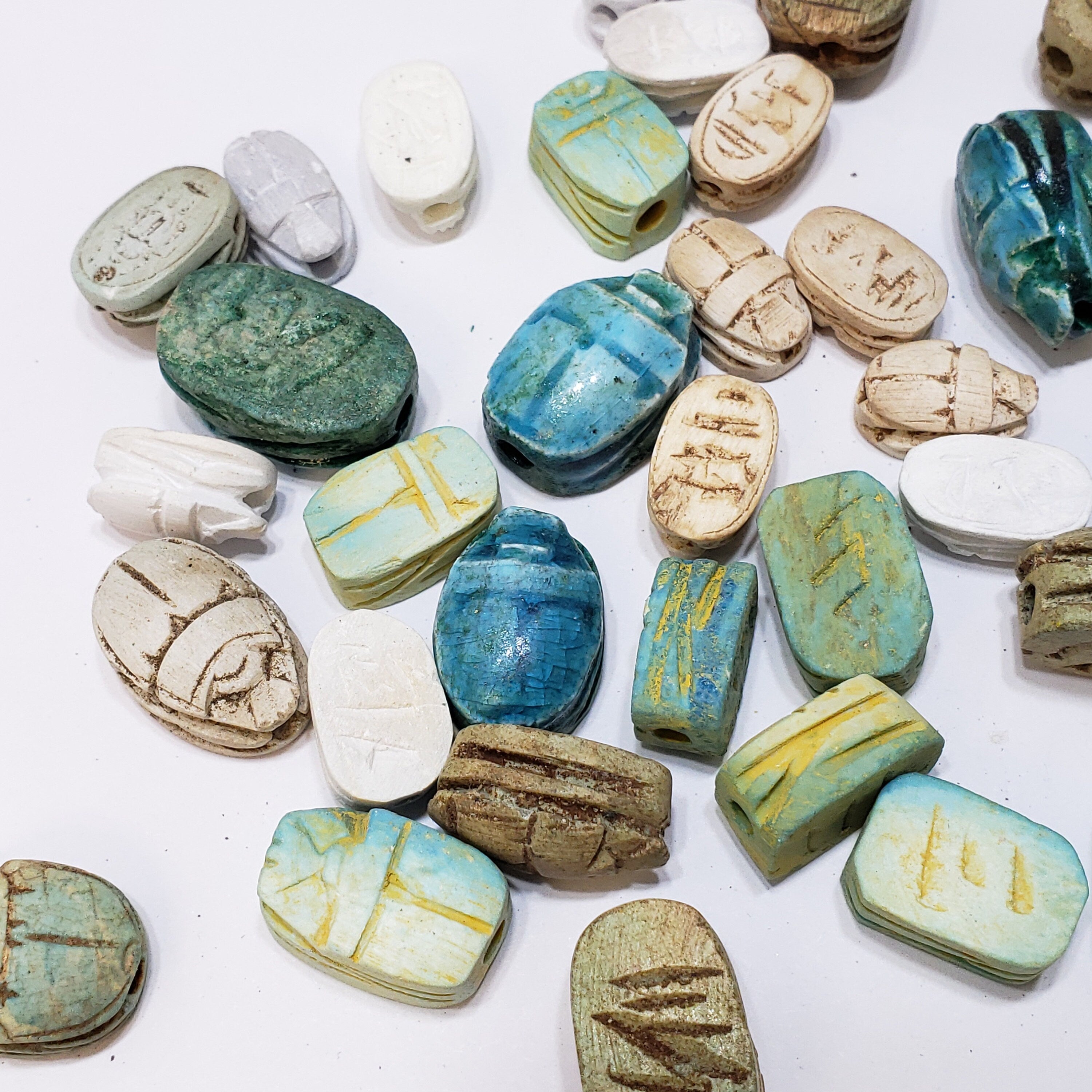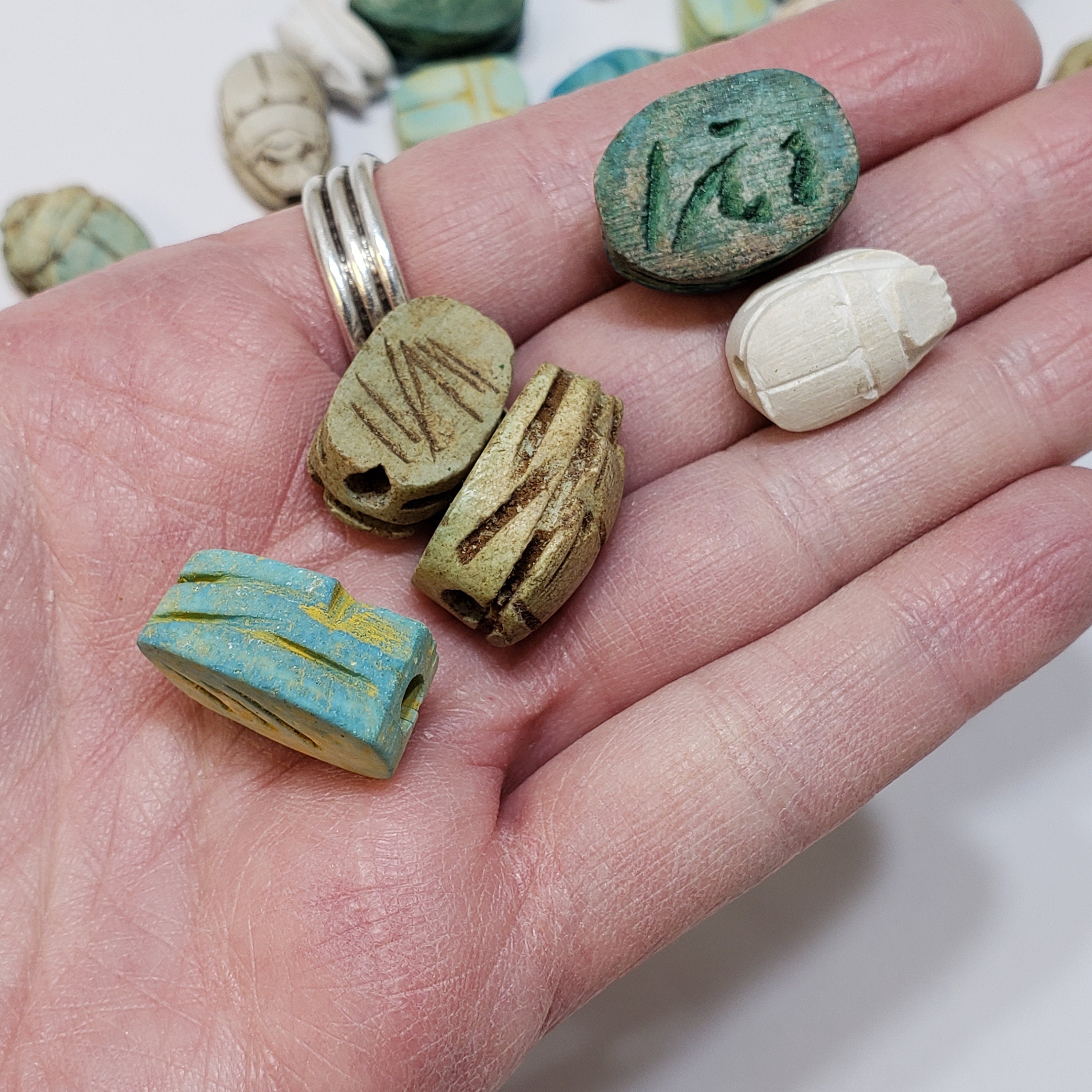 The ancient Egyptians believed that the scarab was the earthly manifestation of the god Khepri, and pushed the sun across the sky each day, only to disappear and magically reappear the next morning. As such, it is a powerful amulet for self-creation, transformation, and rebirth. They were worn or carried by the living, and also buried with the dead to help them on their way to the afterlife. The base was usually inscribed with designs or hieroglyphs to form an impression seal.