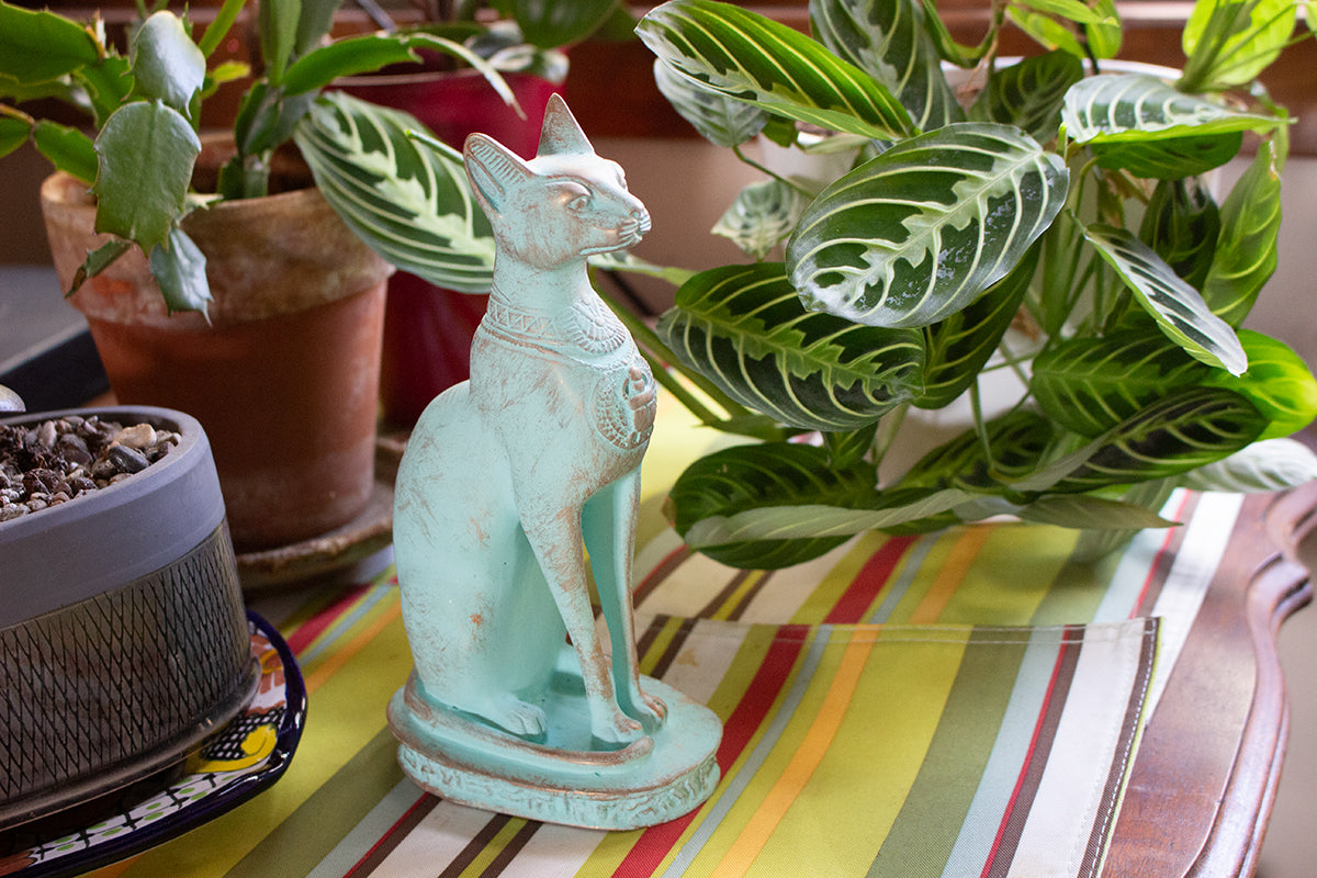 The goddess of plenty and joy, the cat Bastet represents the protective aspect of female power. Bastet is the daughter of Ra, the Sun God. She is aligned with the lioness and also represents the attributes of ferocious protection. Bastet is associated with the home and dancing. The Egyptians found cats fascinating, even regarding them as godlike. Because cats were deeply respected, they were often mummified and even buried in great tombs with their owners.