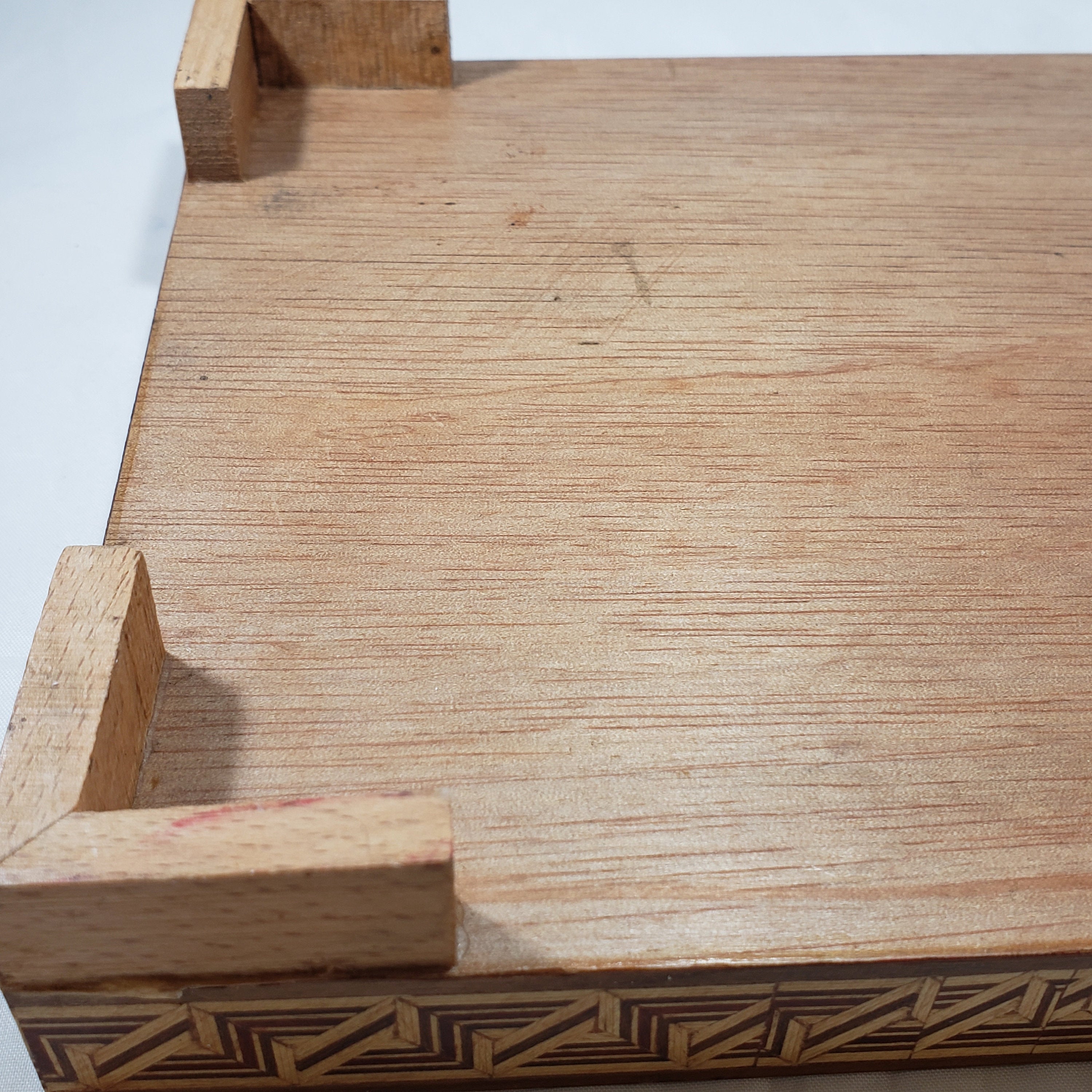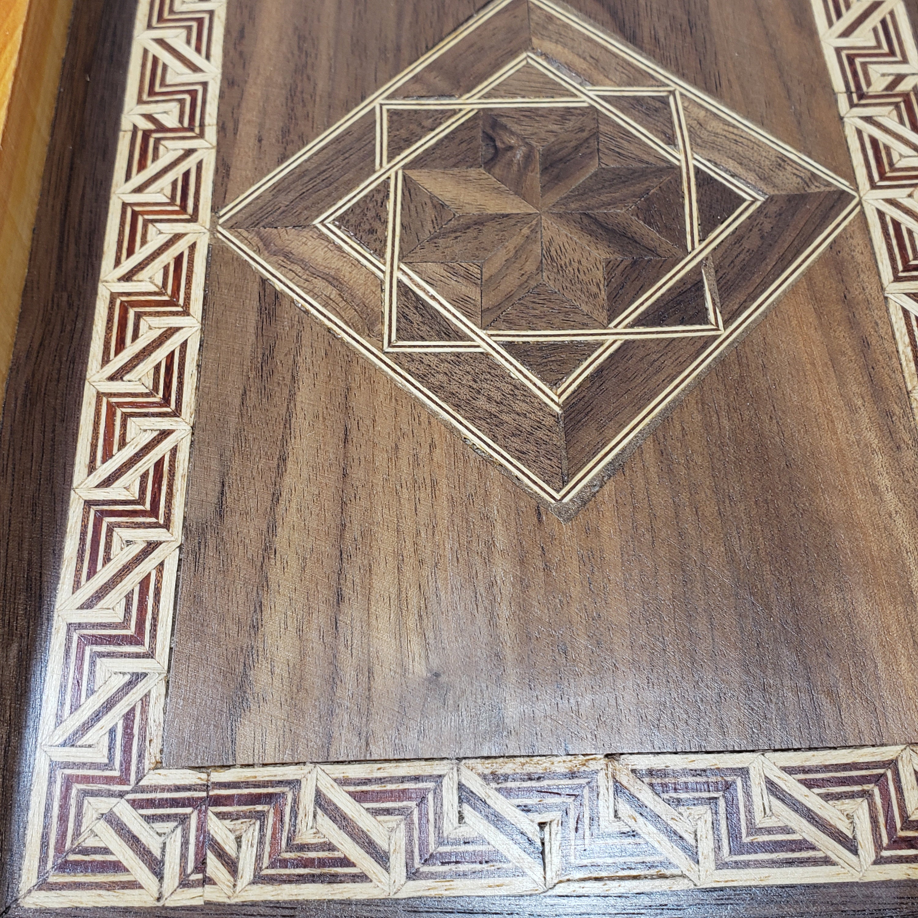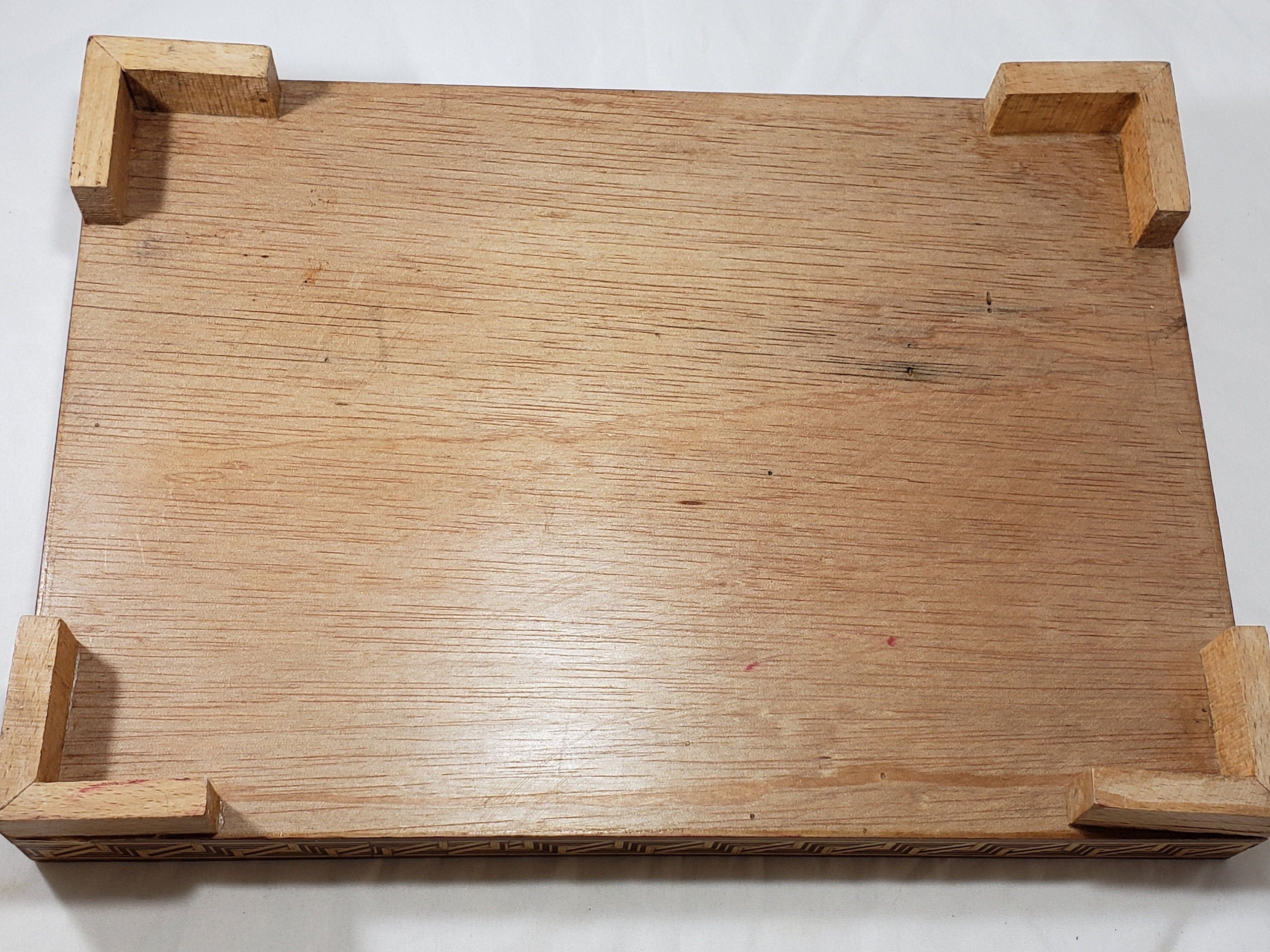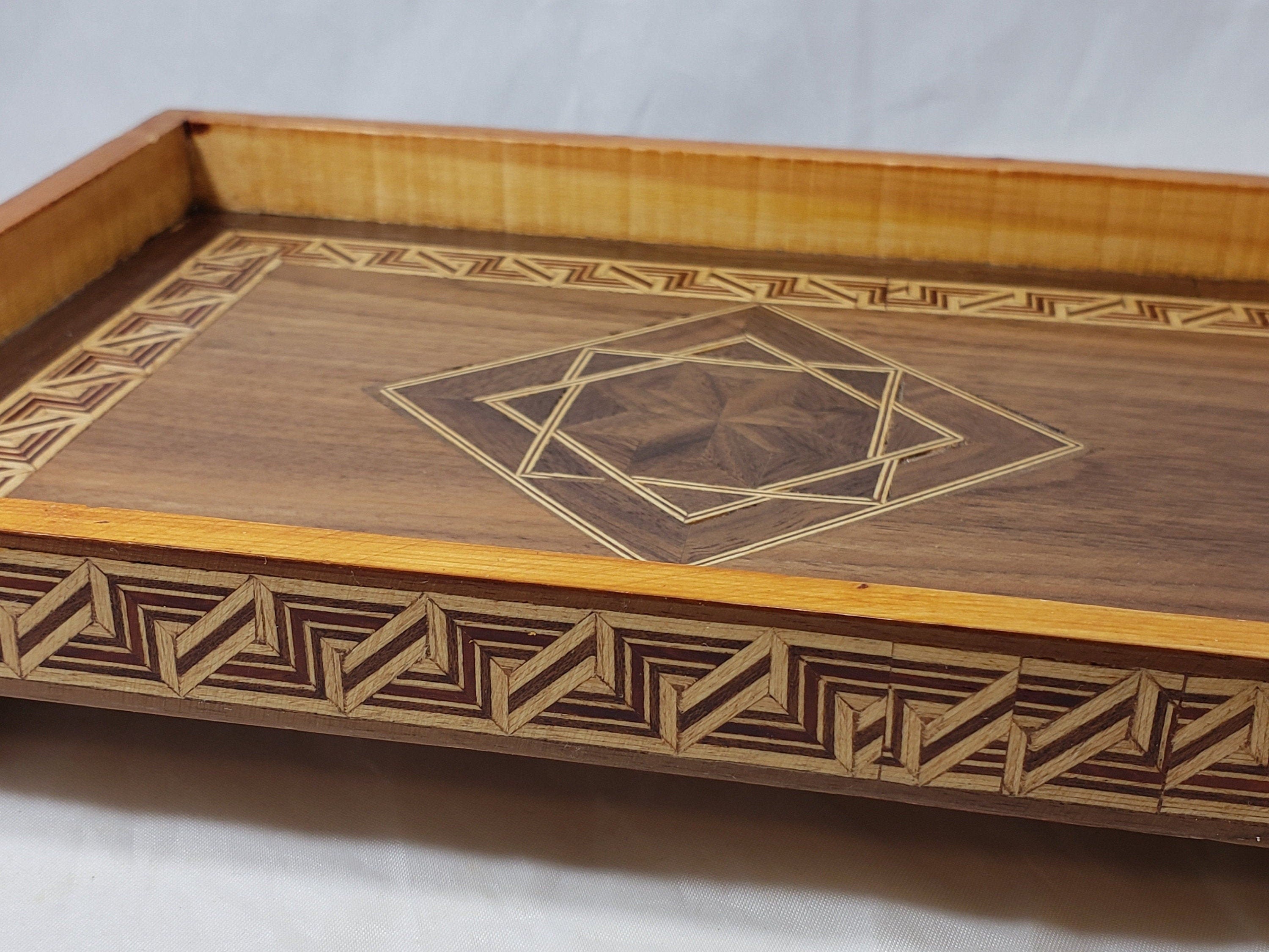 This wooden tray was handmade in Egypt with a decorative inlay. The tray sits on small, sturdy legs. There is a protective glaze on the wood.