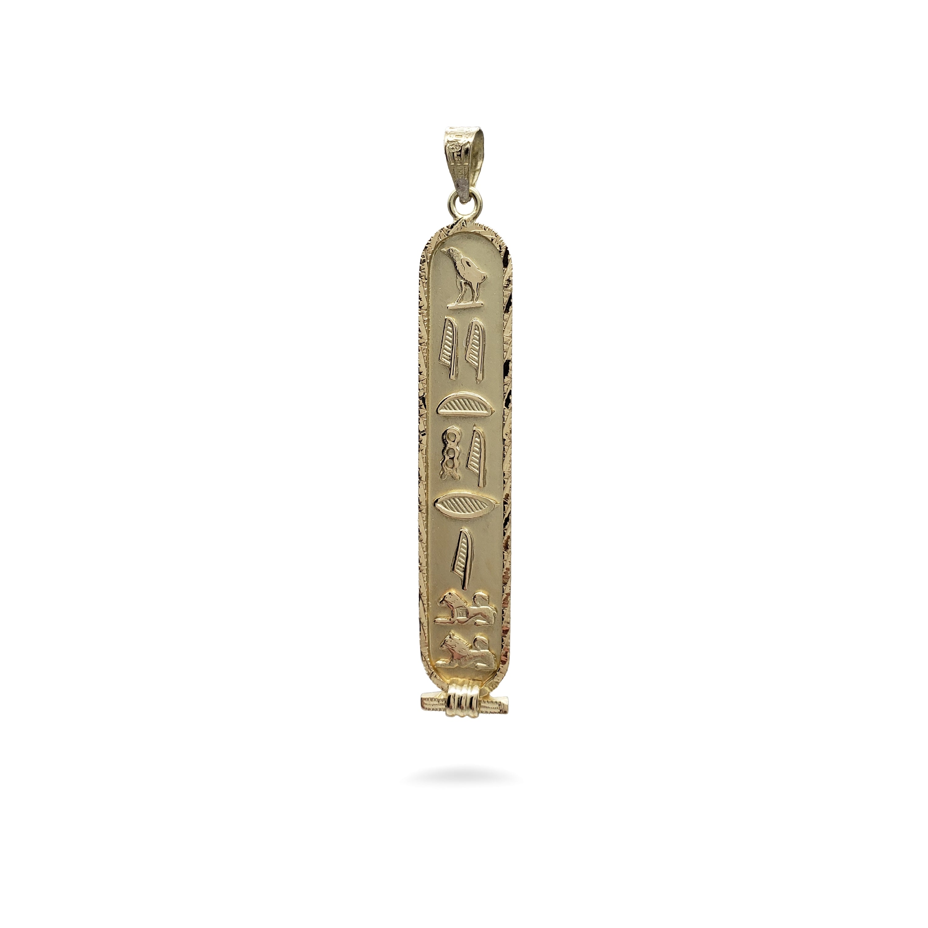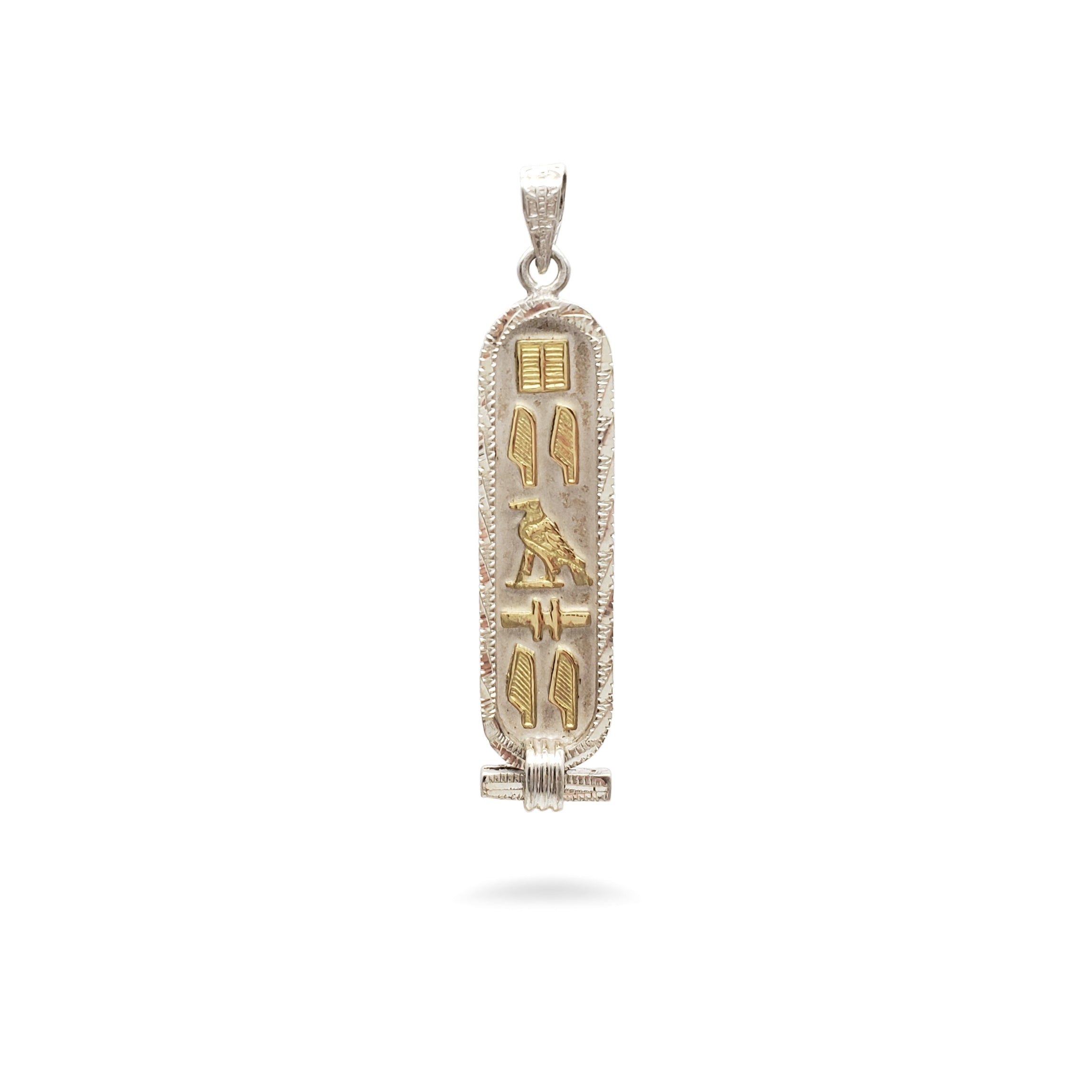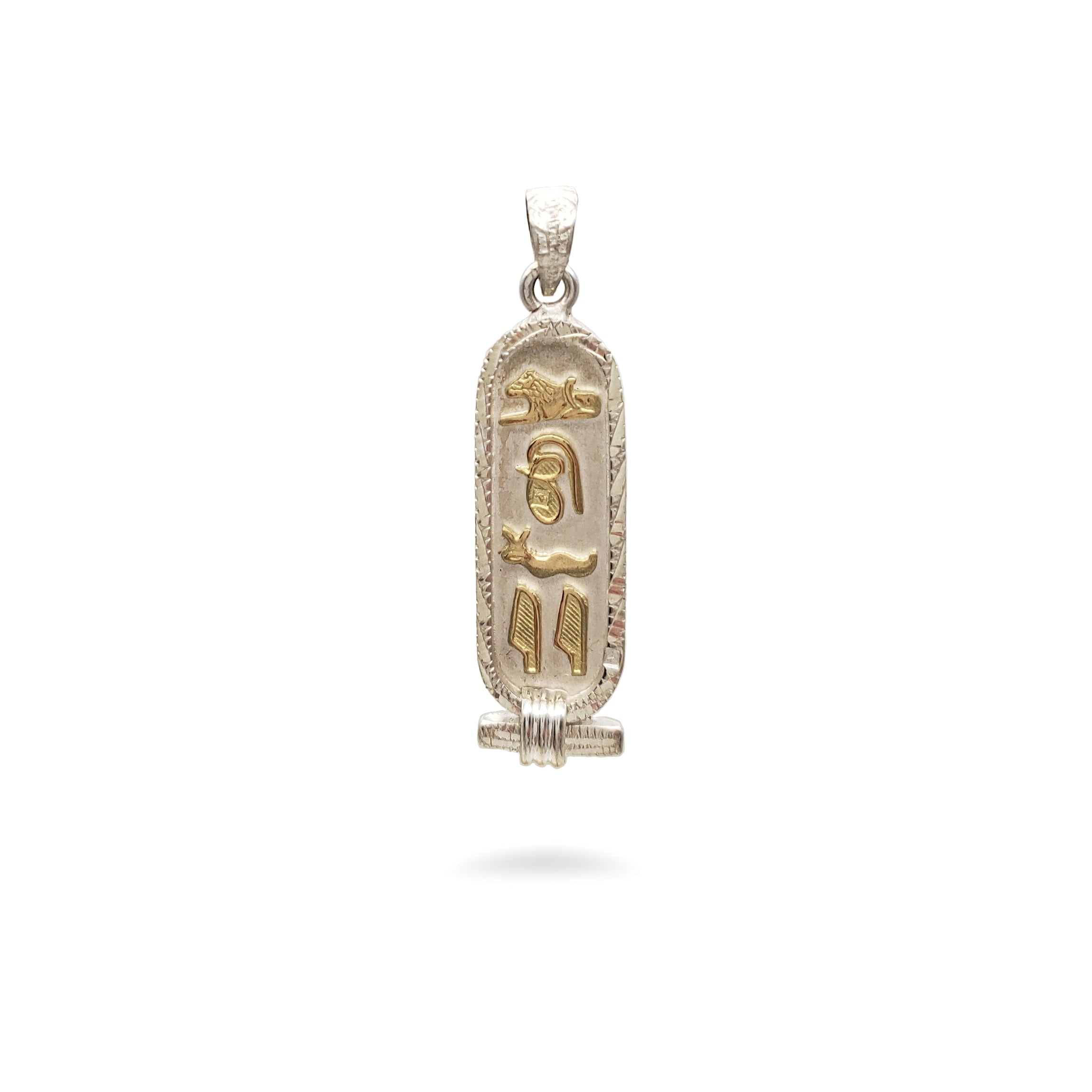 Translate any name into hieroglyphs on this beautiful Egyptian Cartouche with a decorative diamond-cut edge! Your traditional pendant will be custom-made, by hand, in the ancient bazaar of Khan el Khalili in the heart of Cairo. Choose from 14K Gold, Sterling Silver, 18K Gold, or a mix of Sterling Silver and 14K Gold. Silver cartouches come with an 18" sterling silver box chain. Includes a hieroglyphic alphabet chart and a jewelry box with a velvet bag.