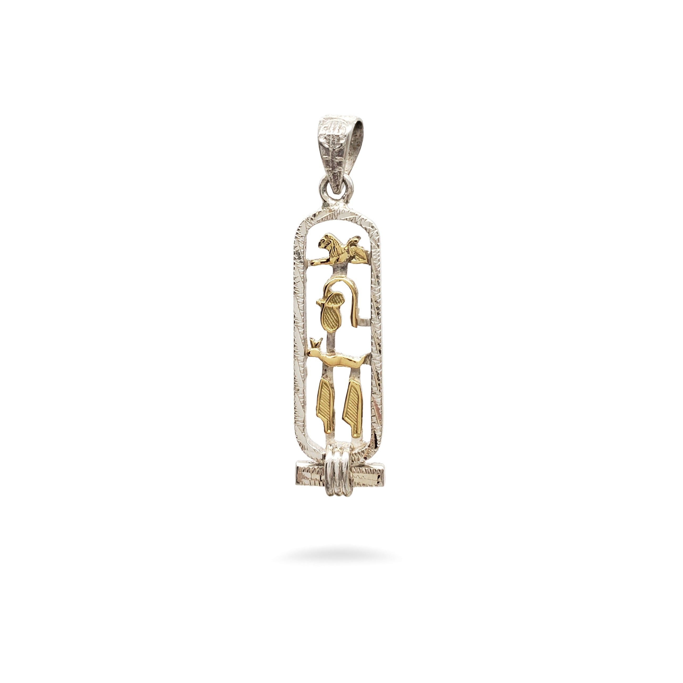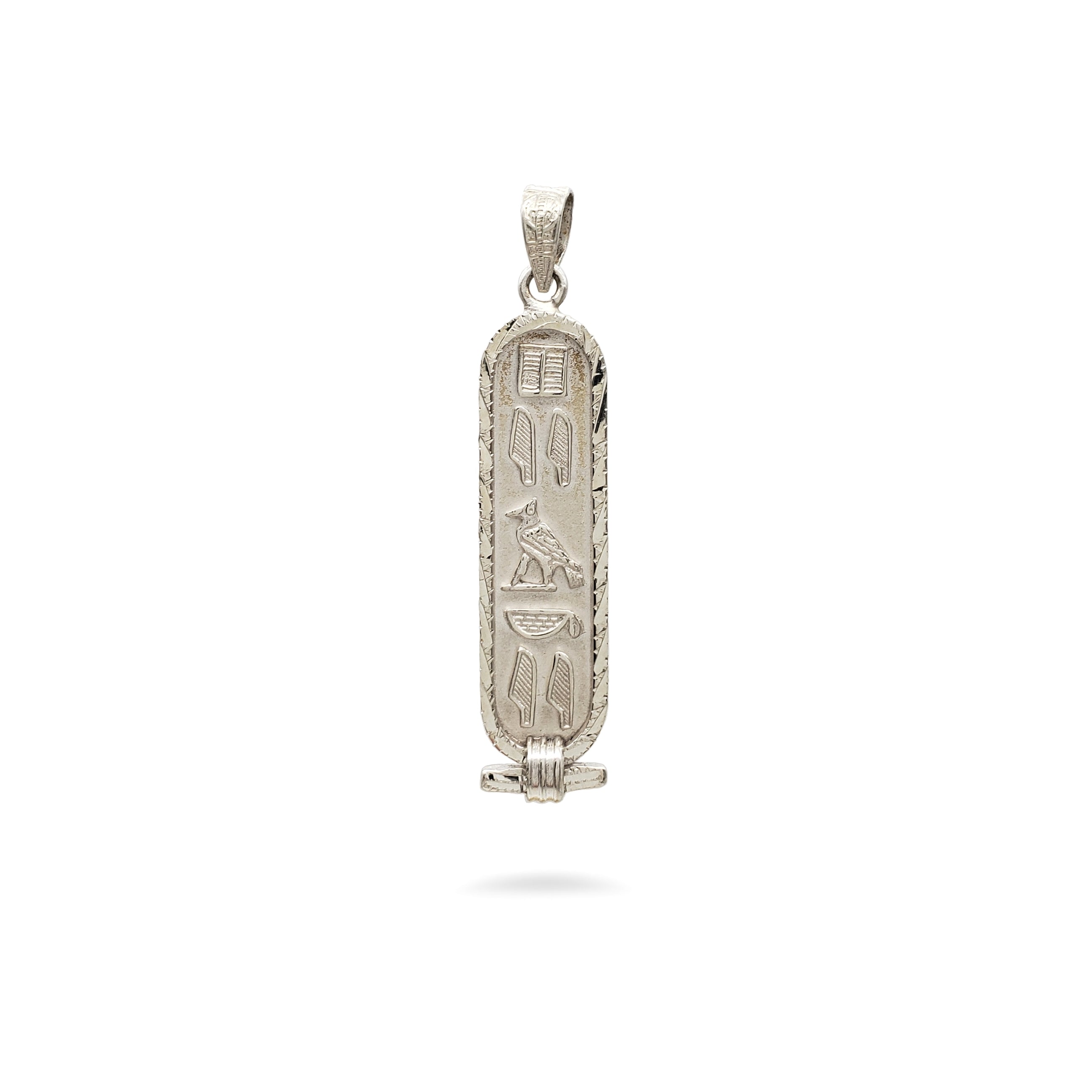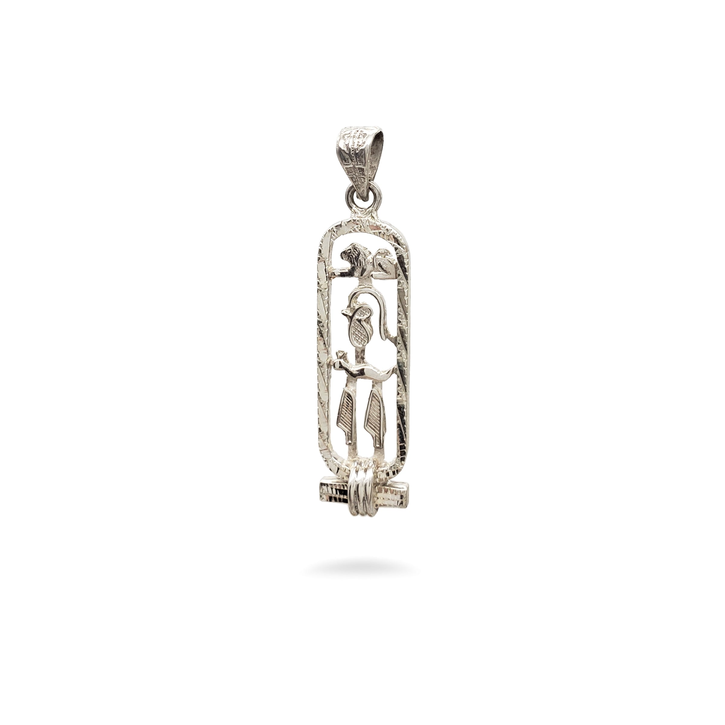 Translate any name into hieroglyphs on this beautiful Egyptian Cartouche with a decorative diamond-cut edge! Your traditional pendant will be custom-made, by hand, in the ancient bazaar of Khan el Khalili in the heart of Cairo. Choose from 14K Gold, Sterling Silver, 18K Gold, or a mix of Sterling Silver and 14K Gold. Silver cartouches come with an 18" sterling silver box chain. Includes a hieroglyphic alphabet chart and a jewelry box with a velvet bag.