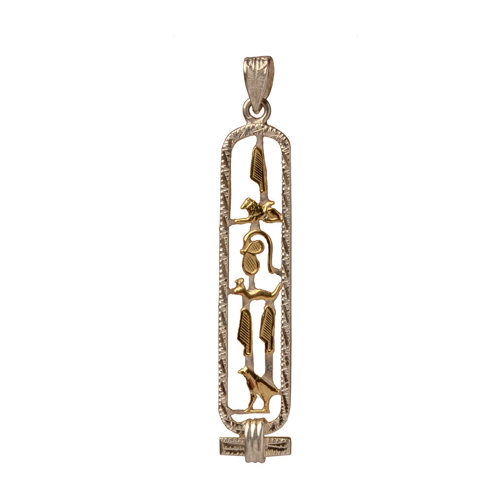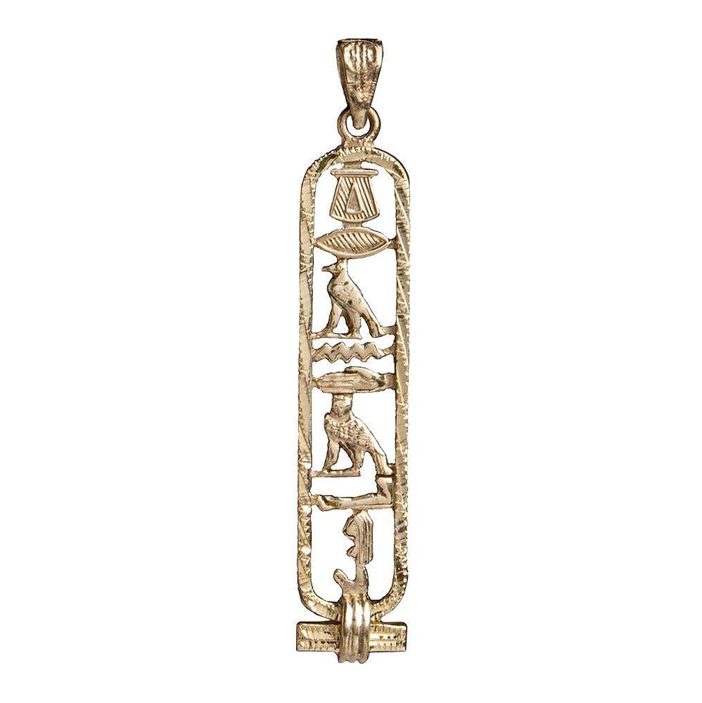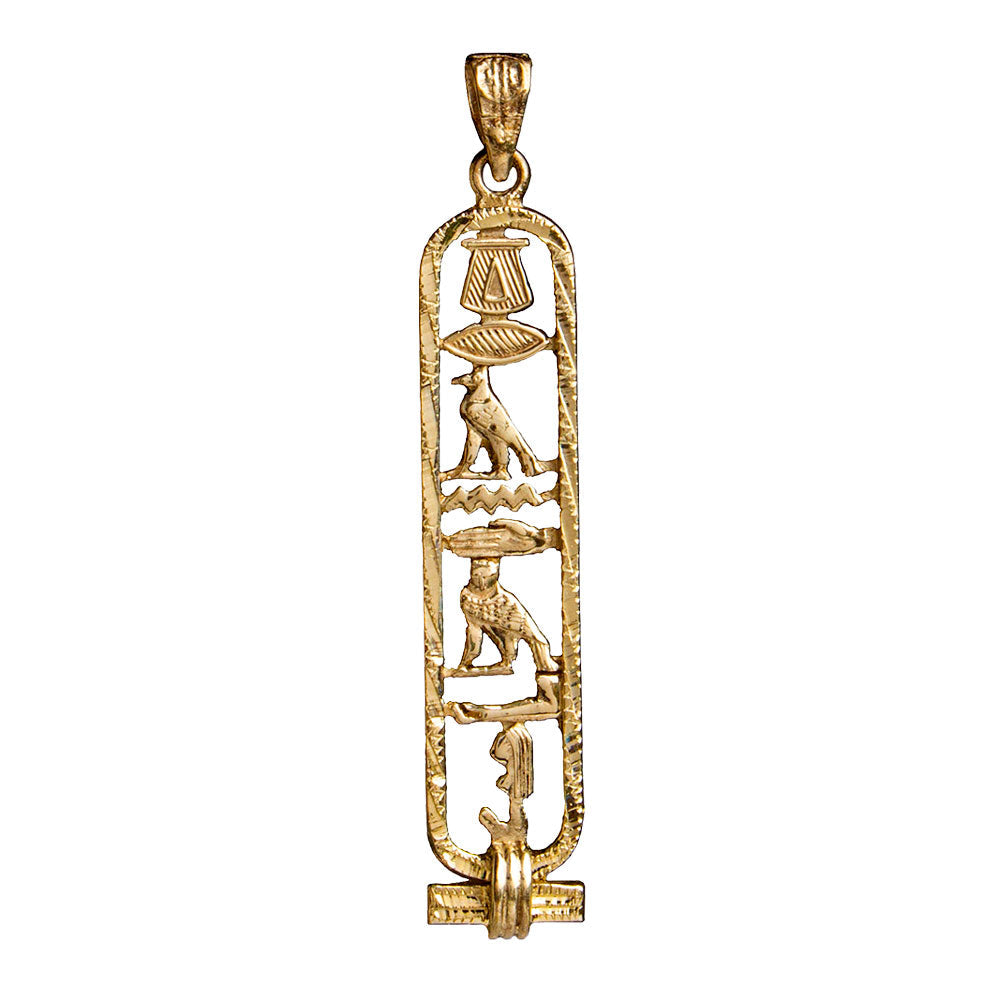 Translate any name into hieroglyphs on this beautiful Egyptian Cartouche with a decorative diamond-cut edge! Your traditional pendant will be custom-made, by hand, in the ancient bazaar of Khan el Khalili in the heart of Cairo. Choose from 14K Gold, Sterling Silver, 18K Gold, or a mix of Sterling Silver and 14K Gold. Silver cartouches come with an 18" sterling silver box chain. Includes a hieroglyphic alphabet chart and a jewelry box with a velvet bag.
