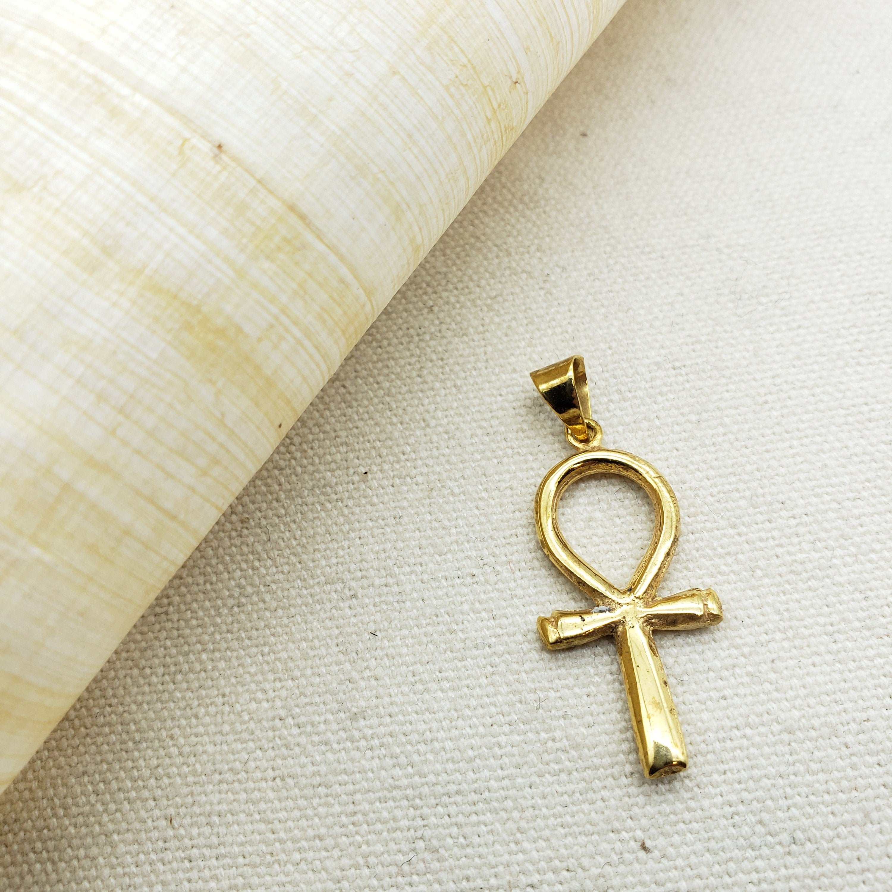 This Egyptian gold plated ankh pendant was made in Cairo, Egypt! The pendant is gold plated metal. There are some small oxidization spots on the pendants. Please see the photos for more details.