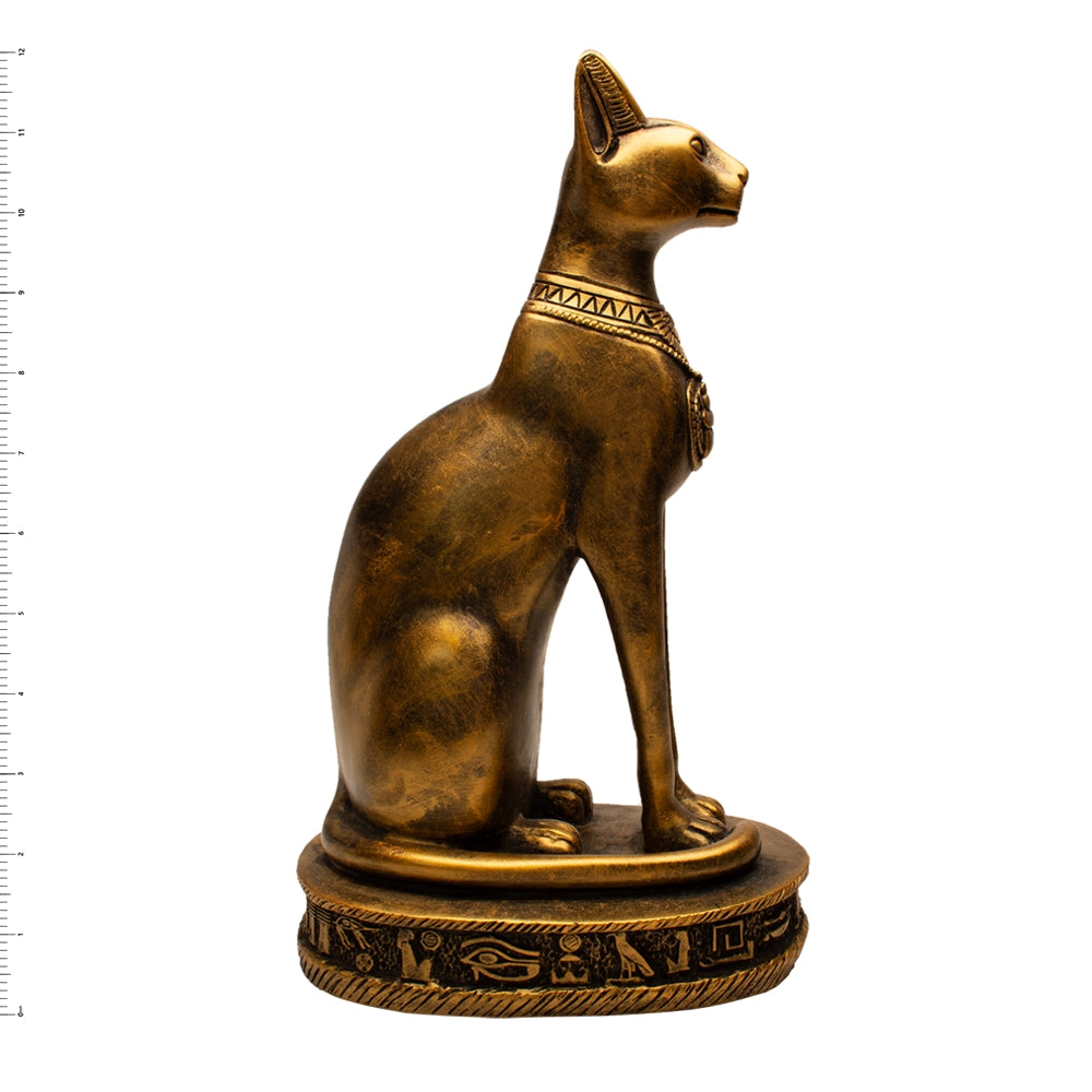 This statue features the likeness of the Egyptian cat Goddess Bastet. It was handmade from polymer with a hand-painted finish. The cat goddess is seated on top of a base with a hieroglyphic design. Made in Luxor, Egypt!