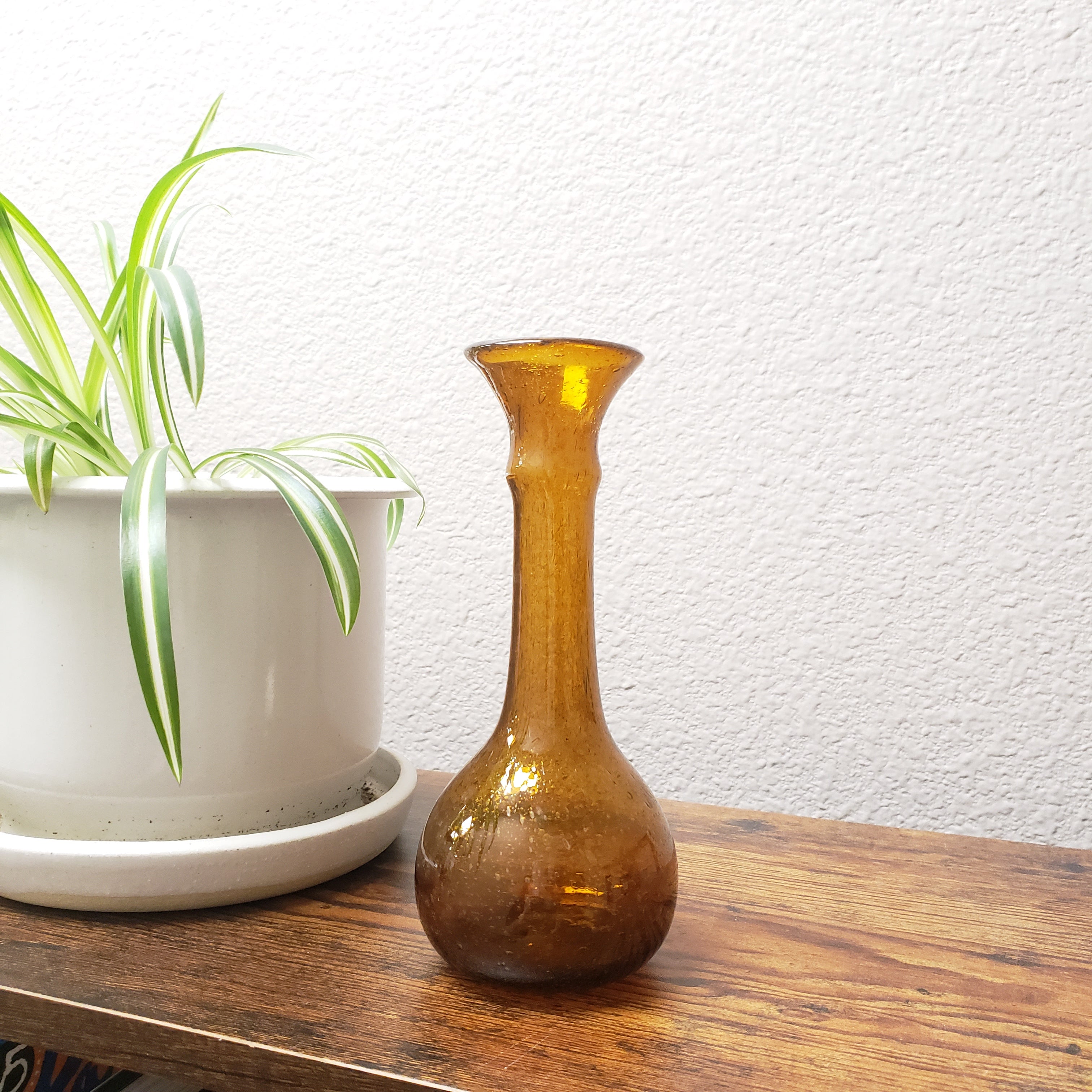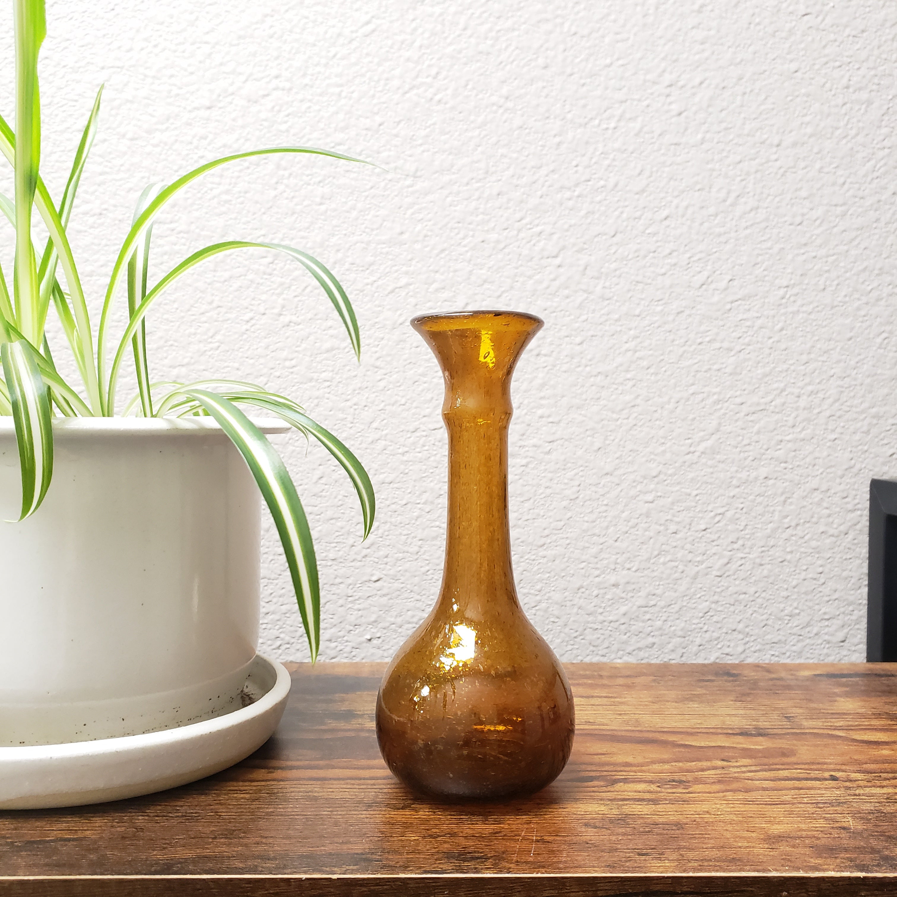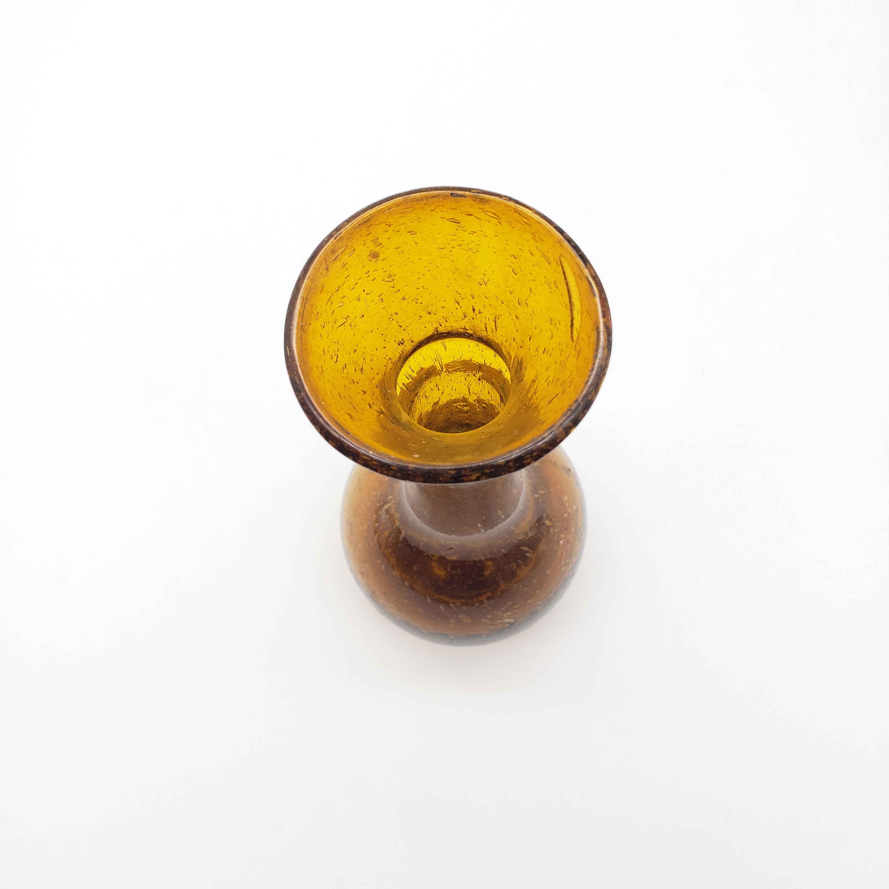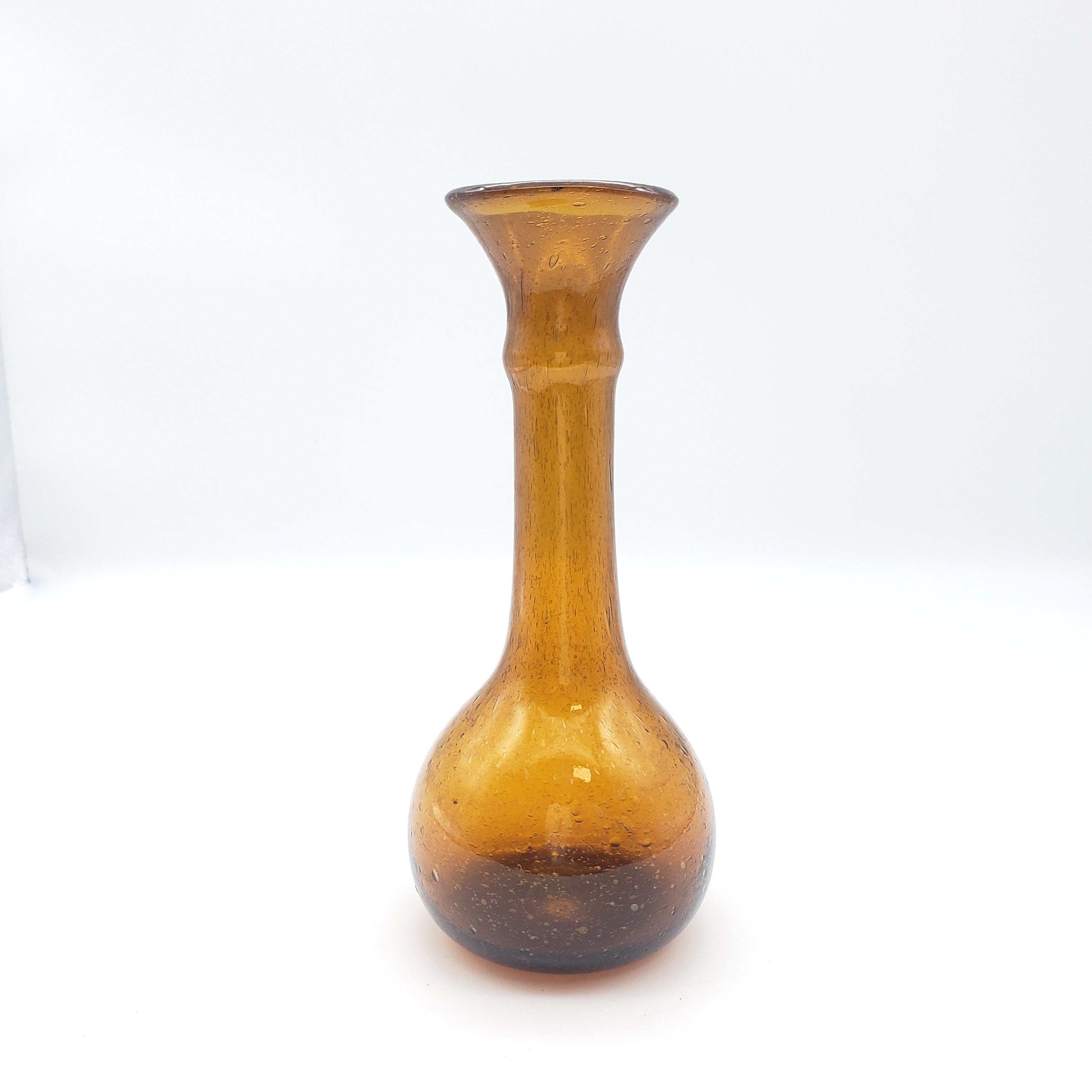 This transparent brown glass vase was handblown. It is made from recycled soda bottles. The style is known as "baladi", the Arabic word for "local". Made in Egypt!