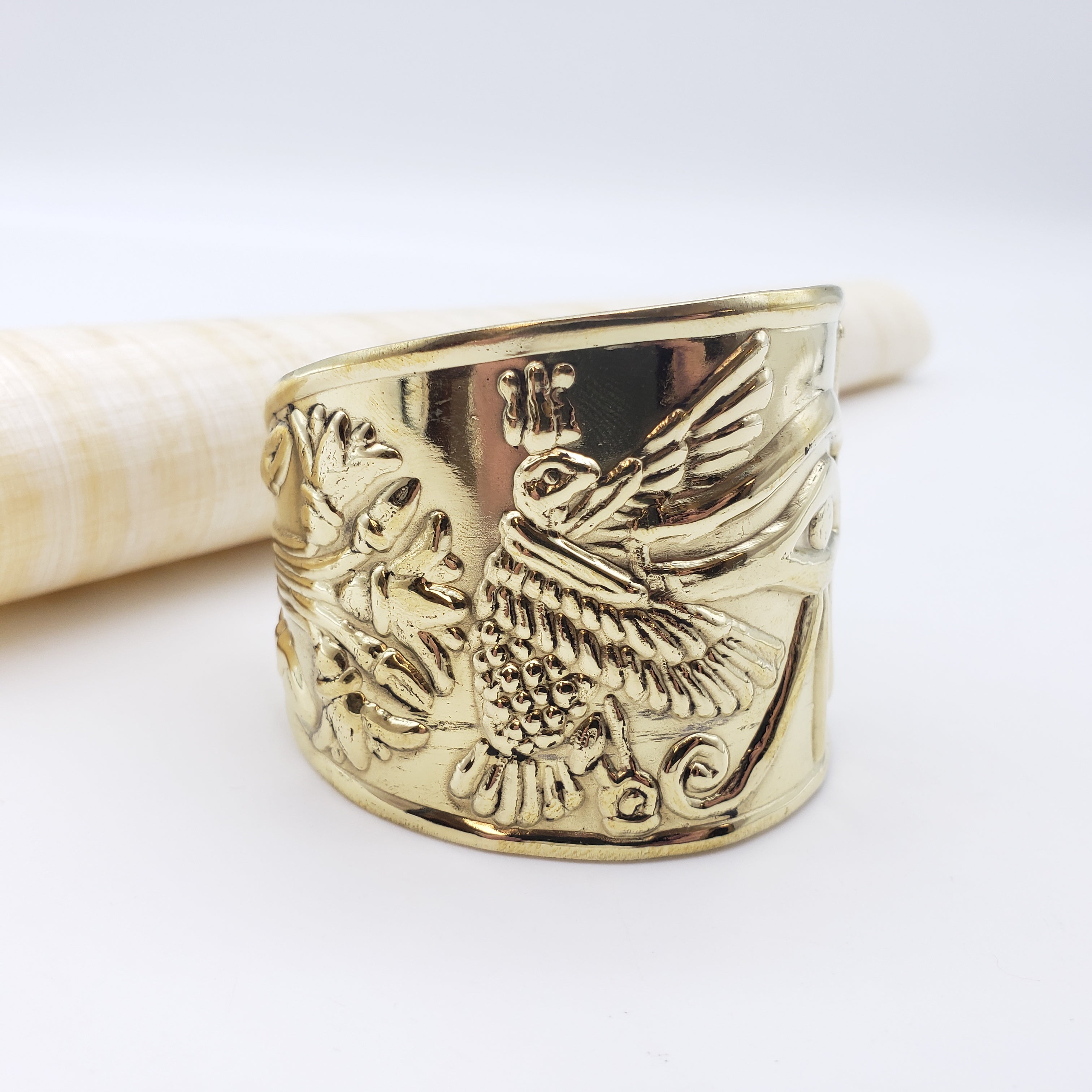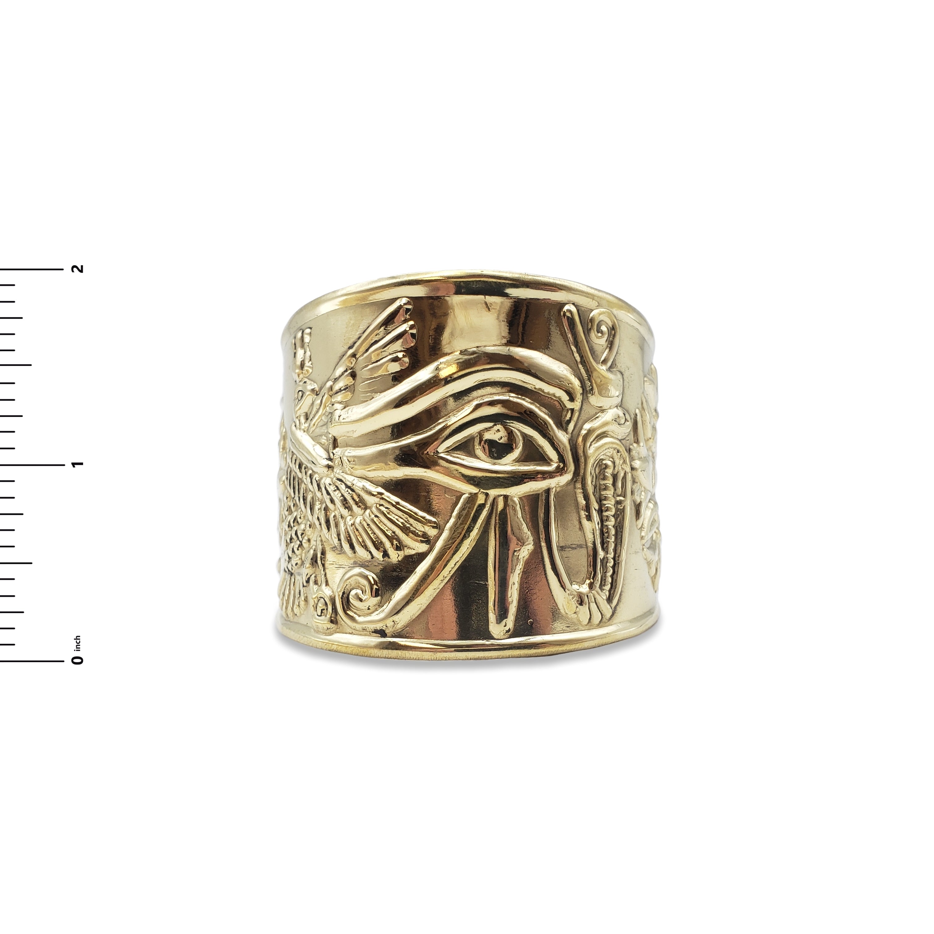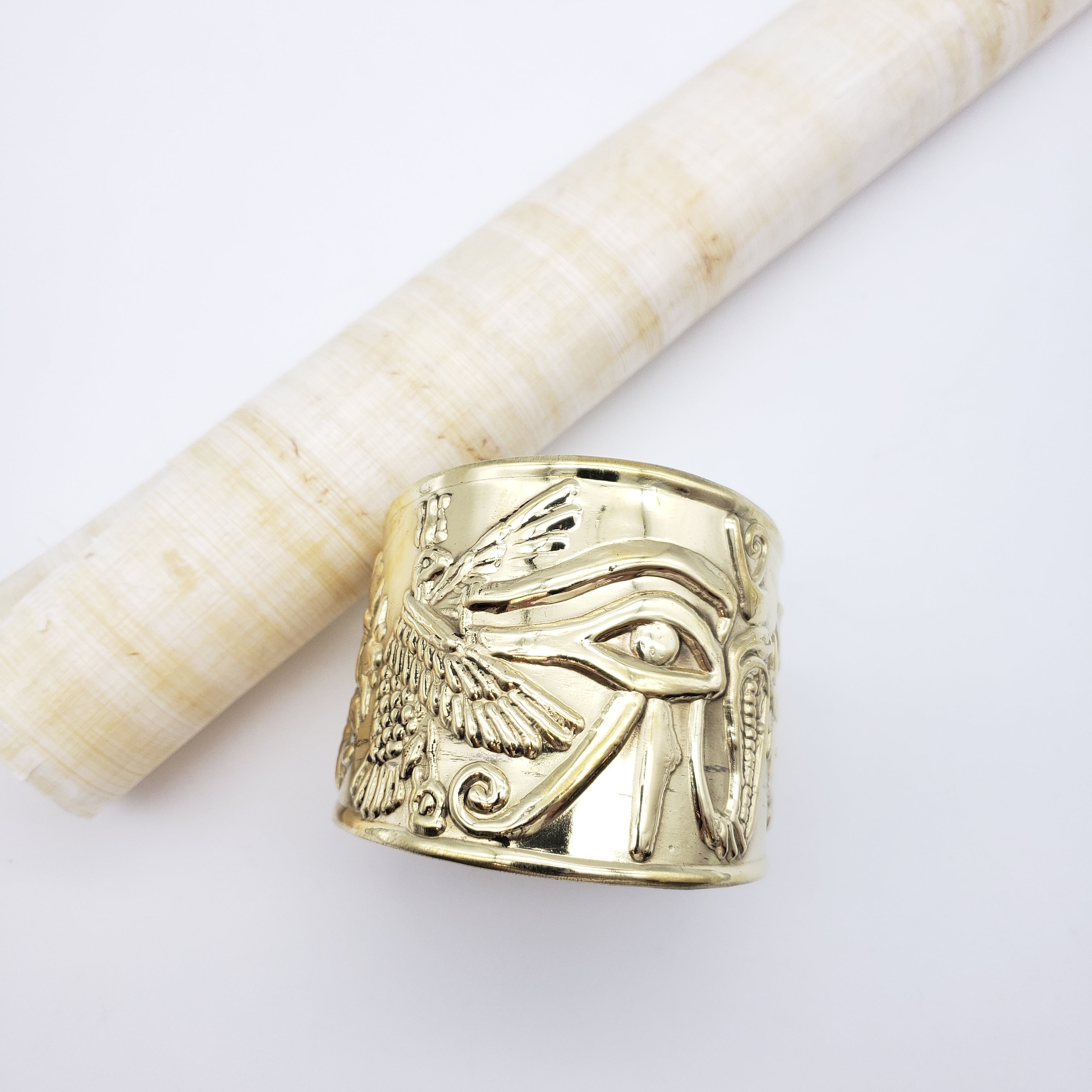 This beautiful eye bracelet makes a bold statement. Made in Cairo, Egypt! It is adjustable and measures about 2 inches wide. It is made from brass. Due to the handmade nature, the quality may vary.