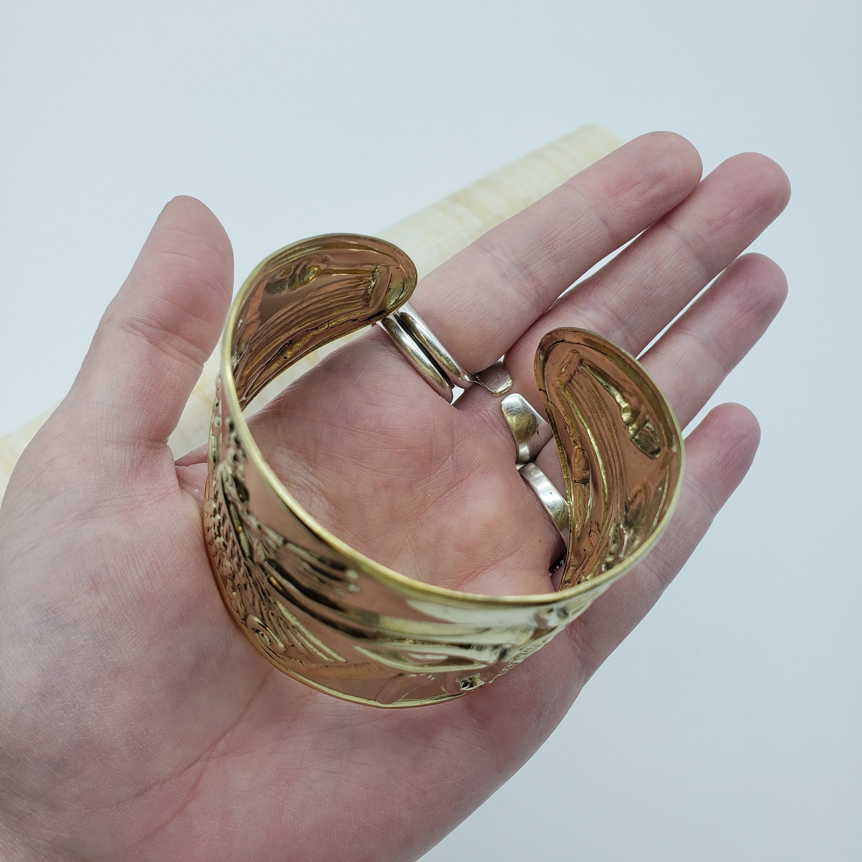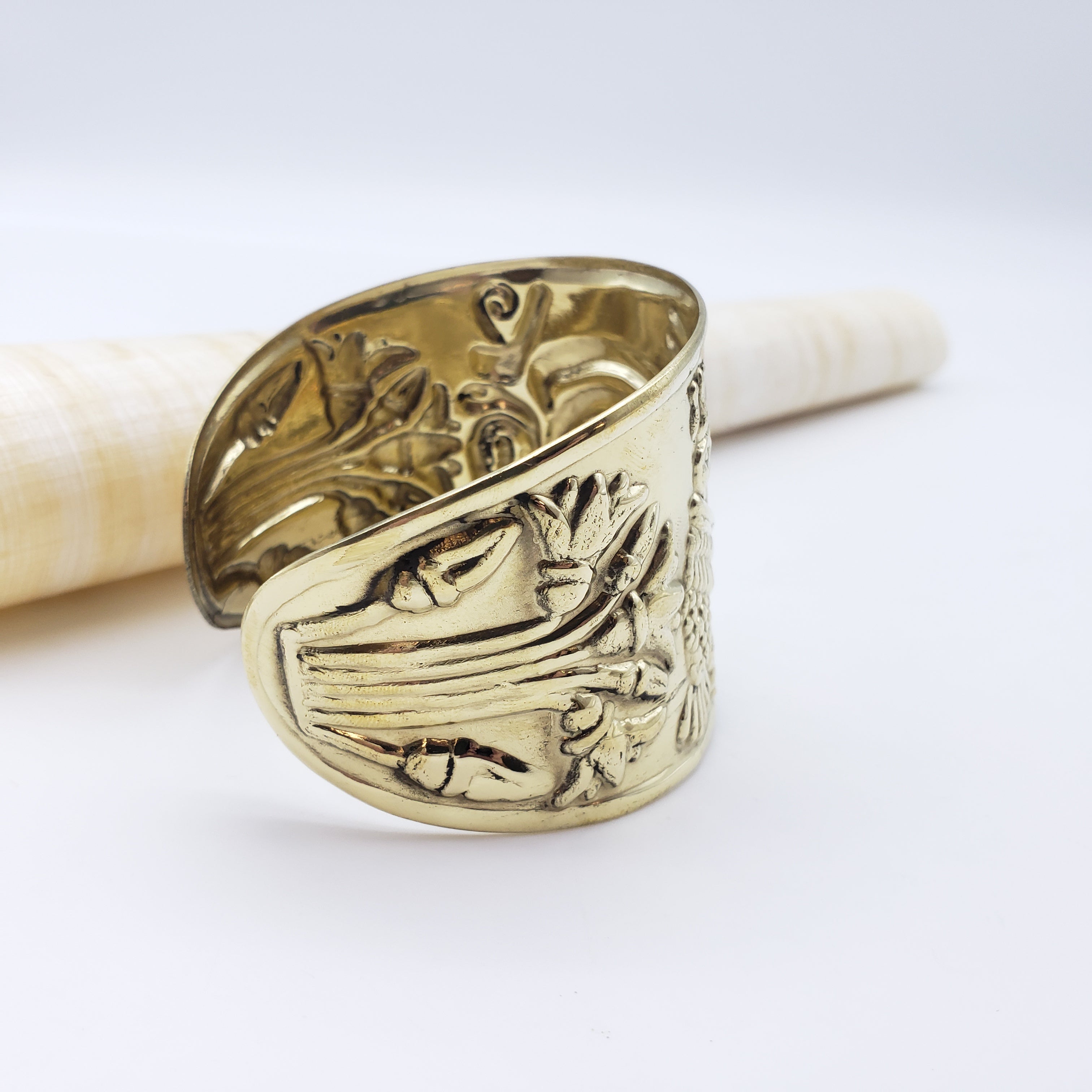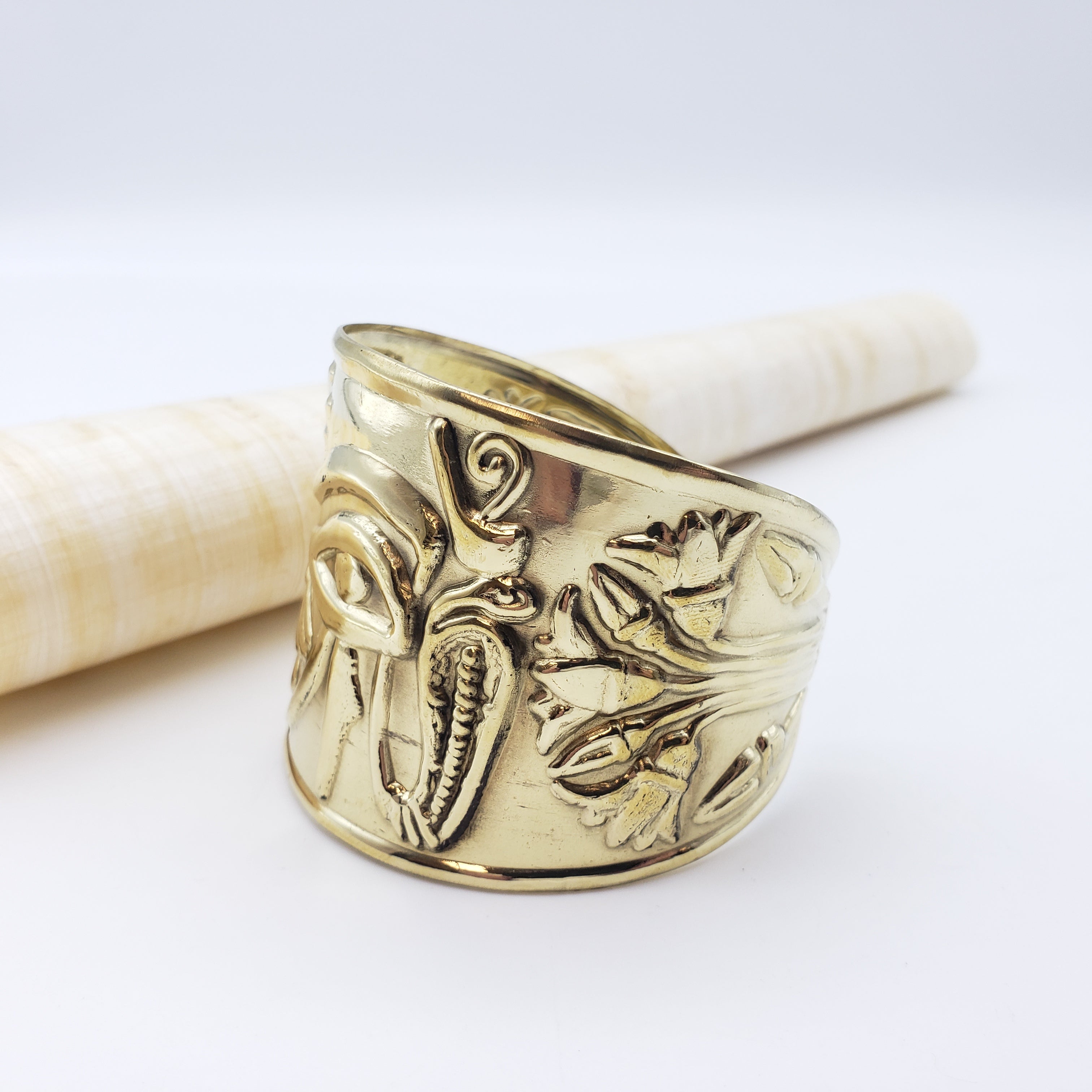 This beautiful eye bracelet makes a bold statement. Made in Cairo, Egypt! It is adjustable and measures about 2 inches wide. It is made from brass. Due to the handmade nature, the quality may vary.