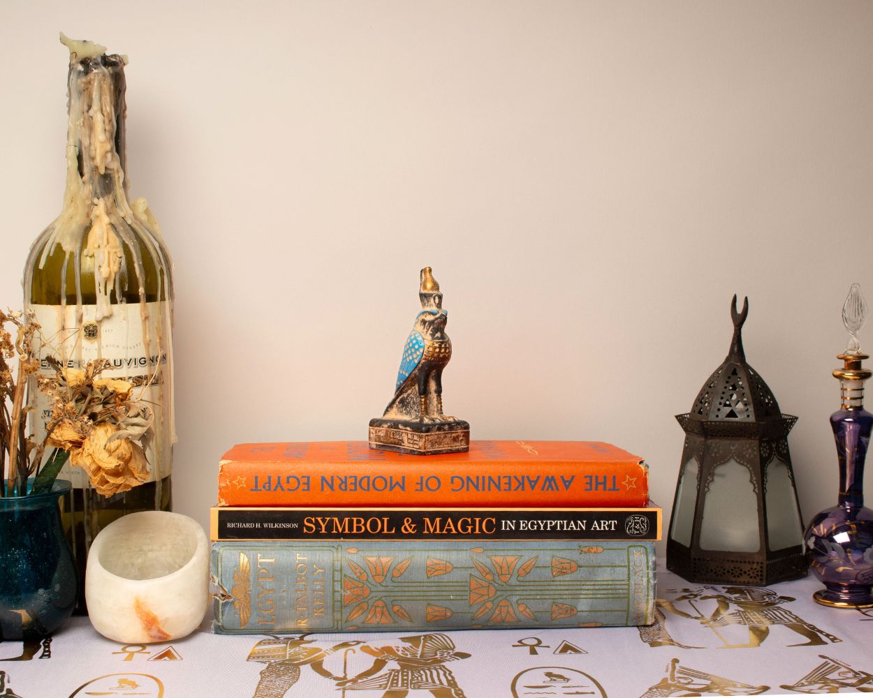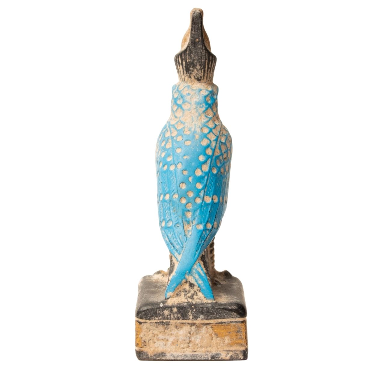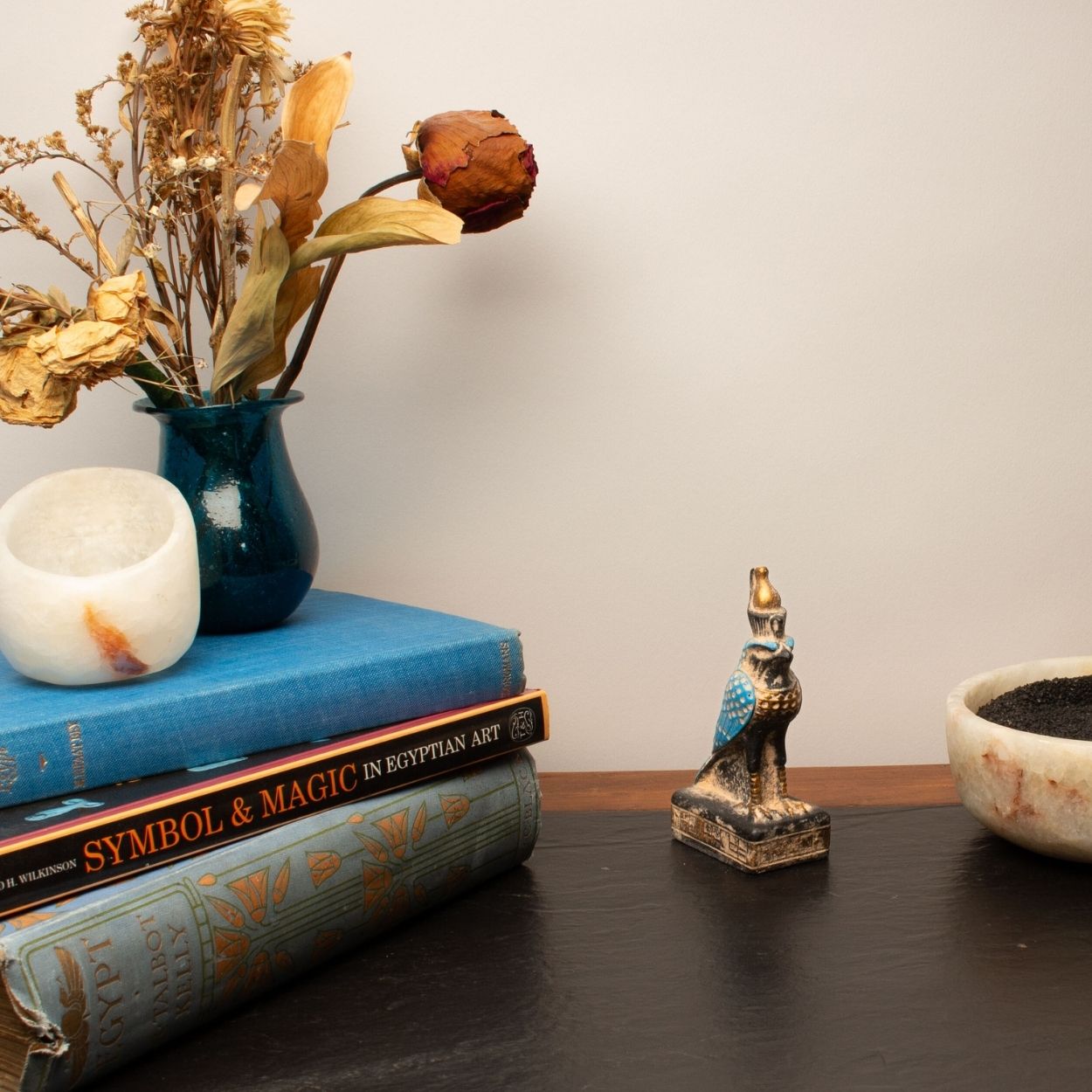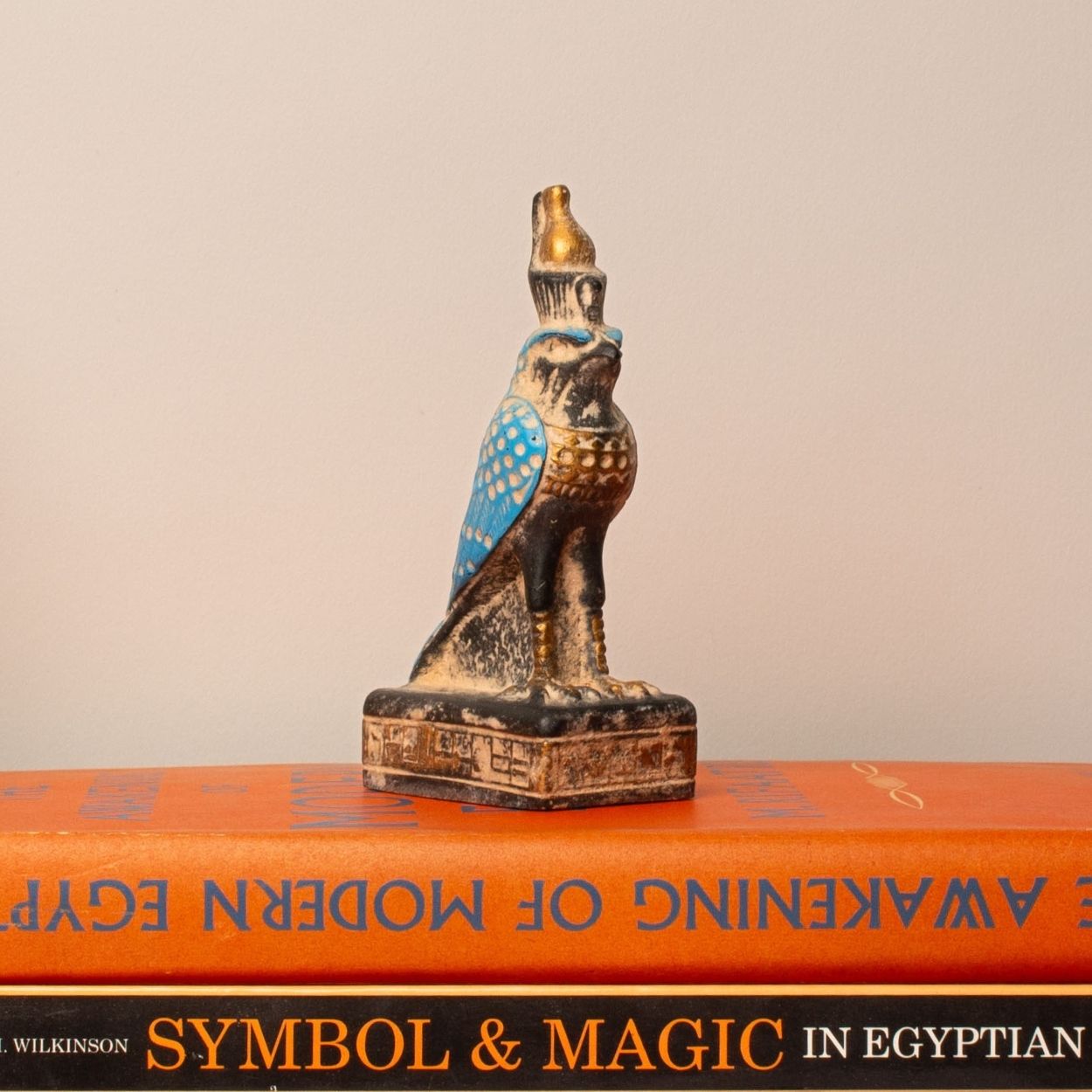 Horus was represented either as a falcon-headed man or as a falcon - here he is a 4-inch-tall statue. This figurine is hand-molded polymer that has been hand-painted. Made in Egypt! This statue will be shipped in a hieroglyphic box--perfect for gifting.