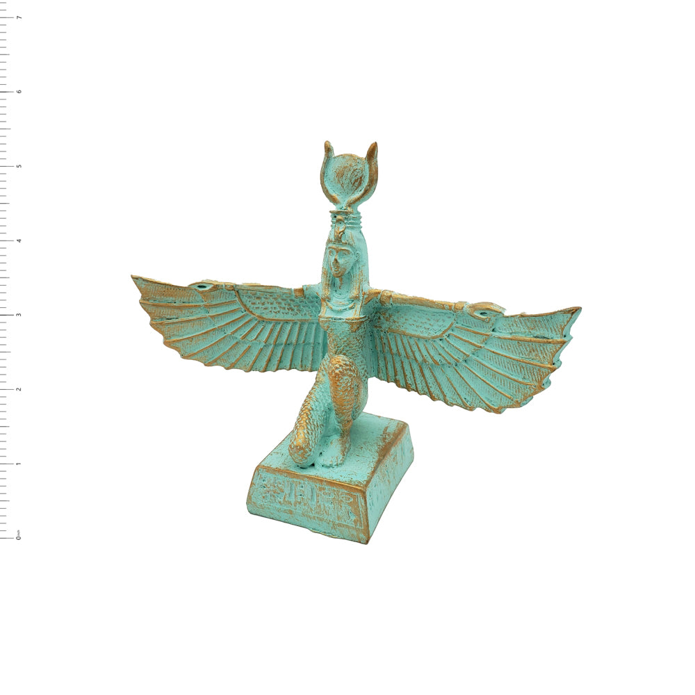 This beautiful statue depicts the Egyptian goddess Isis. This 5.25 inch tall statue is made of polymer and has a hand painted patina finish. Made in Egypt! This statue will ship with an information card in a box with hieroglyphic designs -- perfect for gifting!