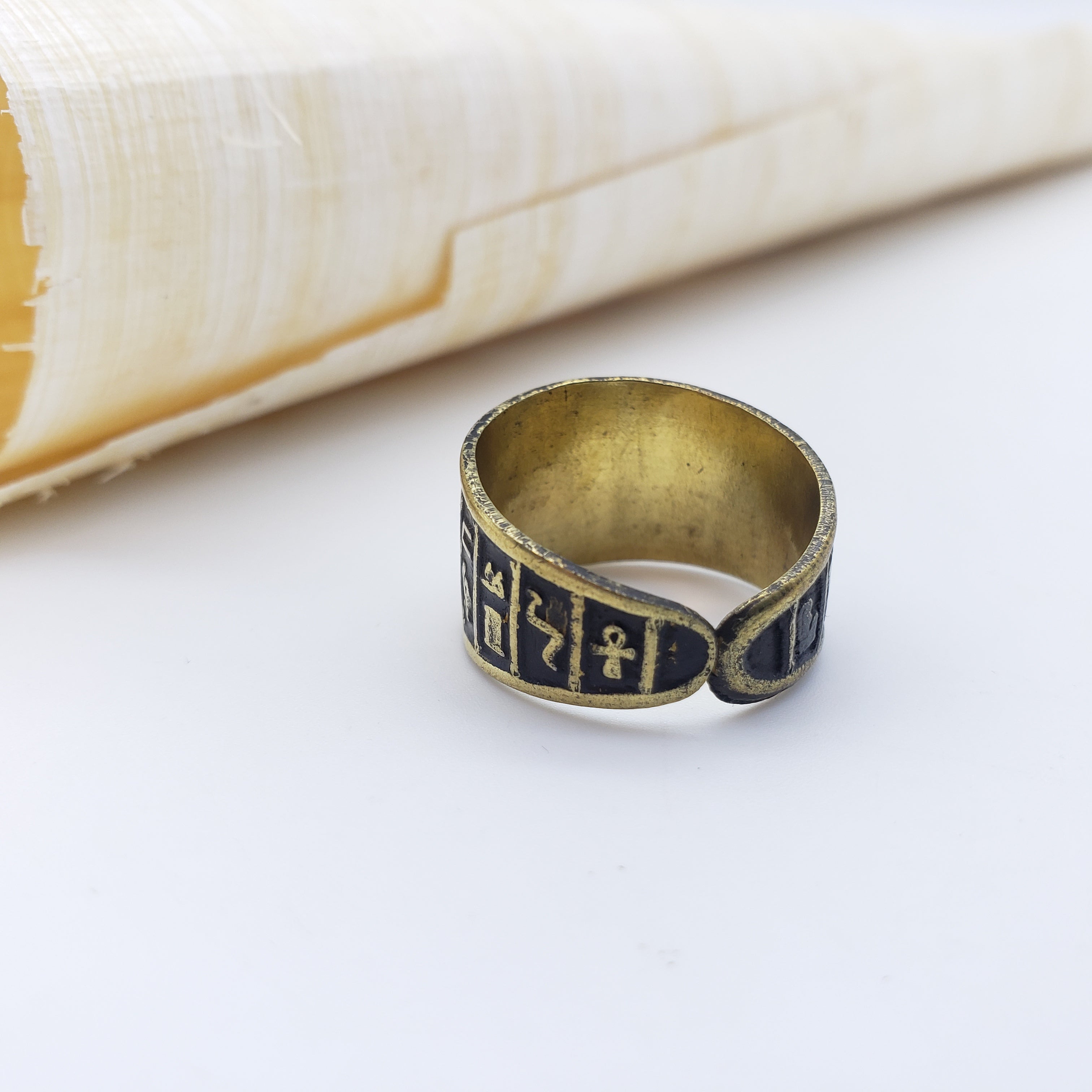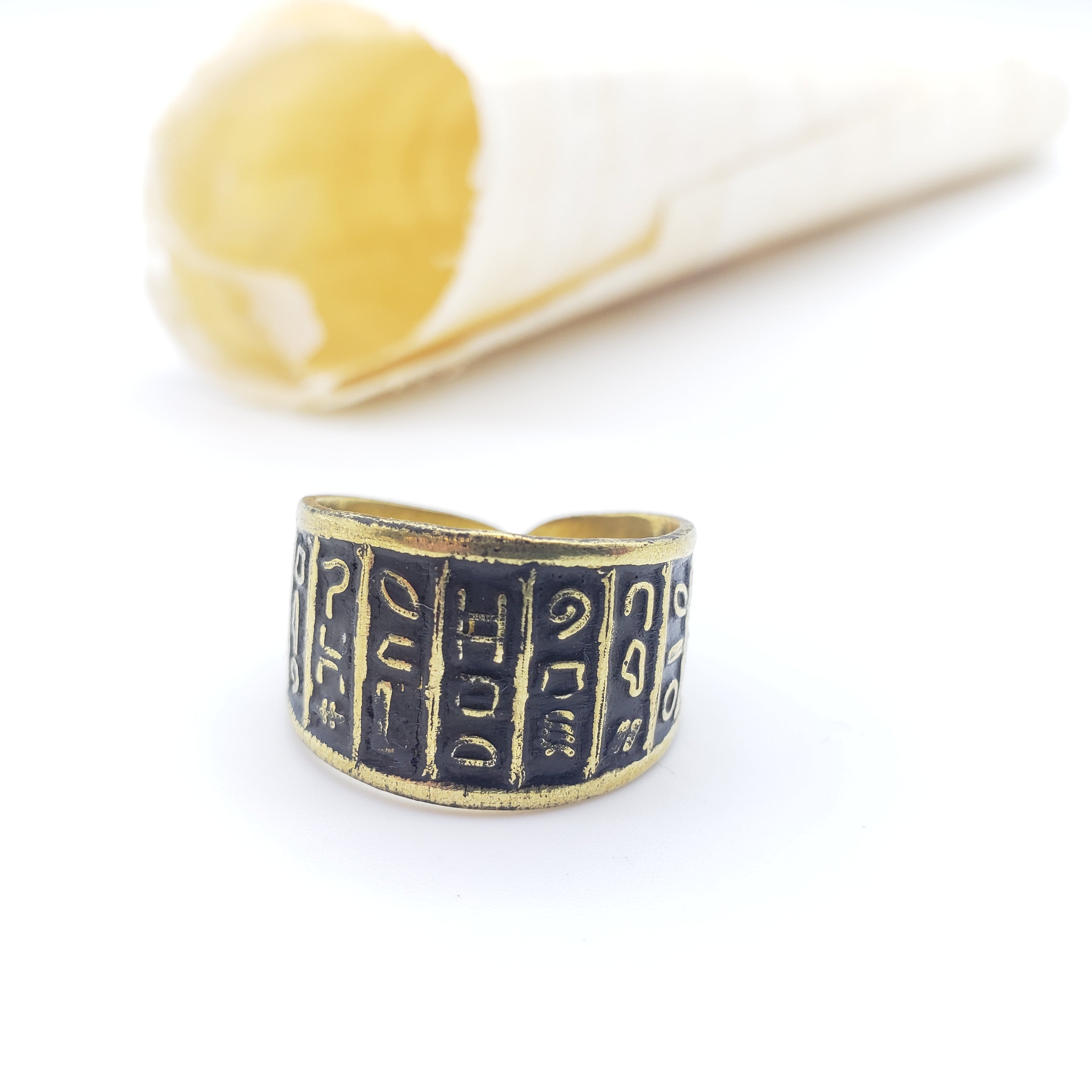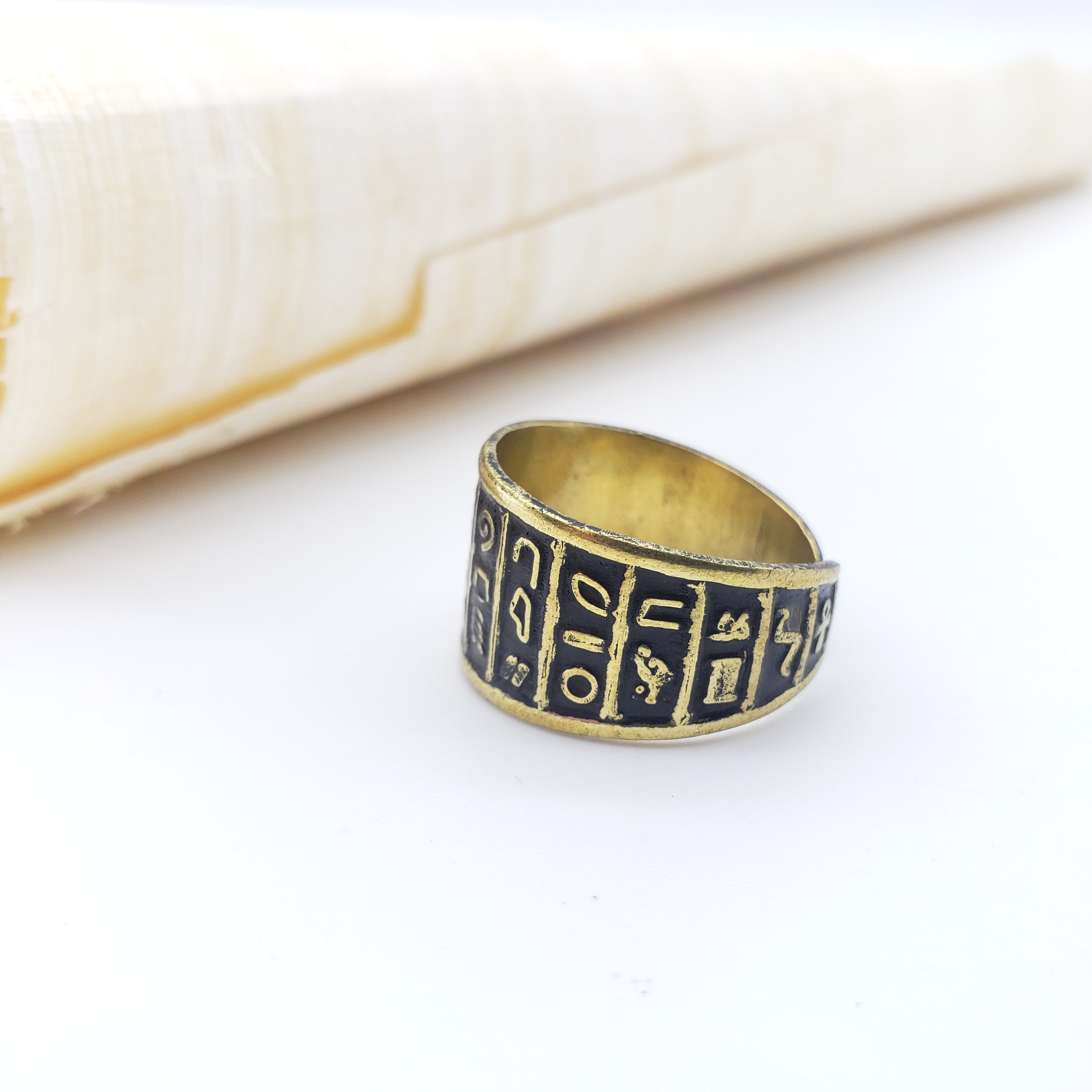 This lovely Egyptian hieroglyph ring was made in Cairo, Egypt! This ring is made from gold-plated brass and epoxy. The band's width is .5 inches.