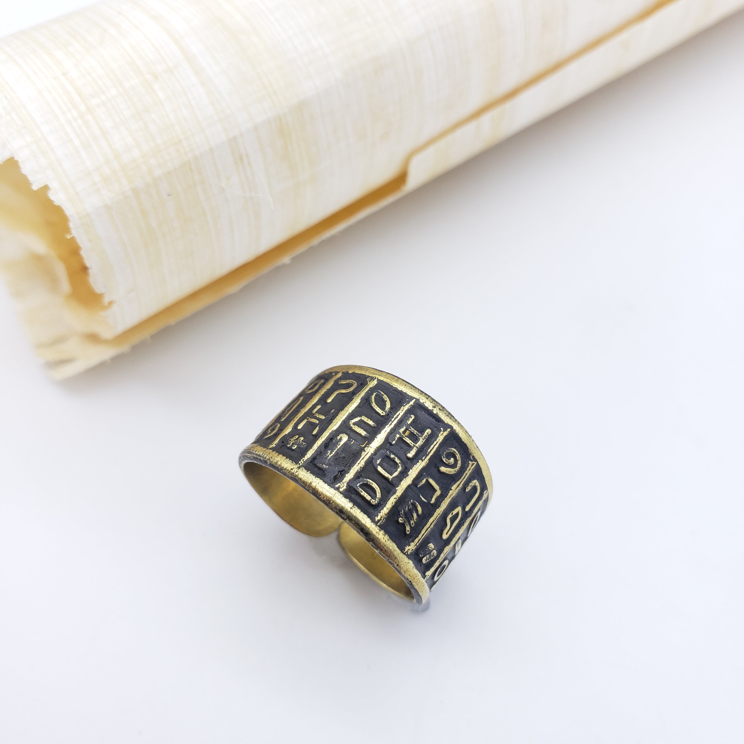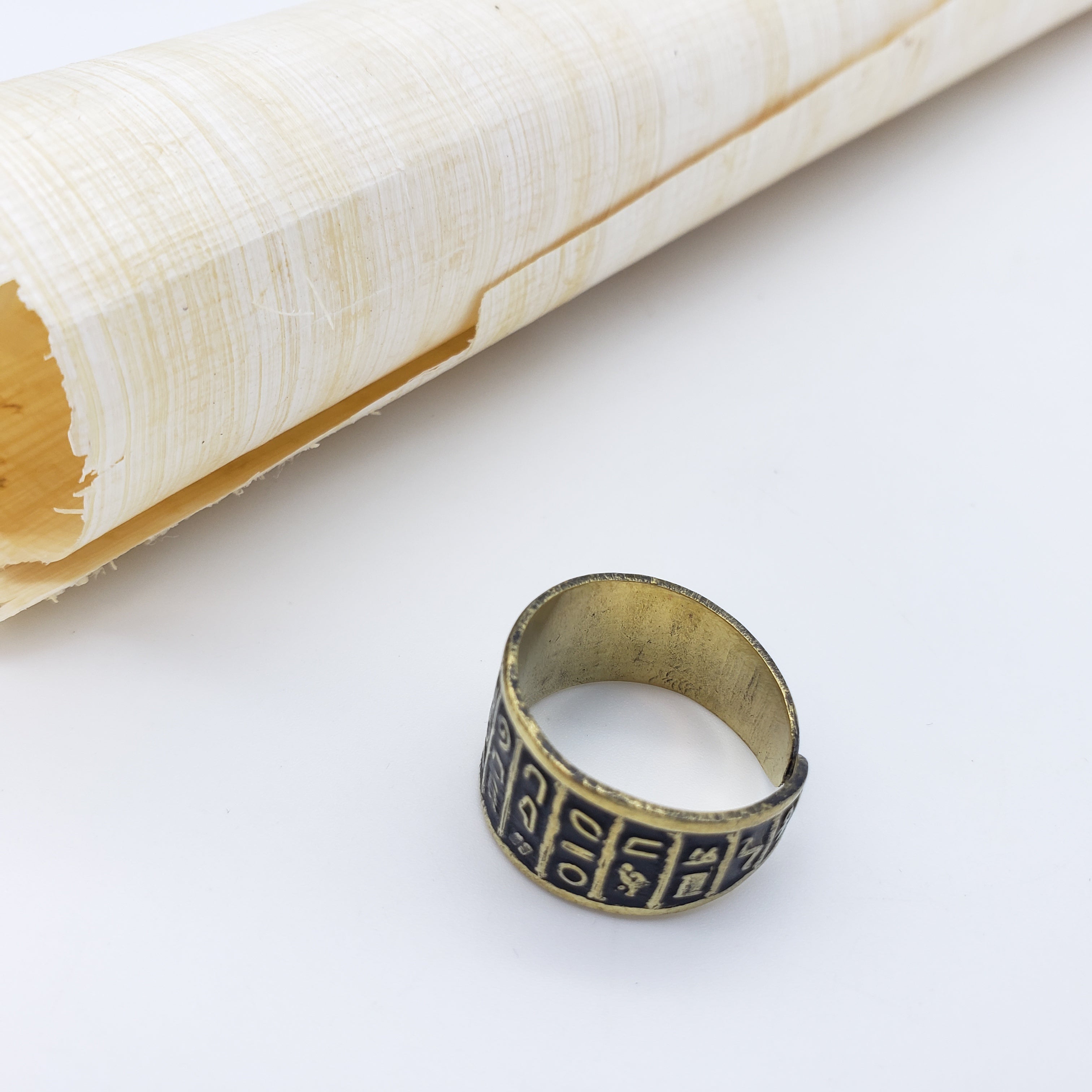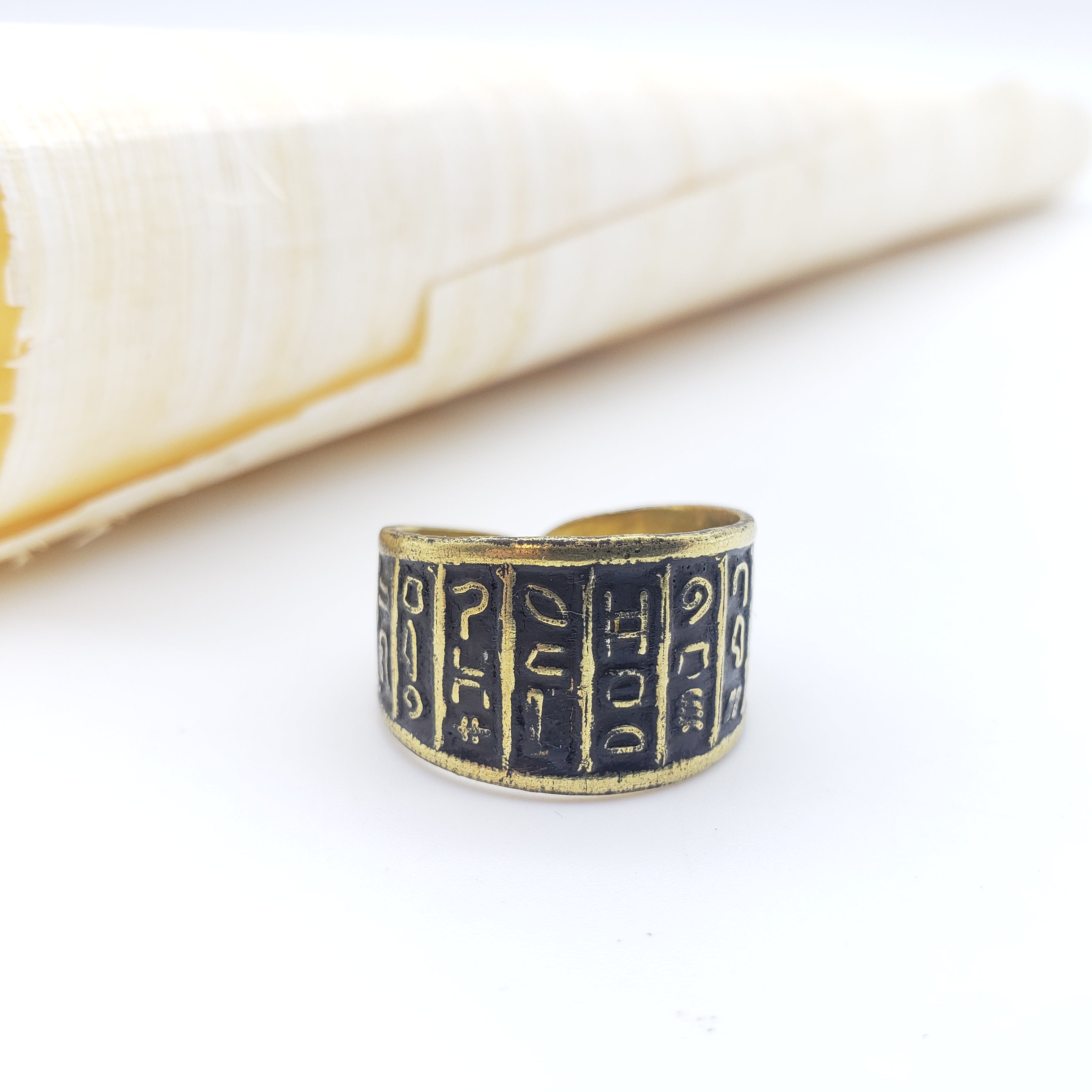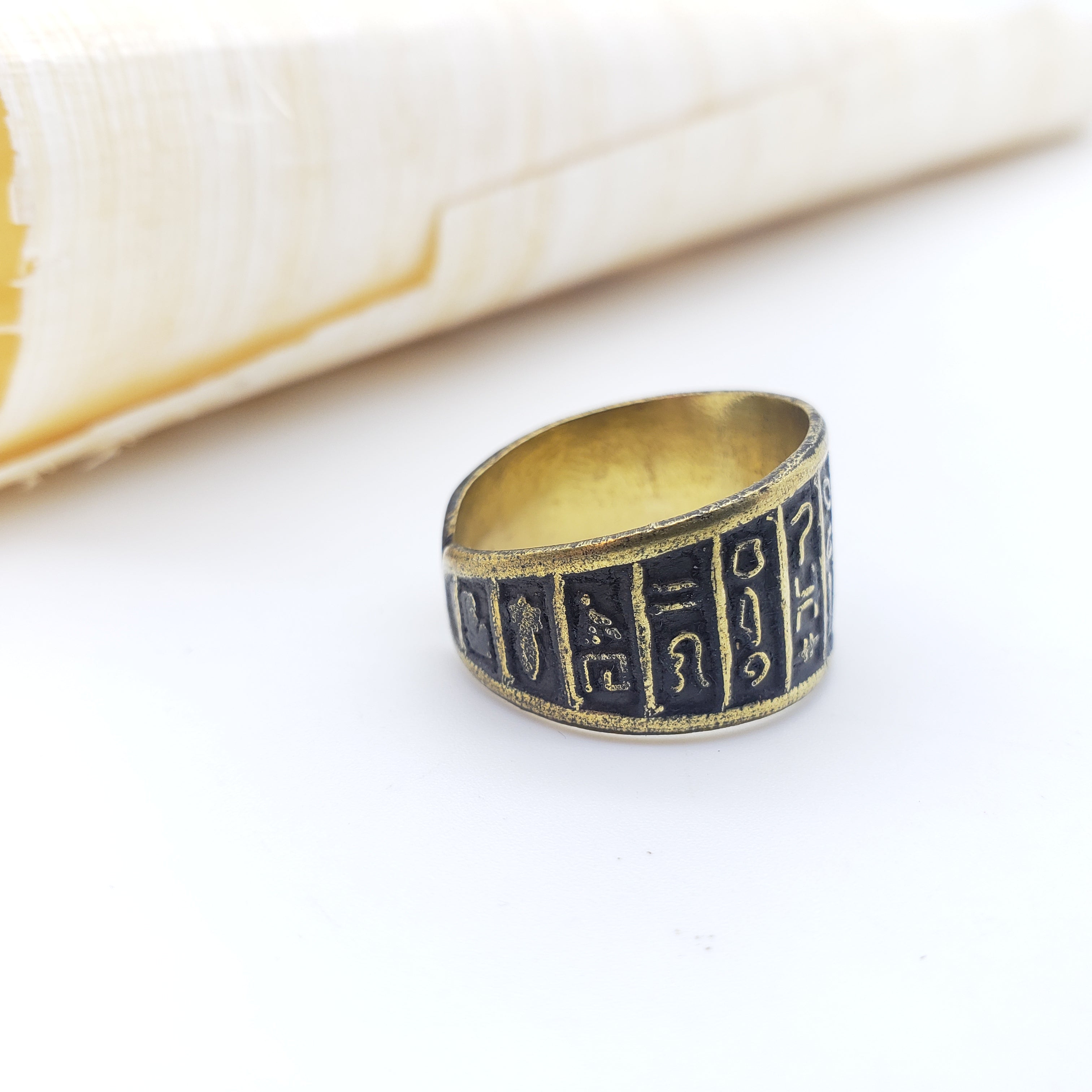 This lovely Egyptian hieroglyph ring was made in Cairo, Egypt! This ring is made from gold-plated brass and epoxy. The band's width is .5 inches.