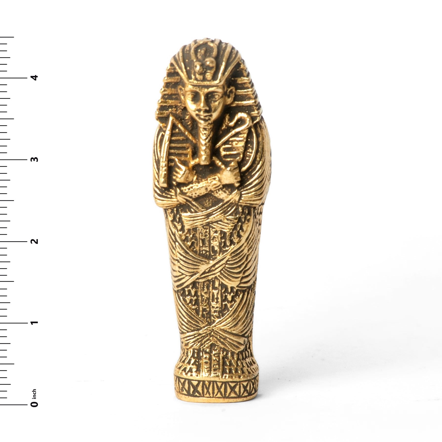 This Egyptian mummy comes in three parts: the coffin casket tomb with removable lid and the corpse mummy. This 4.5 inch tall statue is made of polymer and has a genuine gold leaf finish! Brown pigment has been added on top of the gold leaf to bring out the figurine's details. Made in Cairo, Egypt! This statue will ship in a hieroglyphic box with information card - perfect for gifting!