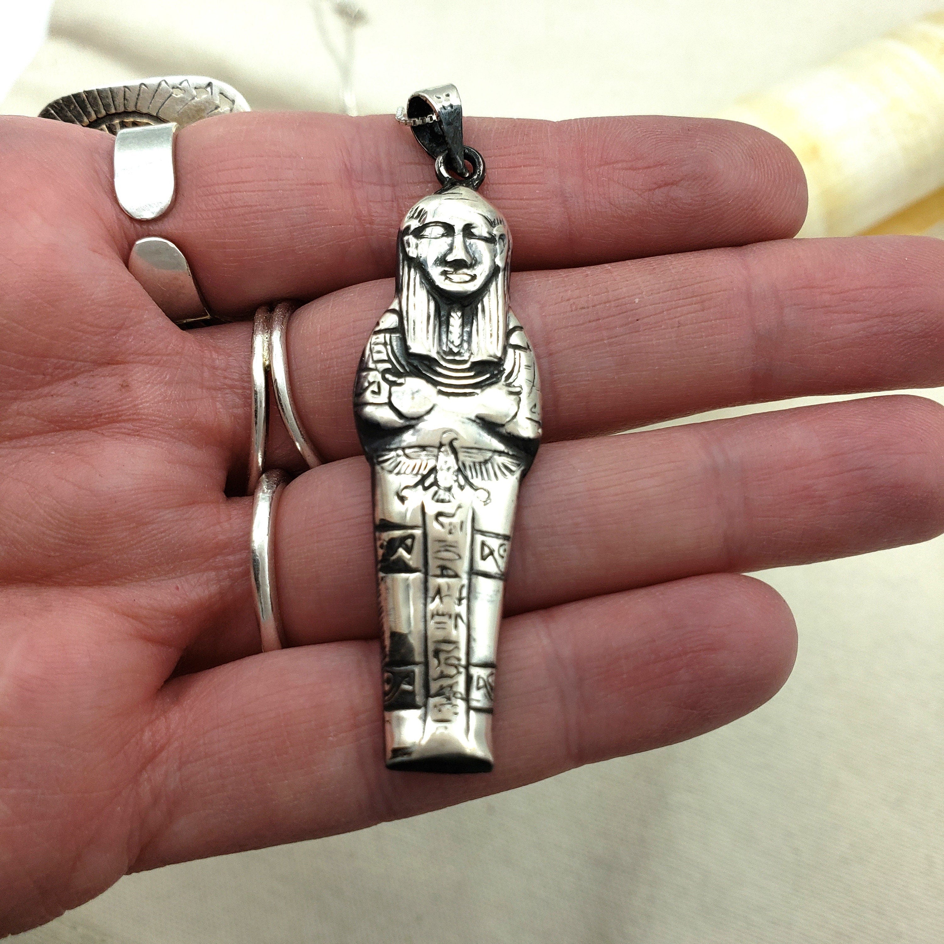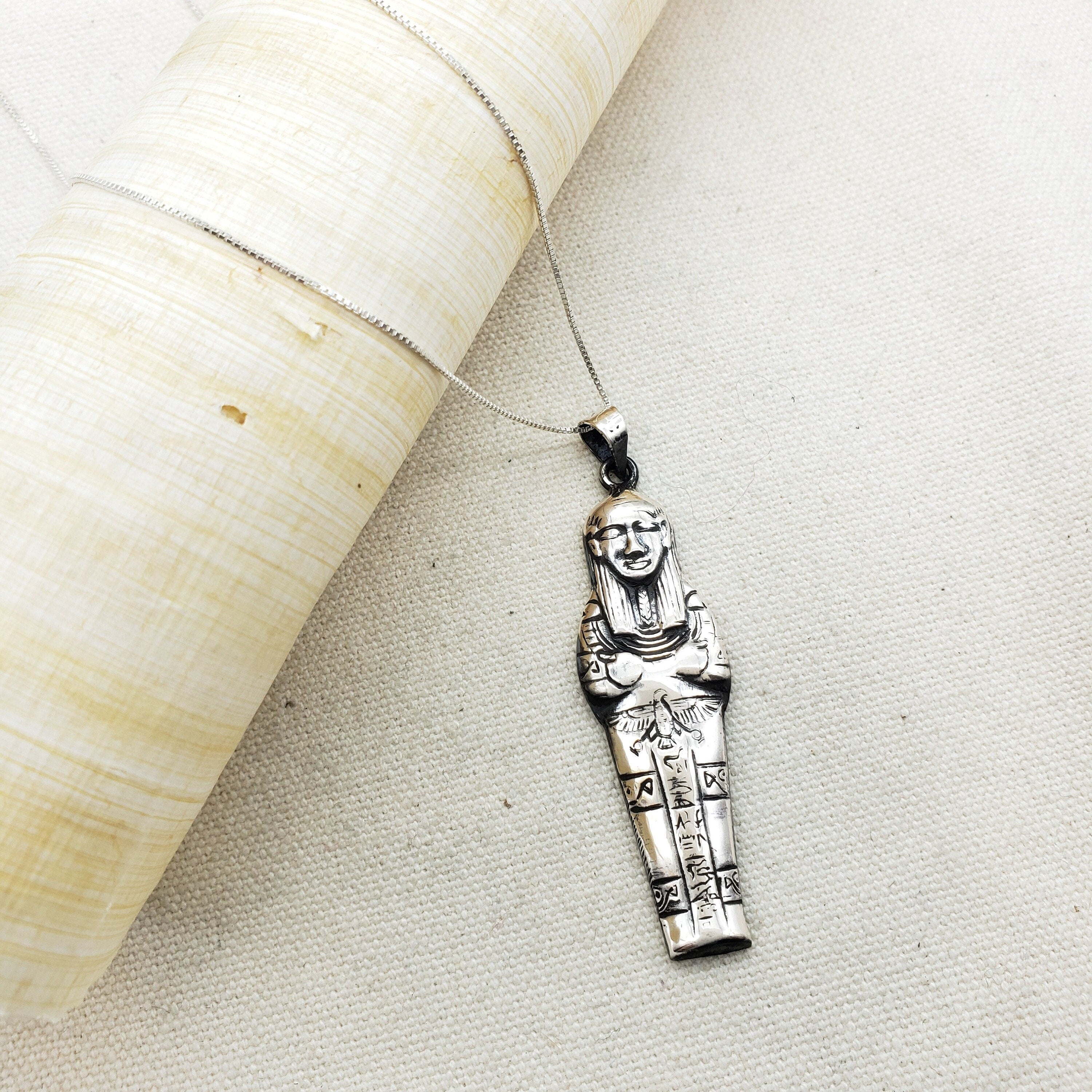 This Egyptian mummy pendant necklace was made in Cairo, Egypt. This pendant is made from Egyptian Silver (approximately 85% silver), which is standard in the Egyptian marketplace. The silver is stamped by the Egyptian government certifying the silver content. This pendant comes with an 18-inch sterling silver chain.
