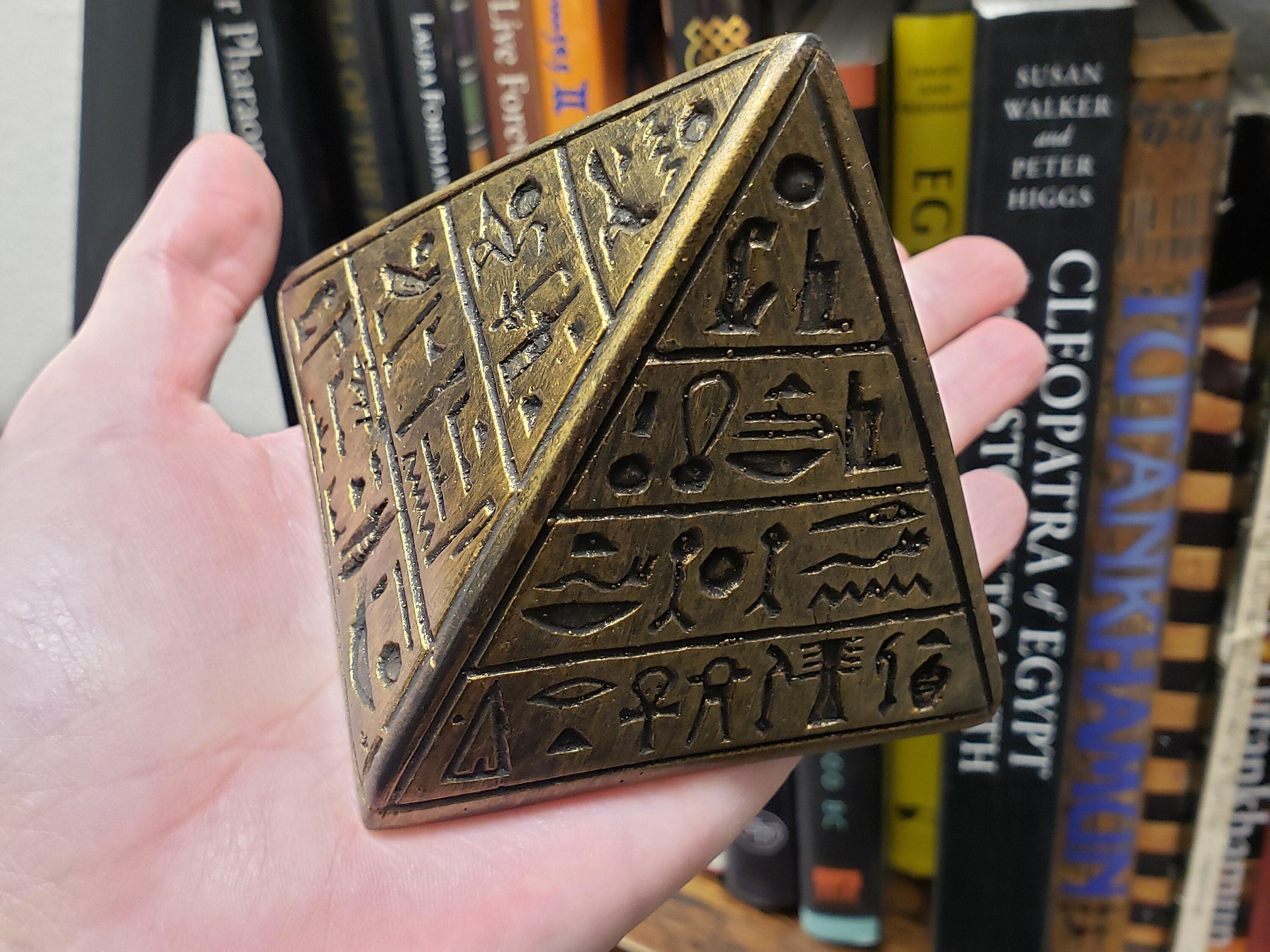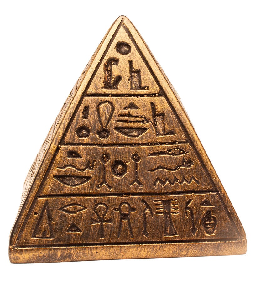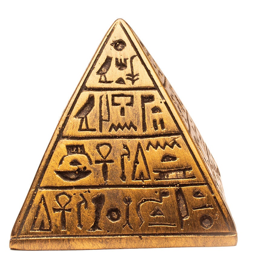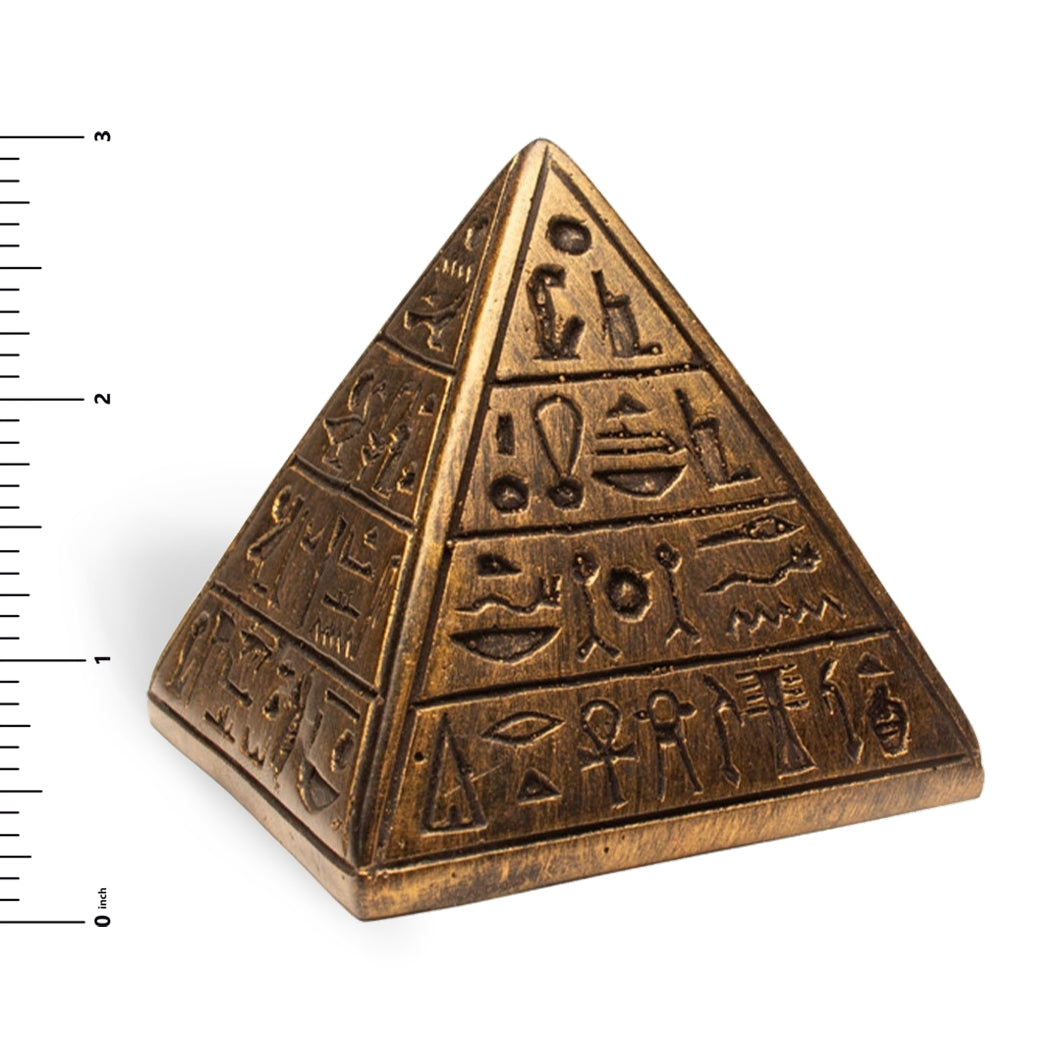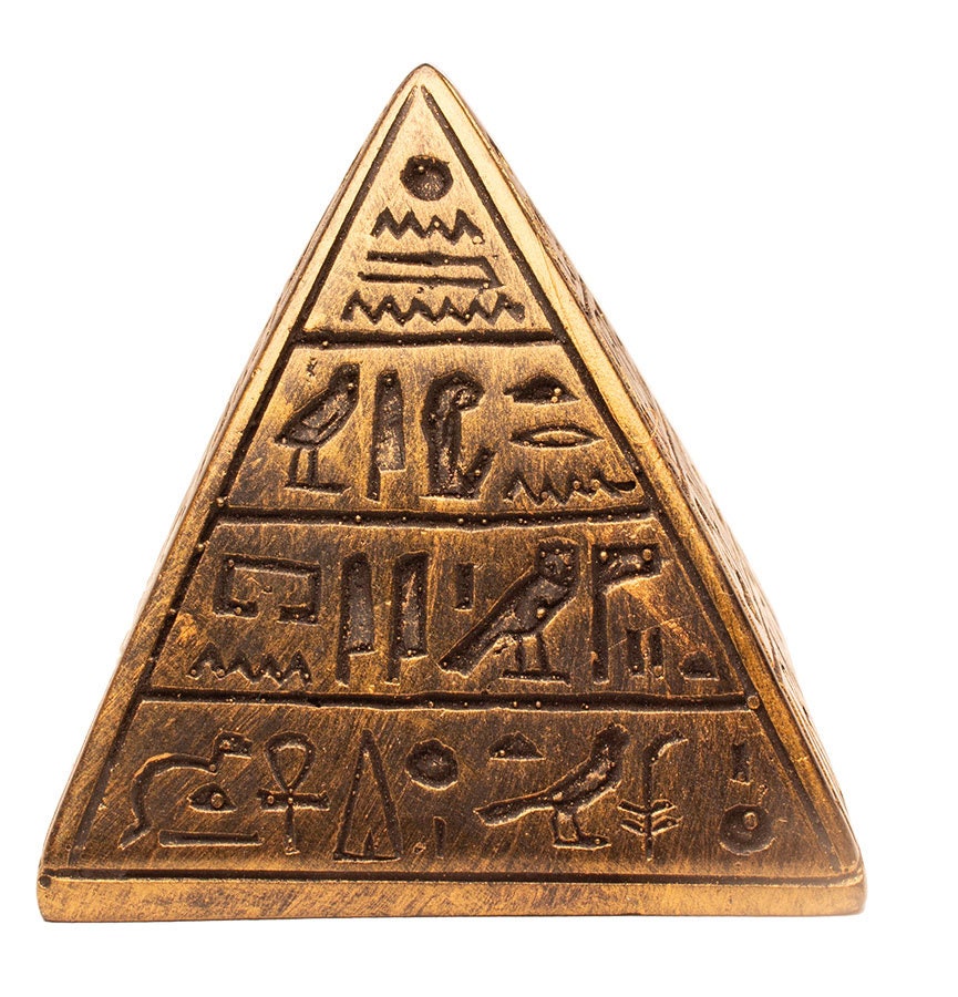 This lightweight Egyptian pyramid statue was made by our artisans in Luxor, Egypt. The statue features beautiful decorative designs on each of the sides. It was hand painted with a metallic gold paint. Your order will ship in a box with hieroglyphic designs - perfect for gifting!