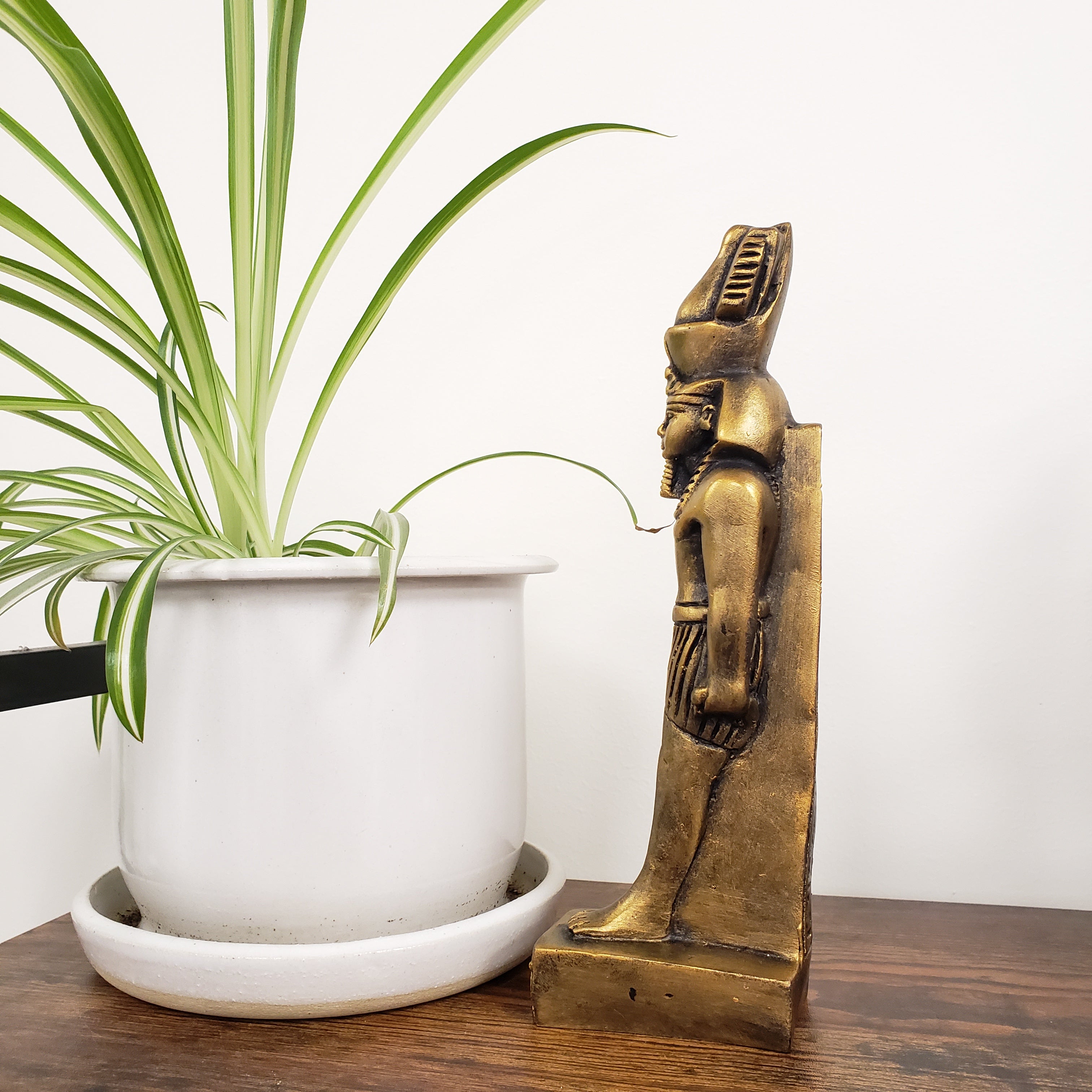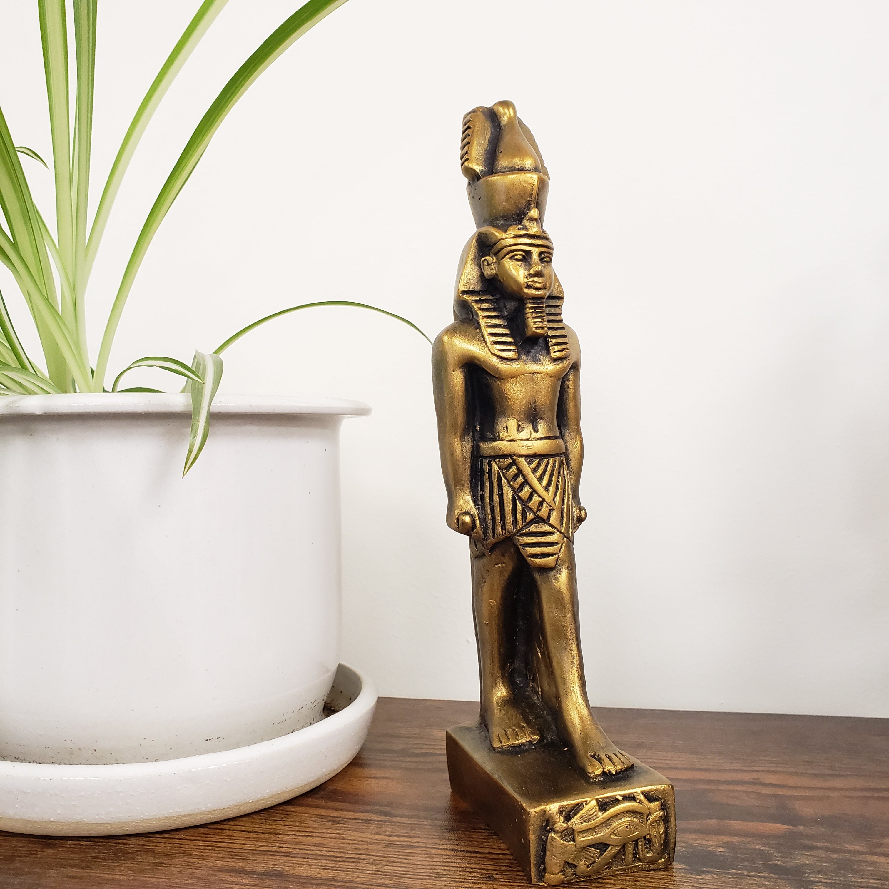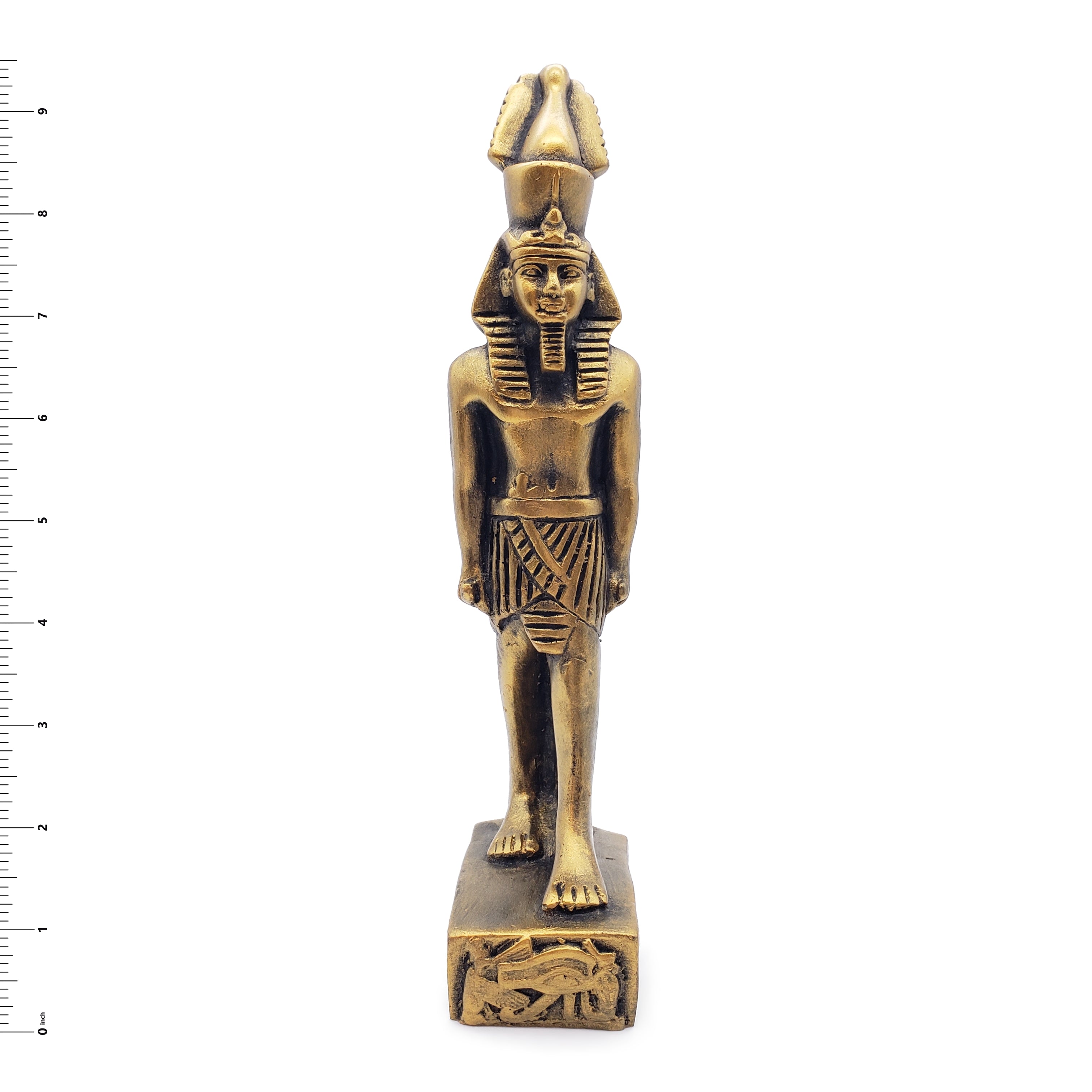 This polymer resin statue has beautiful hand carved details. It is 9.5 inches tall. The statue was handmade in Luxor, Egypt. Due to the hand painted quality, there are some inconsistencies in the painted finish.