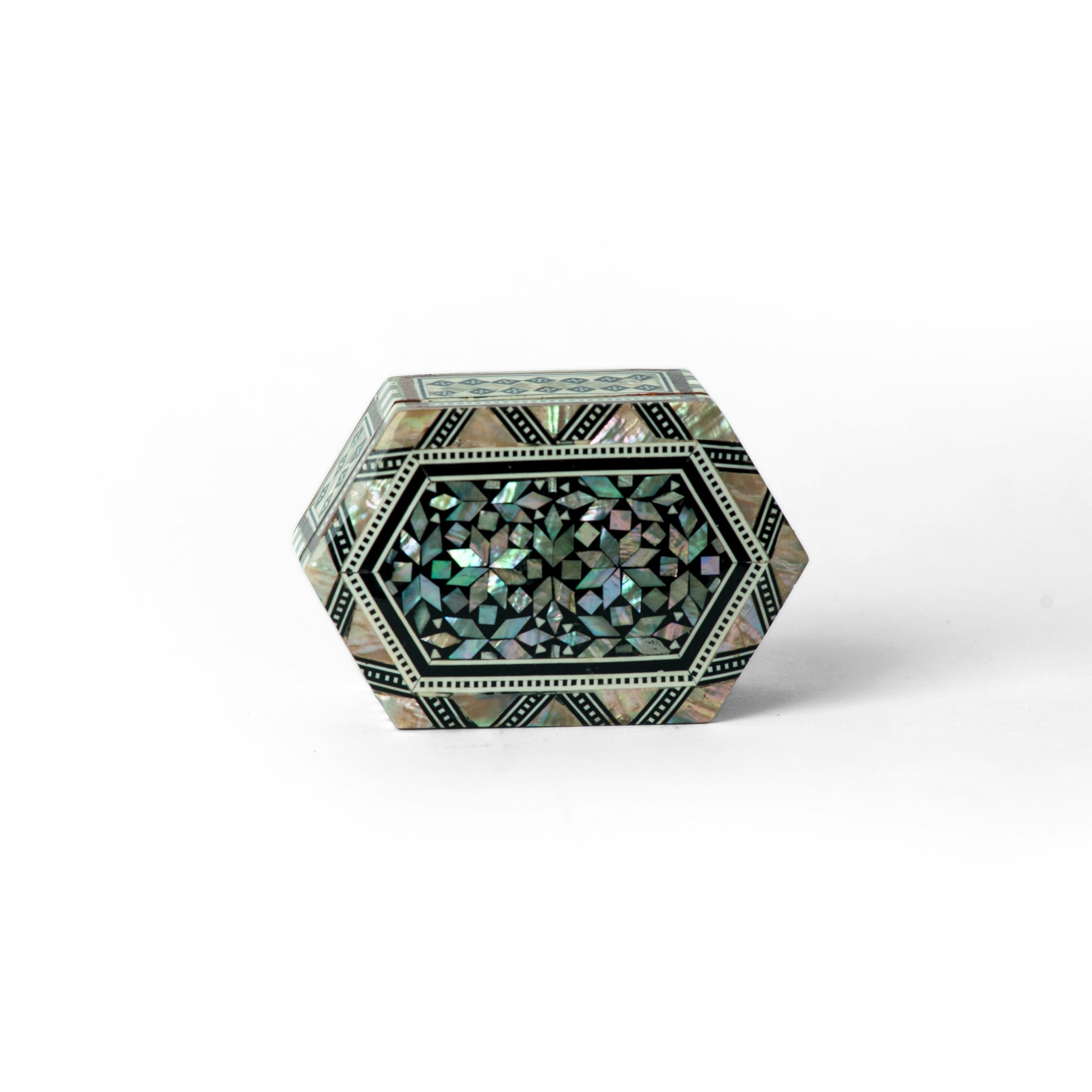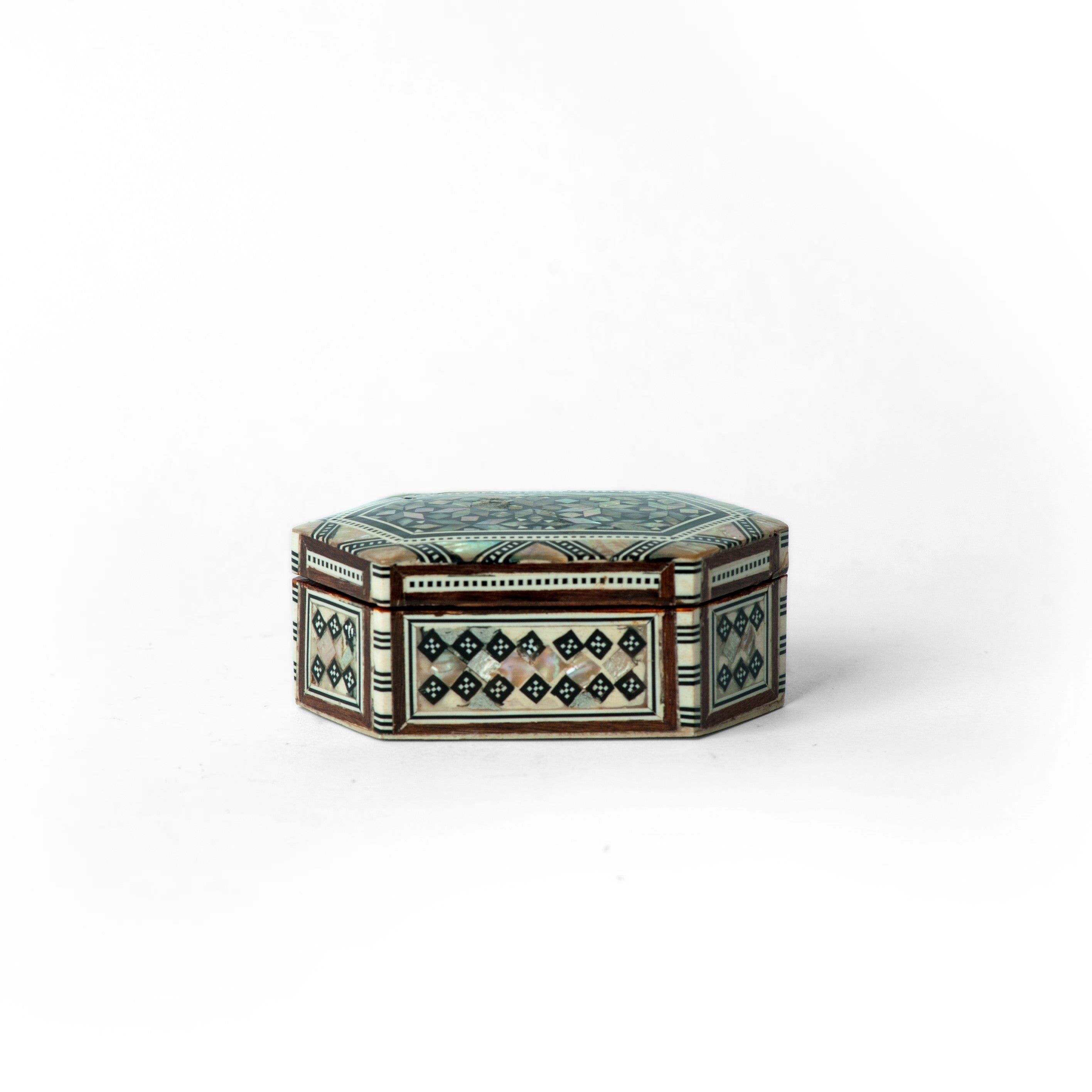 Mother-of-pearl inlaid boxes from Egypt are exquisite examples of traditional craftsmanship, blending intricate designs with rich cultural heritage. These boxes feature a wooden base adorned with meticulously cut and polished mother-of-pearl pieces, creating beautiful geometric patterns, floral motifs, and arabesques.