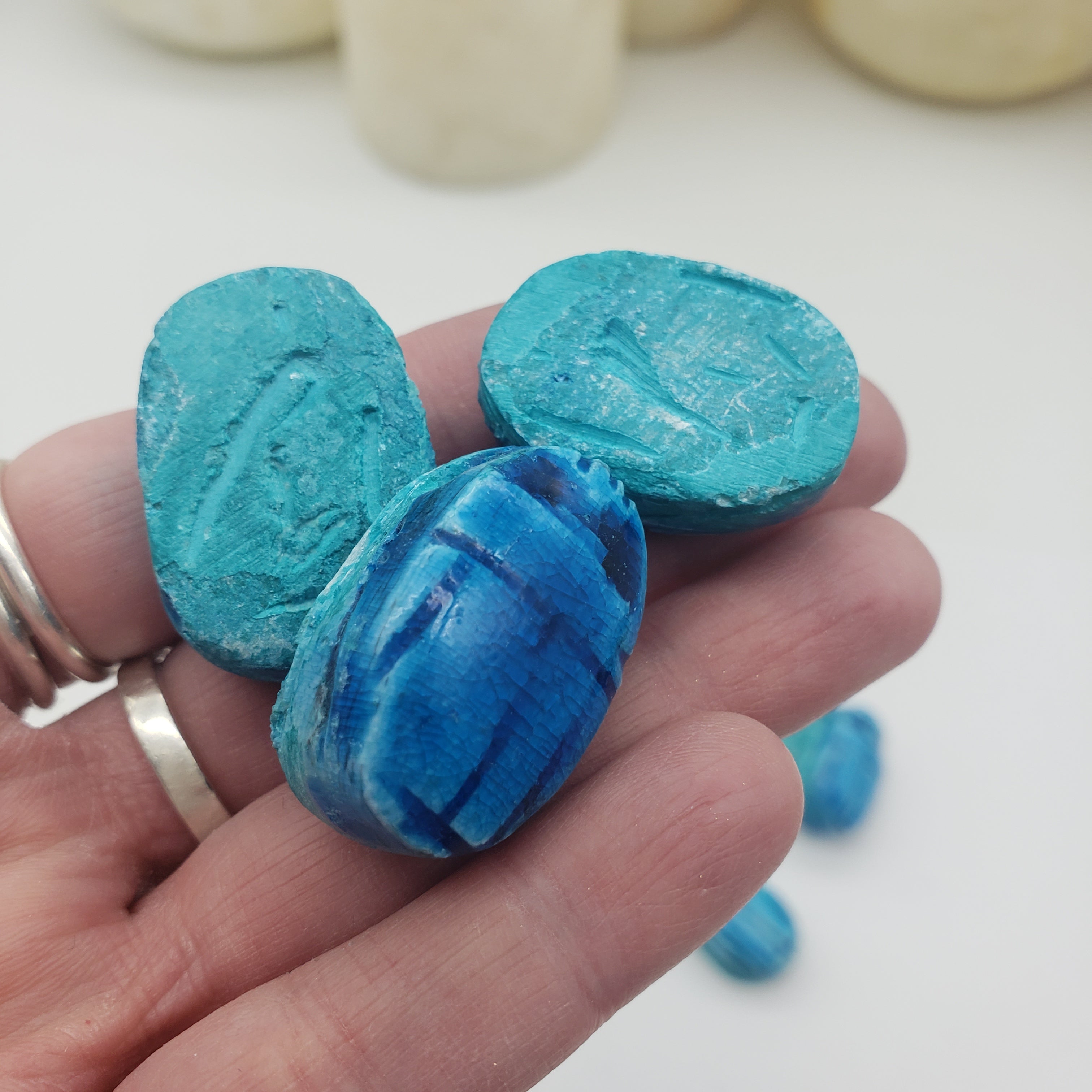 The ancient Egyptians believed that the scarab was the earthly manifestation of the god Khepri, and pushed the sun across the sky each day, only to disappear and magically re-appear the next morning. As such, it is a powerful amulet for self-creation, transformation, and rebirth. They were worn or carried by the living, and also buried with the dead to help them on their way to the afterlife. The base was usually inscribed with designs or hieroglyphs to form an impression seal.