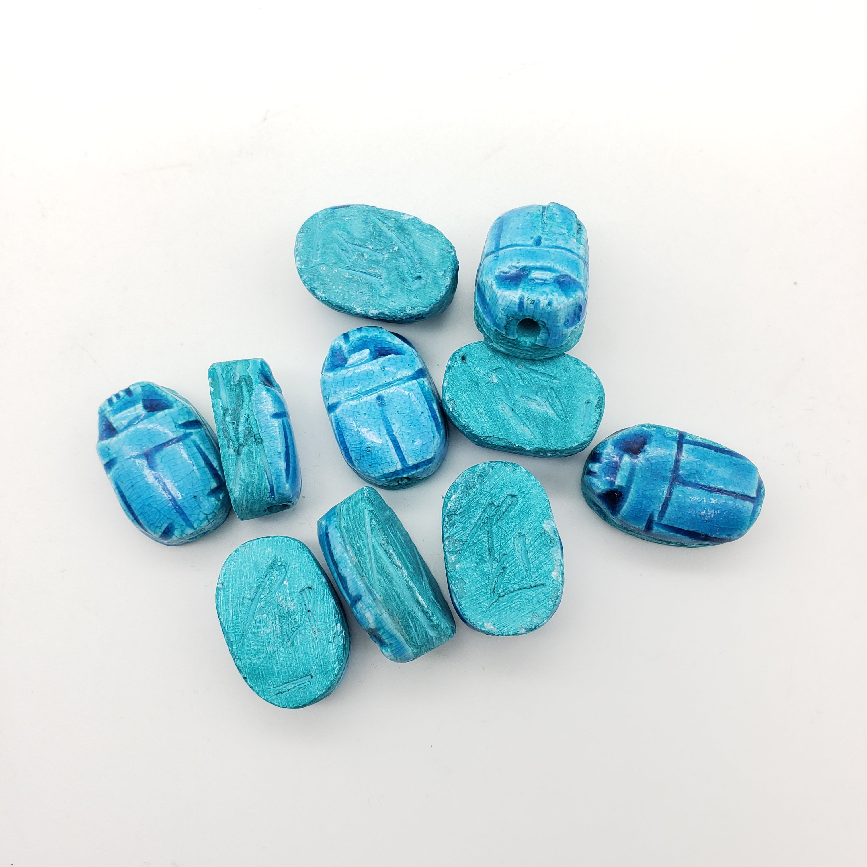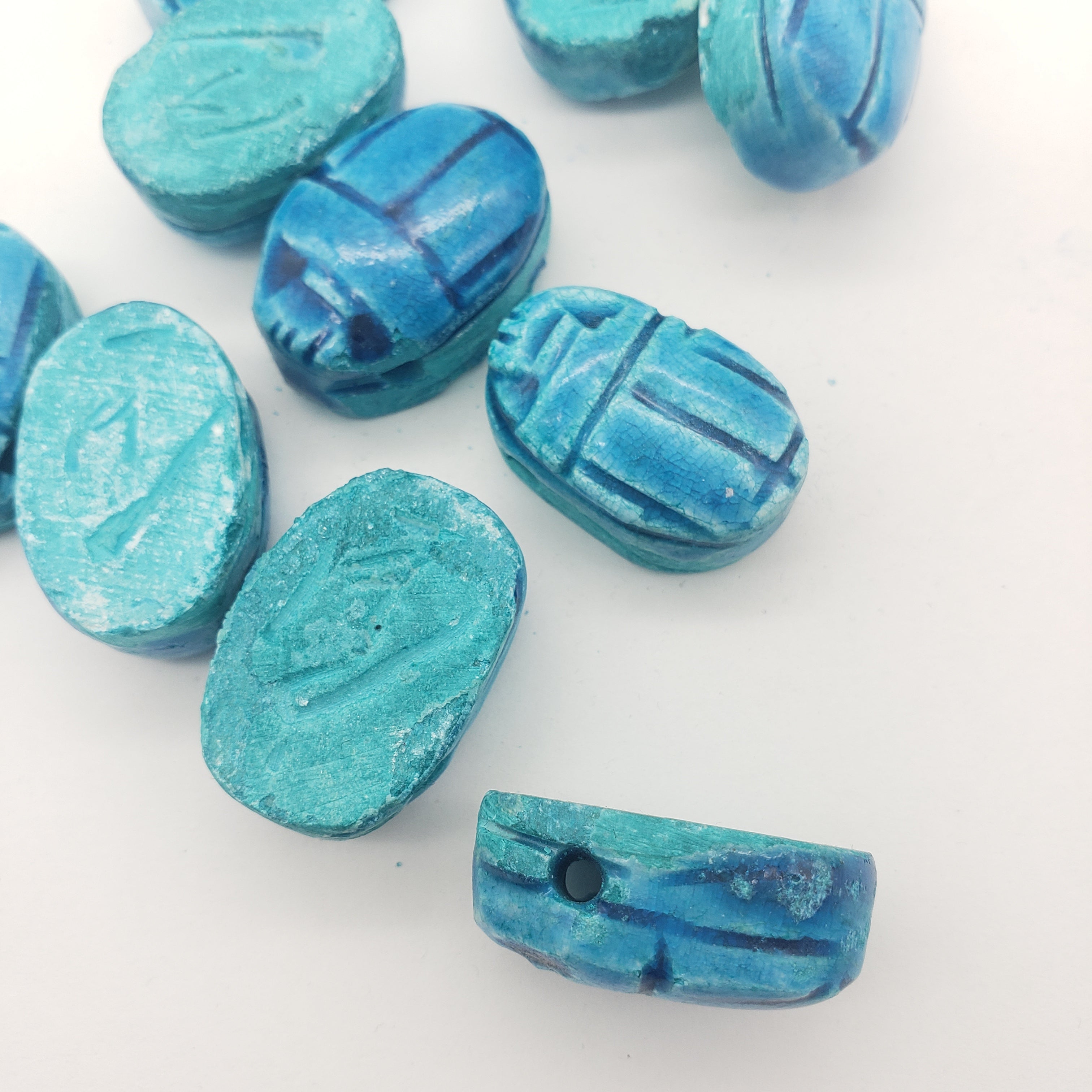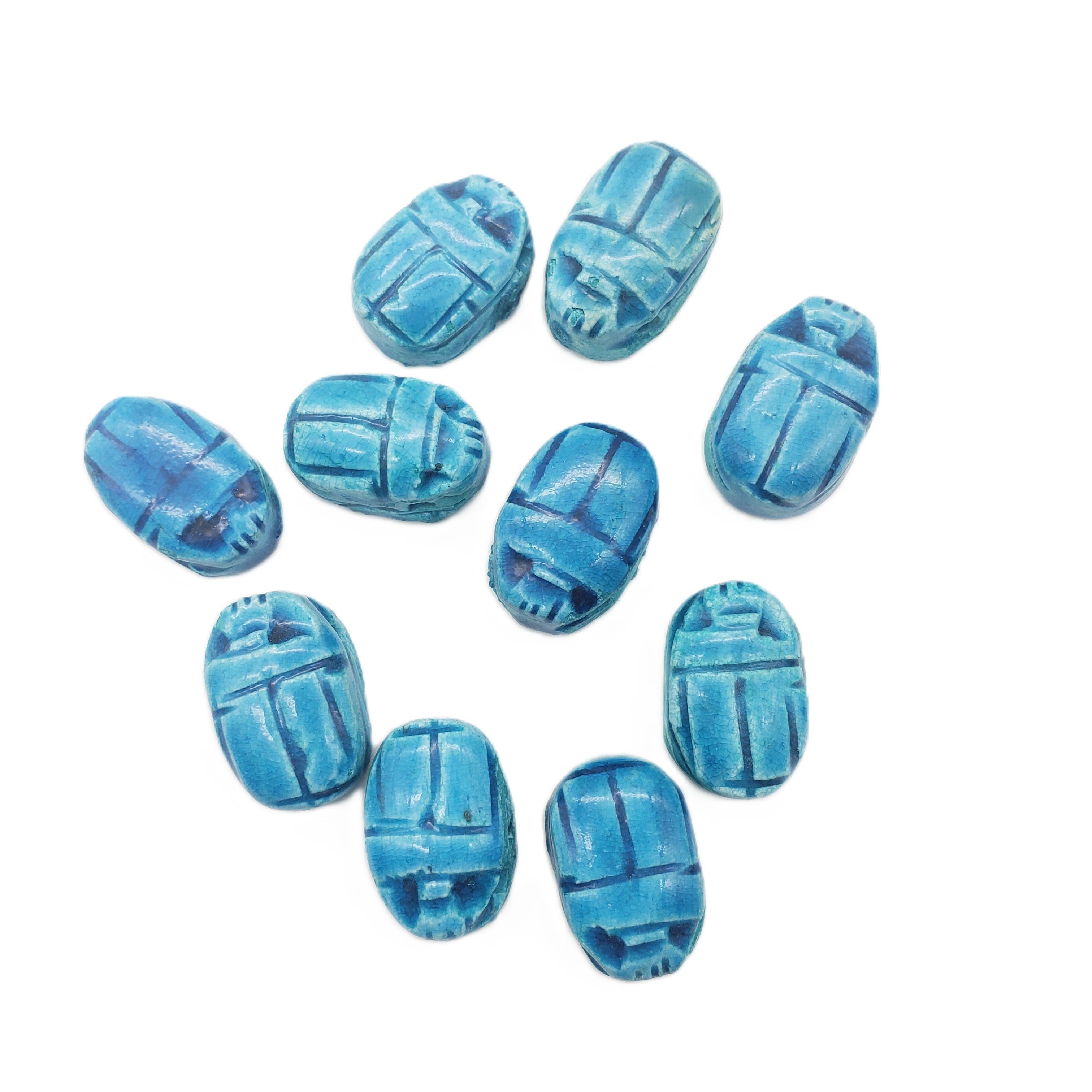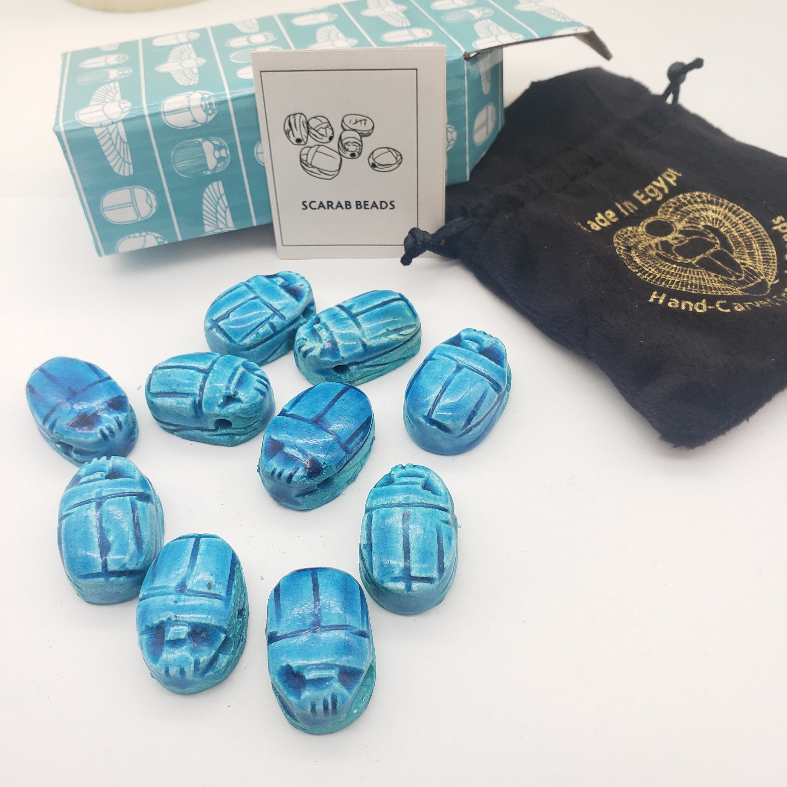Sustainably crafted in Luxor, Egypt by skilled multi-generational artisans. Crafted to capture the authenticity of the faience beads found in Ancient Egypt, packaged in a decorative box, and with an information card about scarabs, making it the perfect gift.