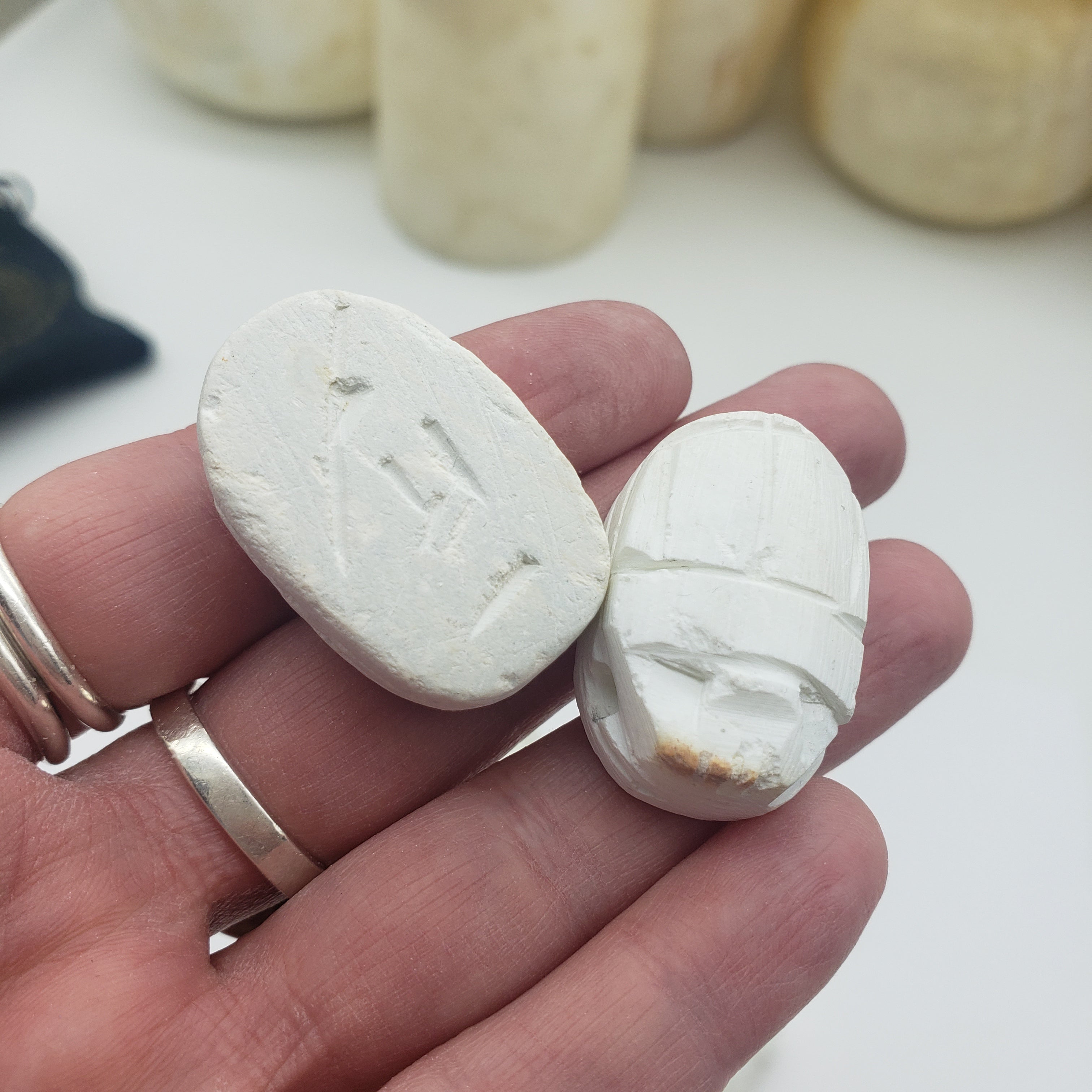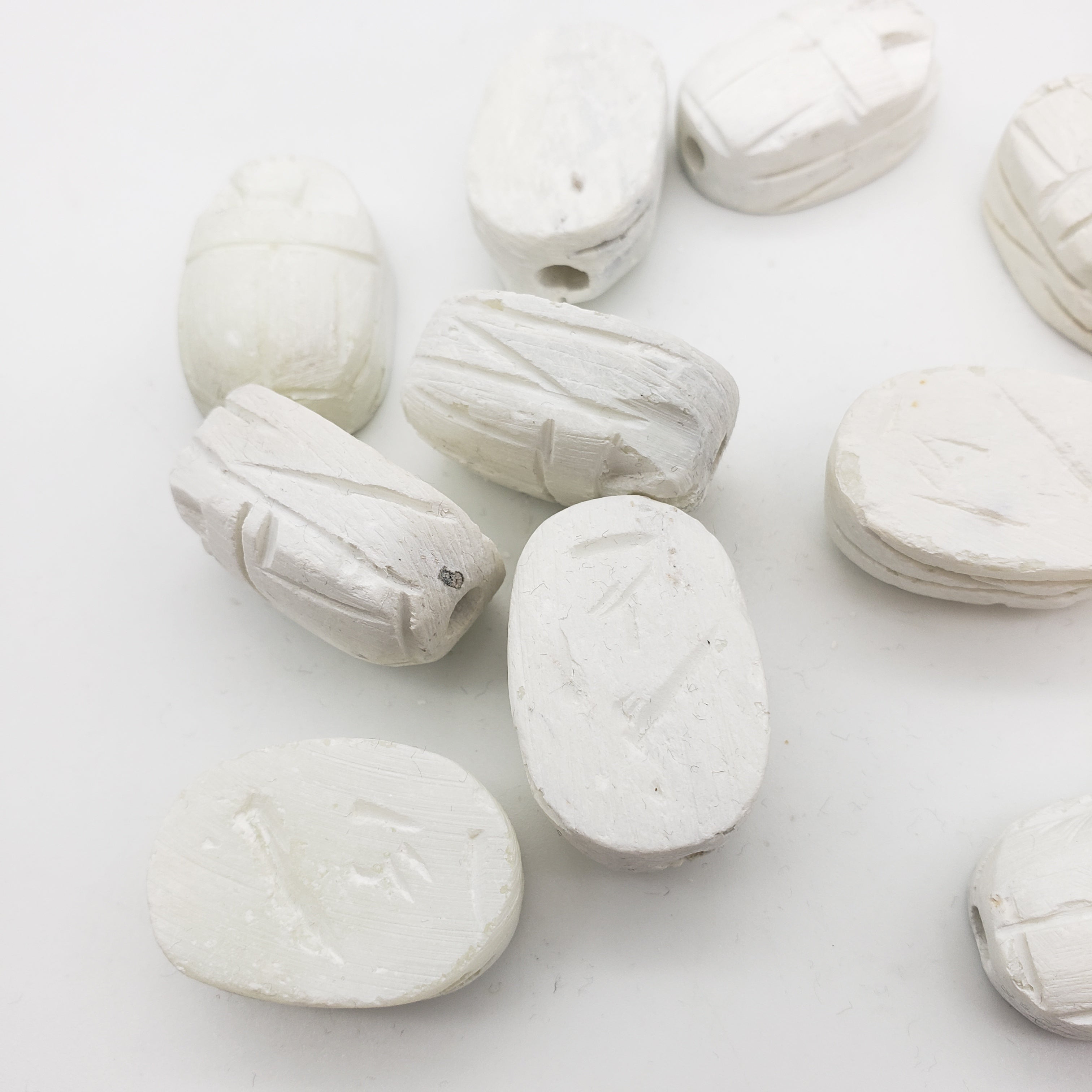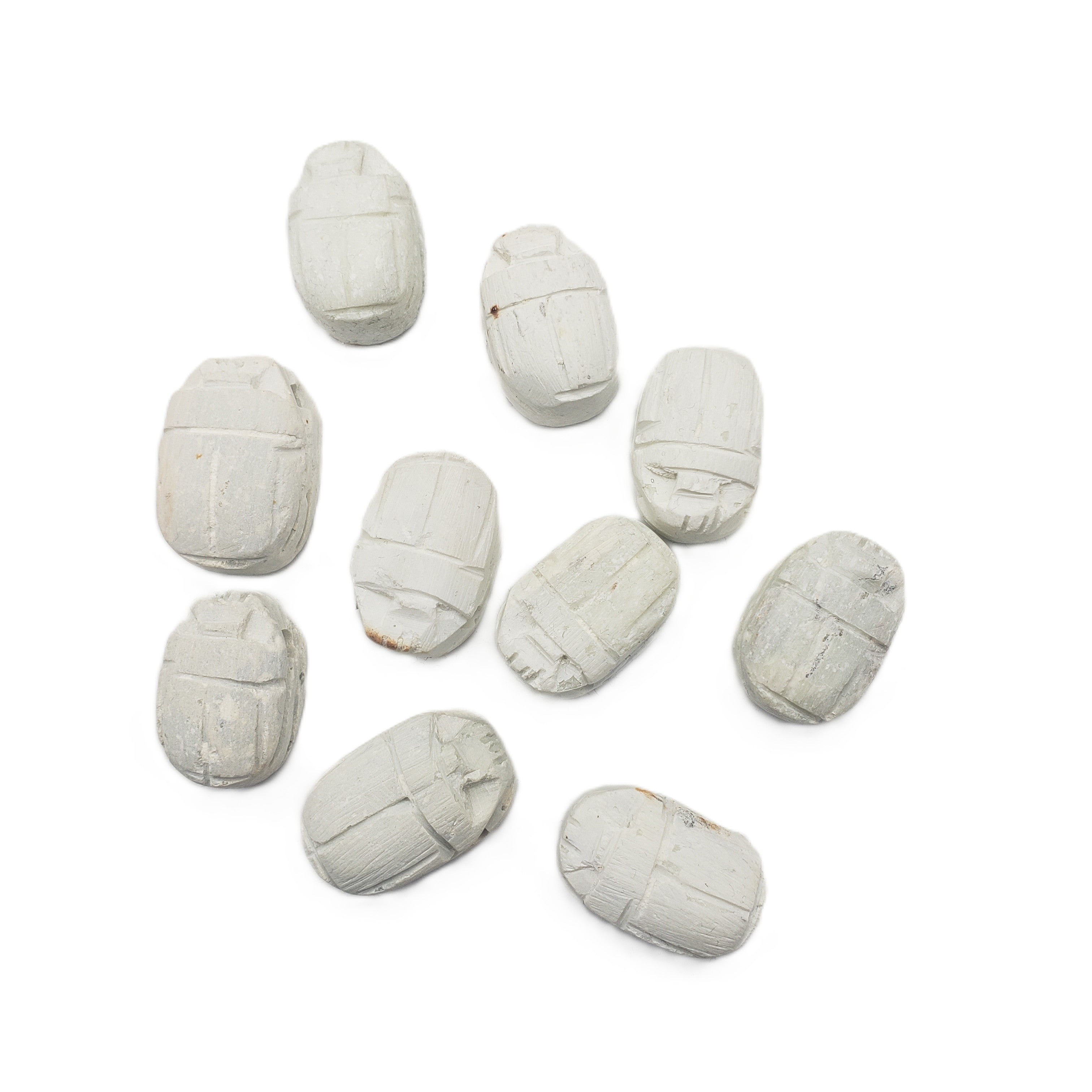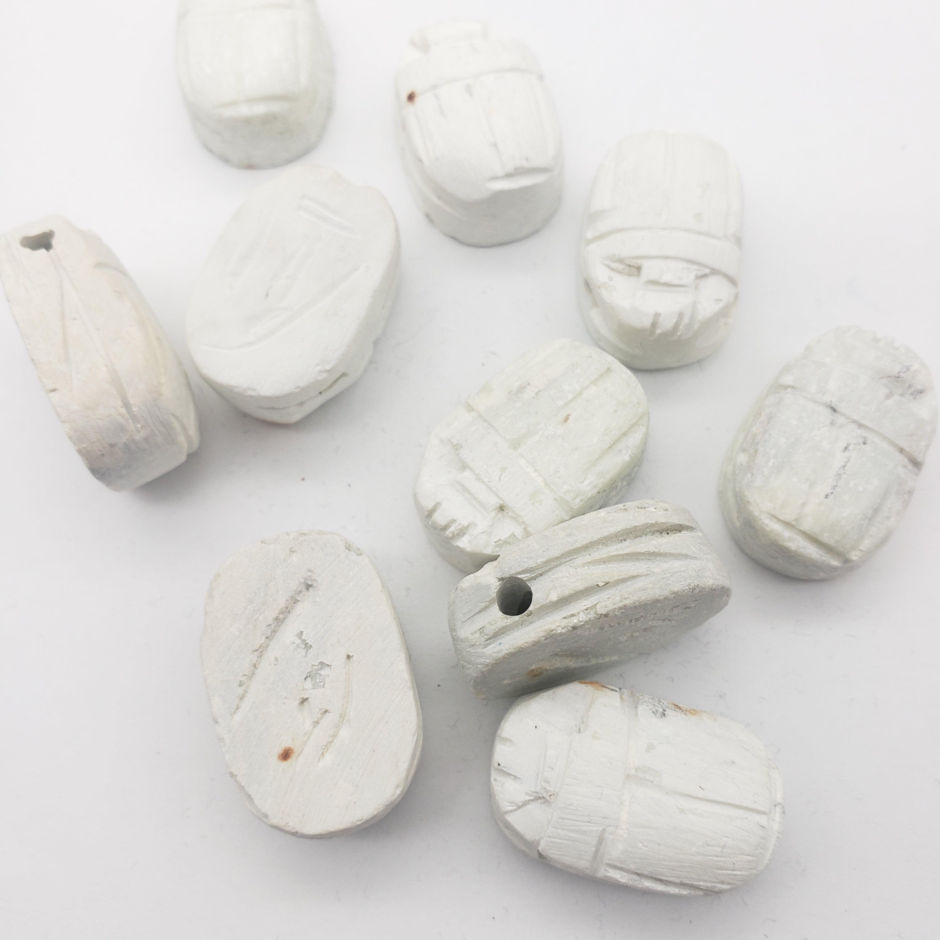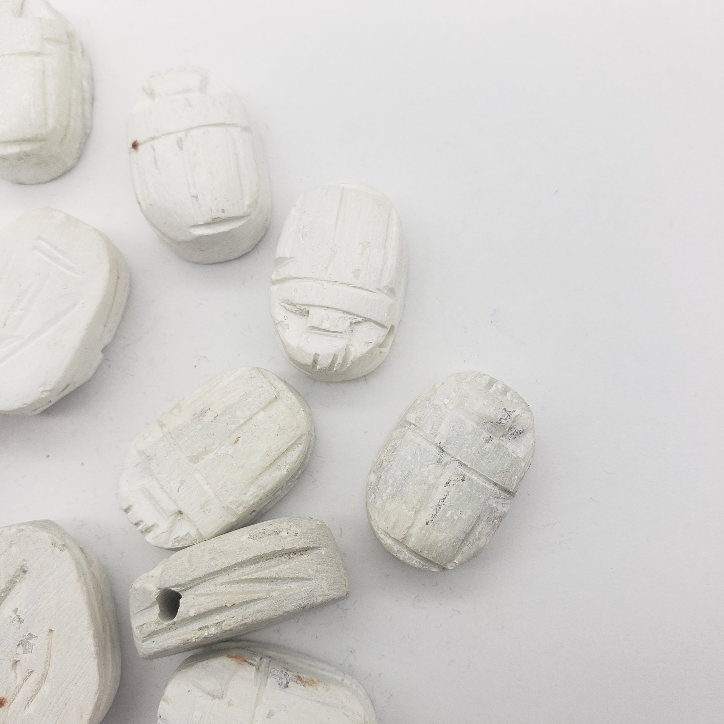 The ancient Egyptians believed that the scarab was the earthly manifestation of the god Khepri, and pushed the sun across the sky each day, only to disappear and magically re-appear the next morning. As such, it is a powerful amulet for self-creation, transformation, and rebirth. They were worn or carried by the living, and also buried with the dead to help them on their way to the afterlife. The base was usually inscribed with designs or hieroglyphs to form an impression seal.