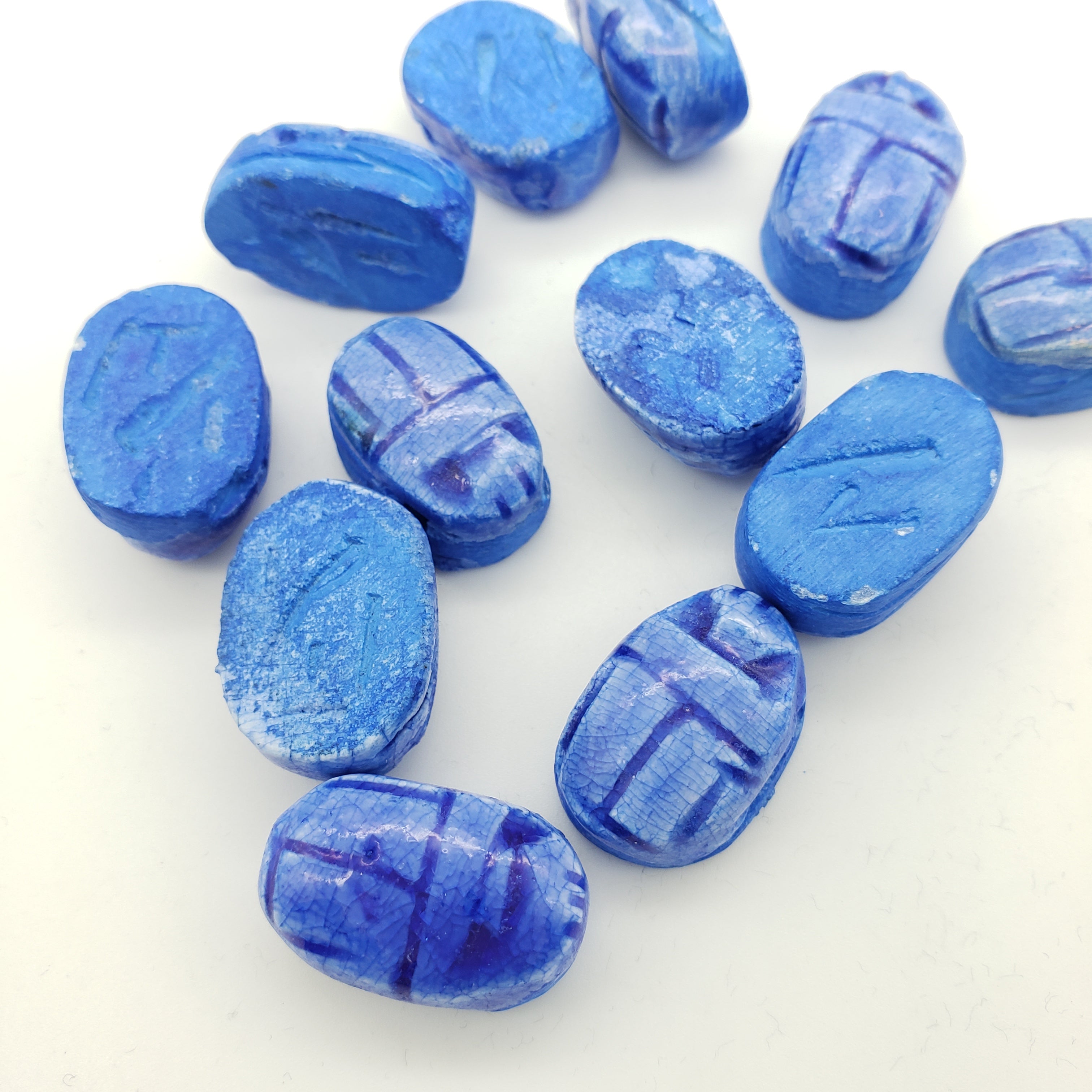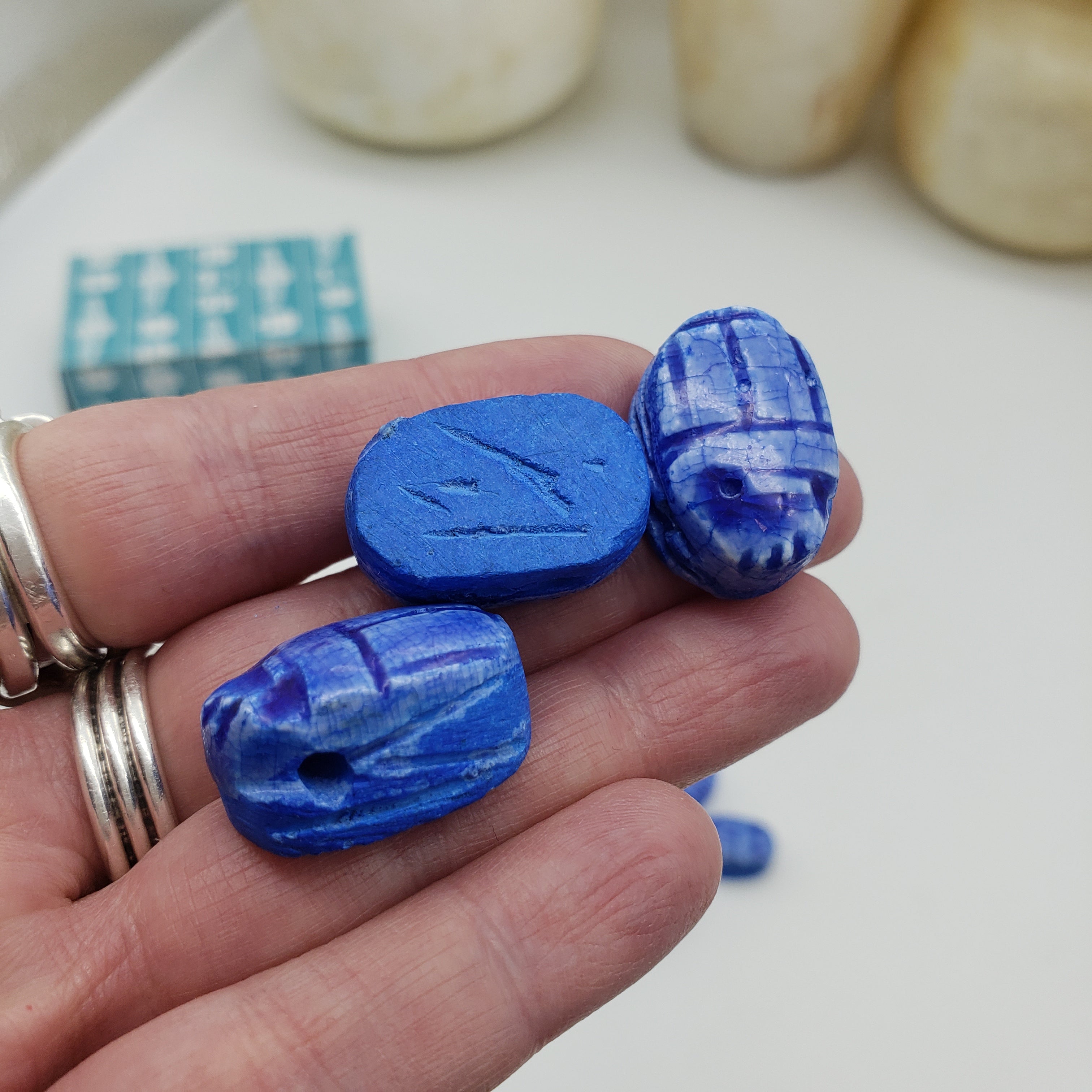 The ancient Egyptians believed that the scarab was the earthly manifestation of the god Khepri, and pushed the sun across the sky each day, only to disappear and magically re-appear the next morning. As such, it is a powerful amulet for self-creation, transformation, and rebirth. They were worn or carried by the living, and also buried with the dead to help them on their way to the afterlife. The base was usually inscribed with designs or hieroglyphs to form an impression seal.