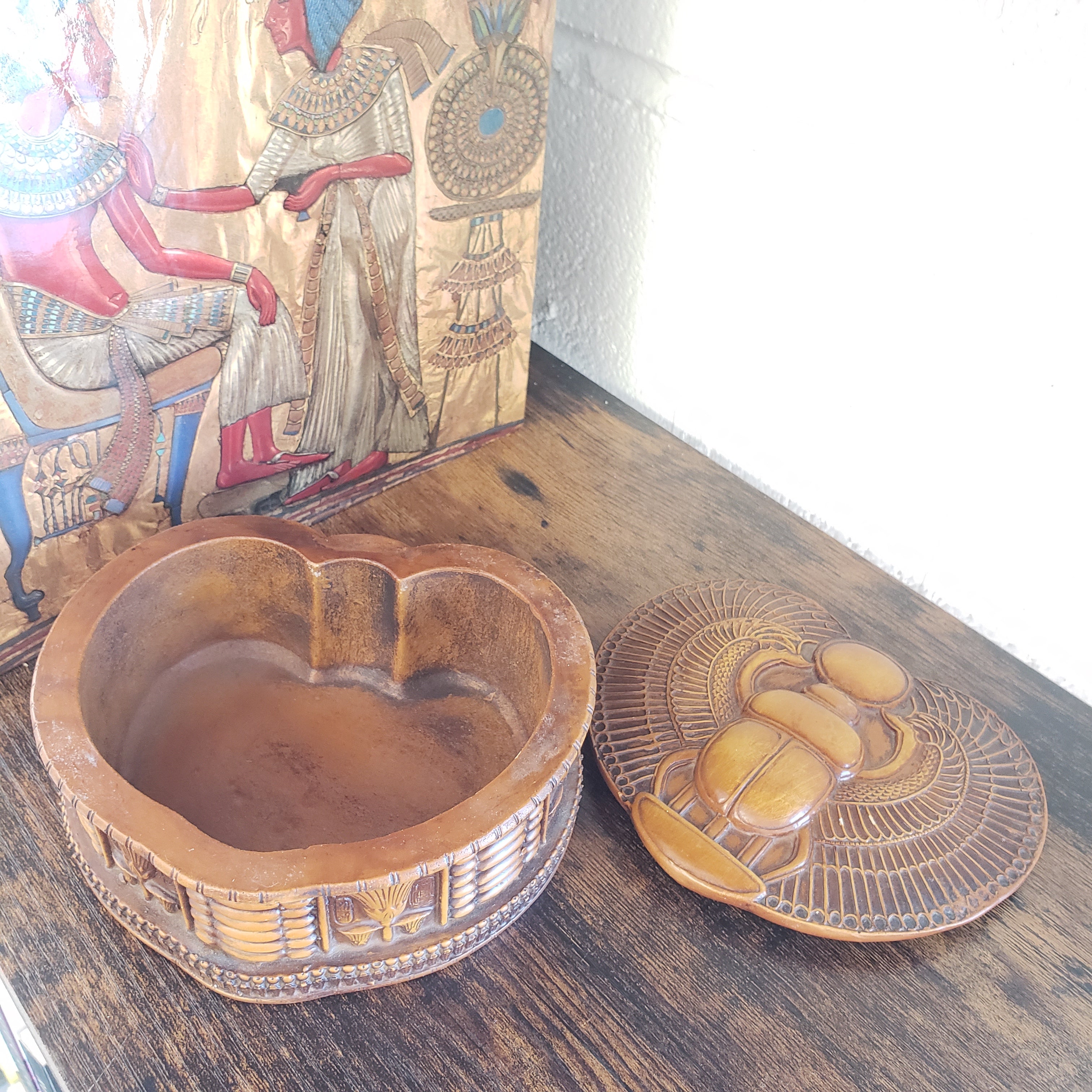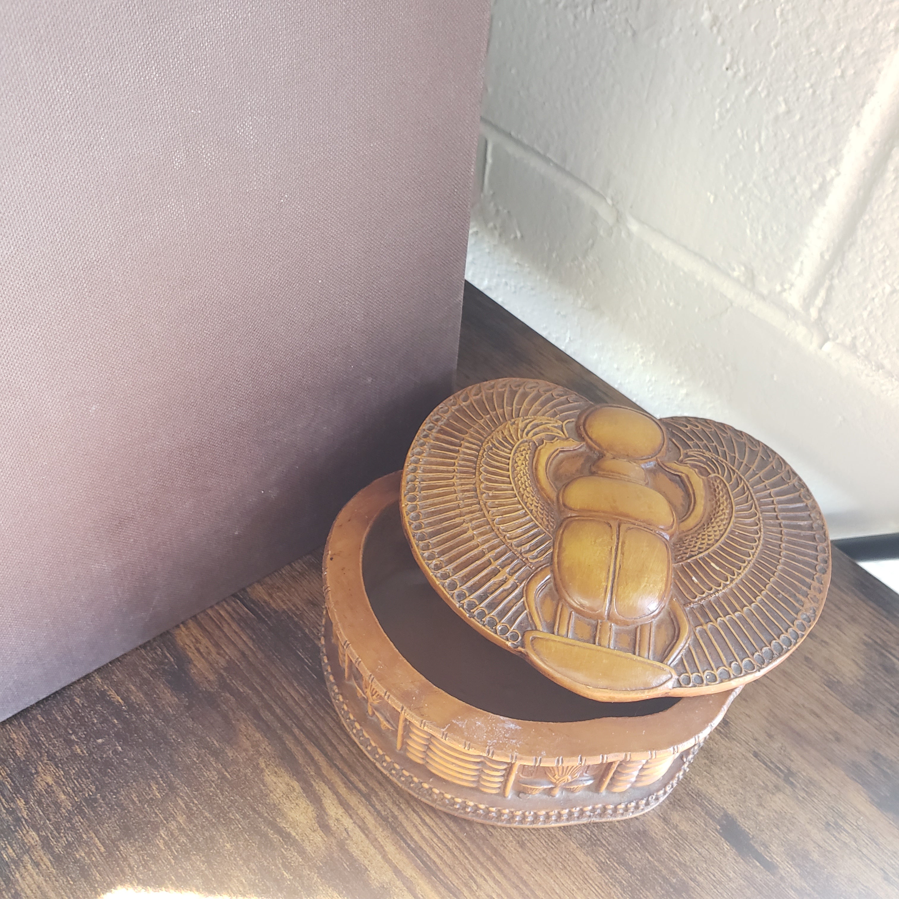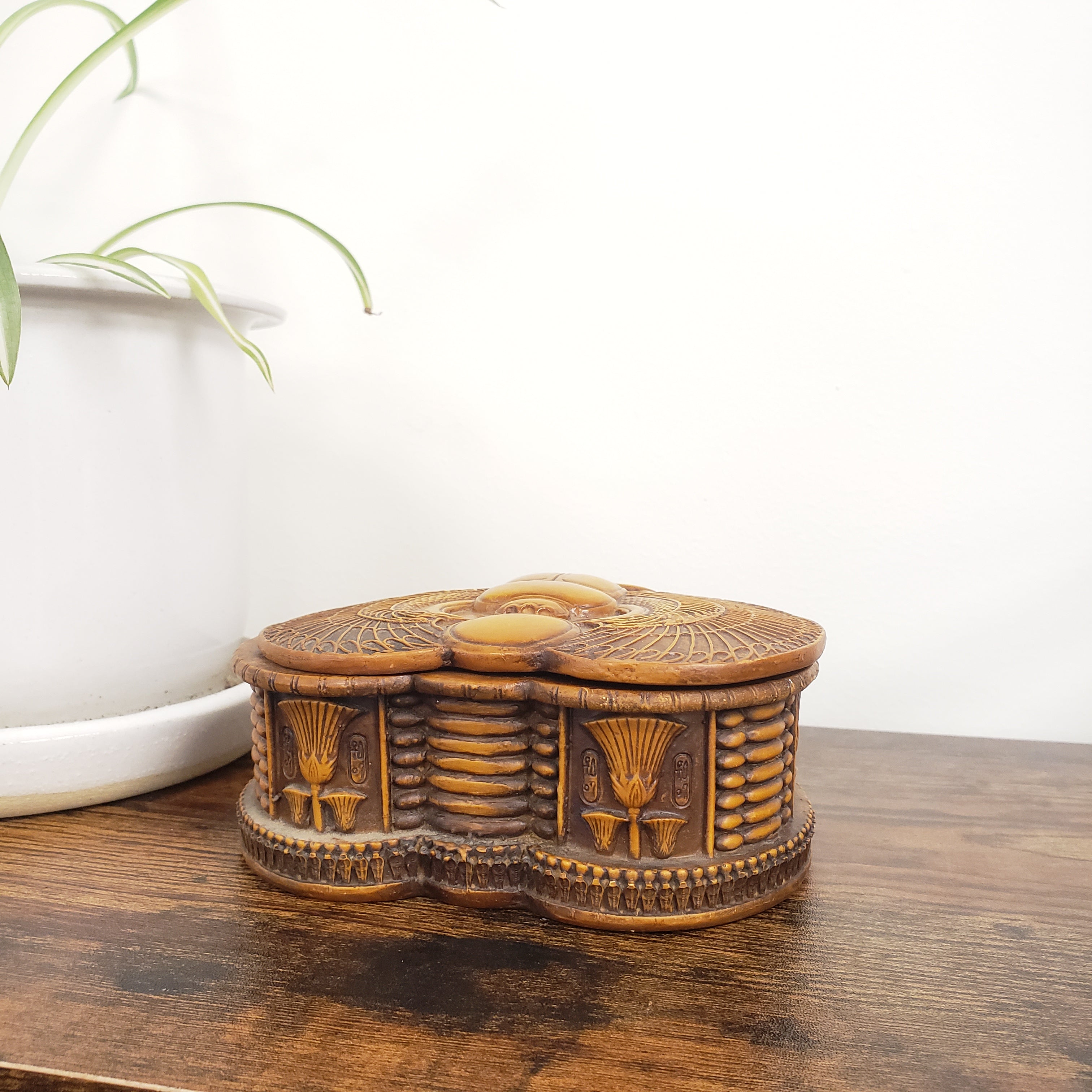 This beautiful handmade box features the Egyptian winged scarab and sun disk. It is quite sturdy and made from polymer with a hand painted finish. Made in Egypt! This 2-inch-tall box has a depth of 1.5 inches - great for storing your jewelry or trinkets! The box lid sits loosely on the top. Intricately carved into the sides are lotus flowers and hieroglyphs.