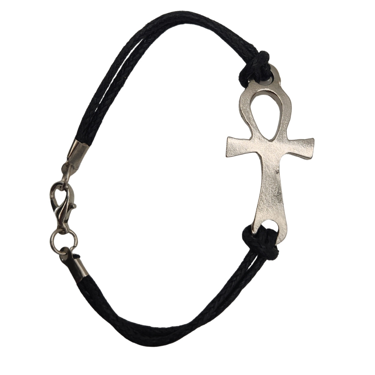 The Ankh is the hieroglyphic symbol for life. This pewter bracelet is on a faux leather cord. The bracelet length is 8 inches long with a lobster claw closure.