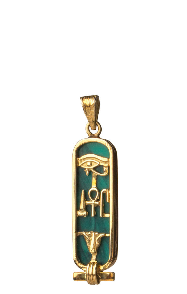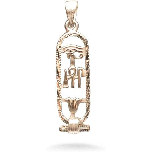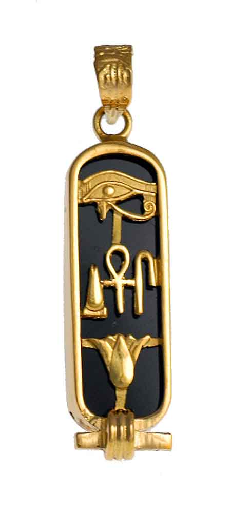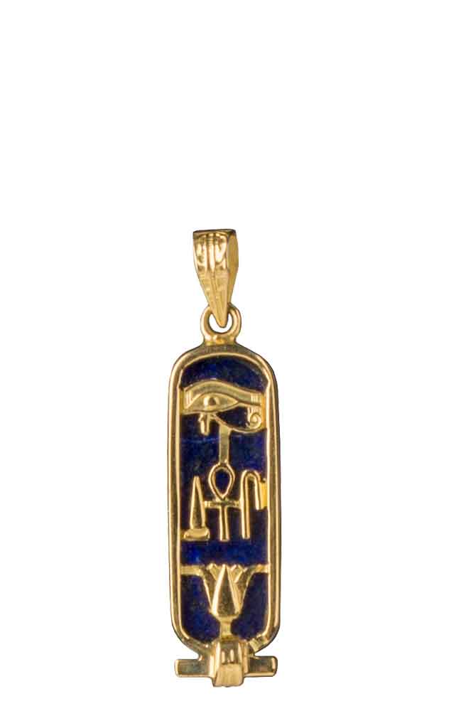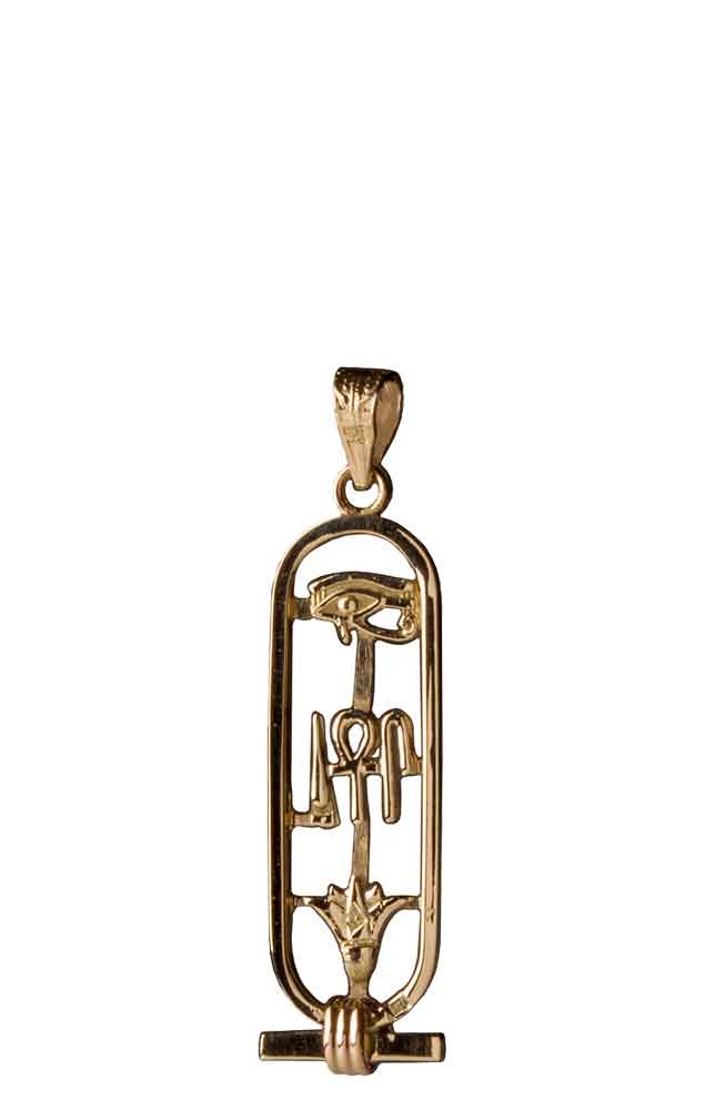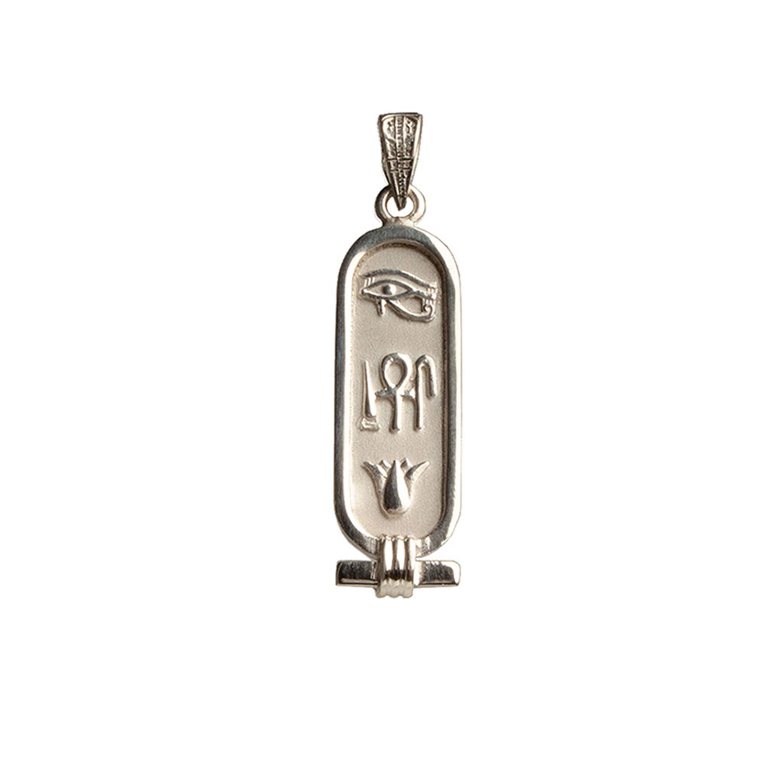 This cartouche features the three hieroglyphic symbols for 'Health, Life, & Happiness.' The Eye of Horus at the top is a healing symbol. It symbolizes protection for the wearer and their strength. In the middle are ancient symbols that represent health, life, and happiness. The bottom is the lotus flower, symbolizing rebirth and rejuvenation. In Egyptian mythology, the sun was born from a lotus.
